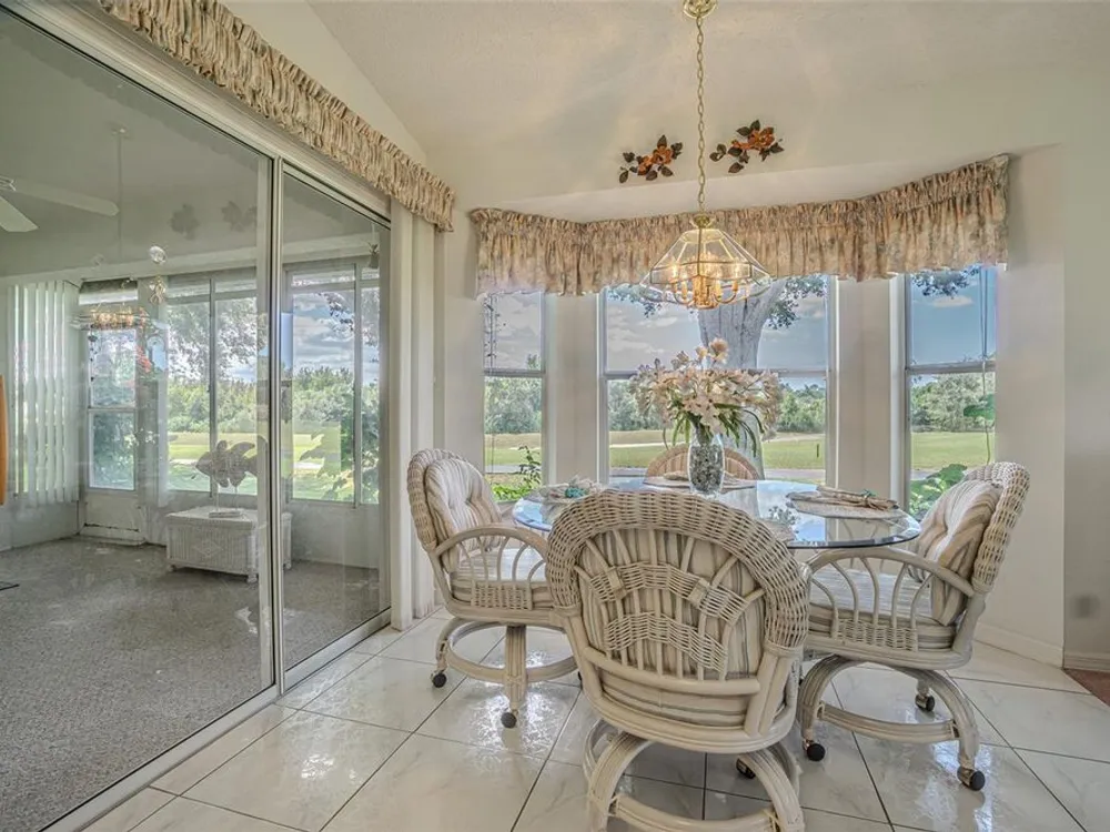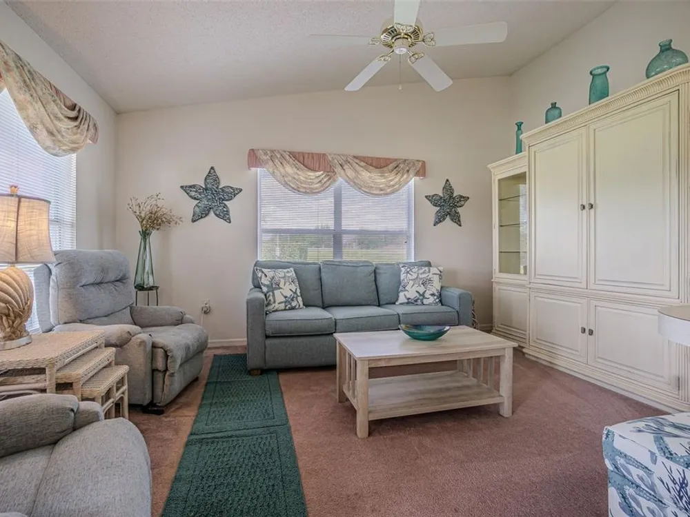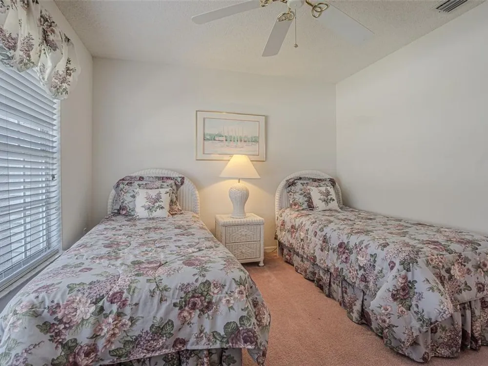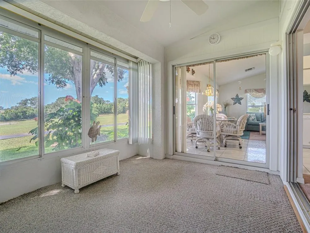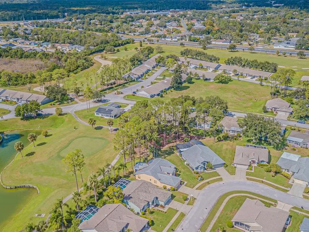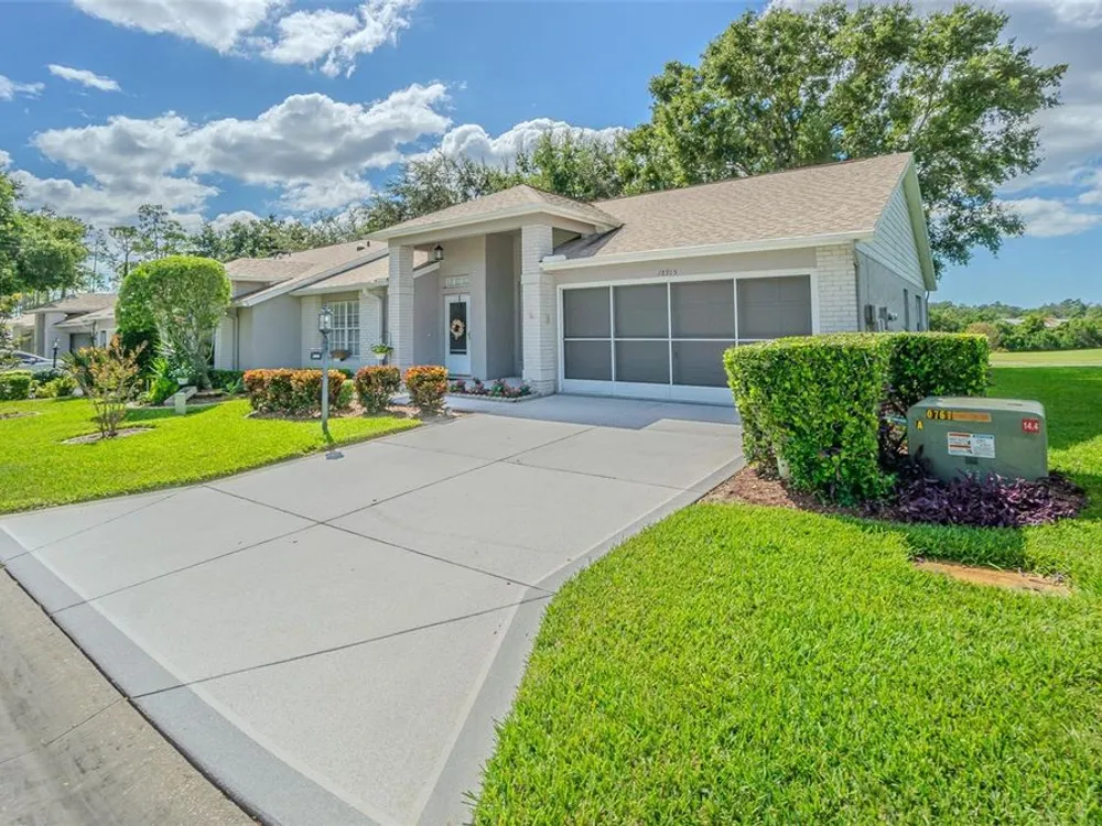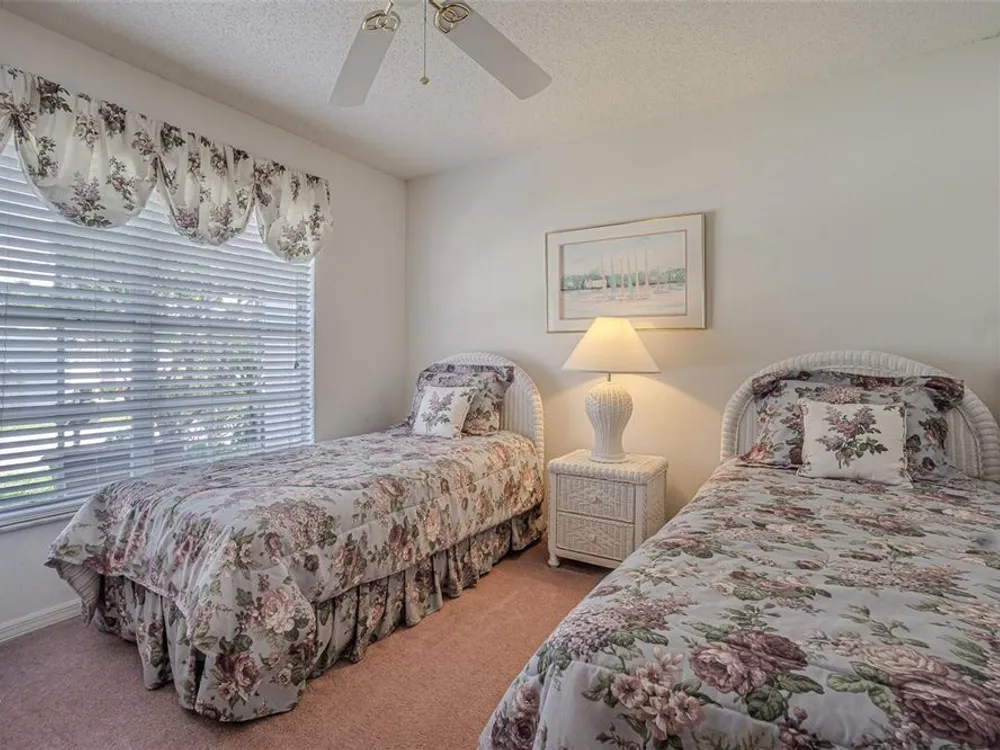 Beautiful Golf Course Villa in Heritage Pines – Fully Furnished & Move-In Ready! Immaculate end-unit villa located on the 6th hole of the Heritage Pines Golf Course. This spacious home offers a 2-car garage plus convenient cul-de-sac guest parking. Sold completely furnished and in exceptional condition, it’s one of the larger floor plans available. Enjoy an open, dine-in kitchen adjoining a comfortable family room—both with stunning golf course views. The dining area easily accommodates an 8-person table and flows seamlessly into the living room for easy entertaining. The primary suite overlooks the golf course and features a large walk-in closet and private bath with a walk-in shower. The guest bedroom offers plenty of space for two twin beds or a queen/king setup, with a second full bath nearby. The laundry room is well-equipped with Maytag appliances, a utility sink, and upper cabinetry. Ceiling fans are found throughout—in both bedrooms, the den, and the living room. The screened lanai opens wide to the main living area through double sliding glass doors, offering a perfect place to relax and enjoy the view. The HOA covers lawn maintenance, cable, internet, and pest control—ideal for a low-maintenance “lock-and-leave” lifestyle. Heritage Pines is a premier 55+ gated community with 24-hour security, an active country club, heated pool, tennis and pickleball courts, and an on-site restaurant offering weekly features and events. Furniture inventory, survey, and all home-related documents are available for review. Bonus- this 6th hole is the only one where you can see golfers tee of and putt!