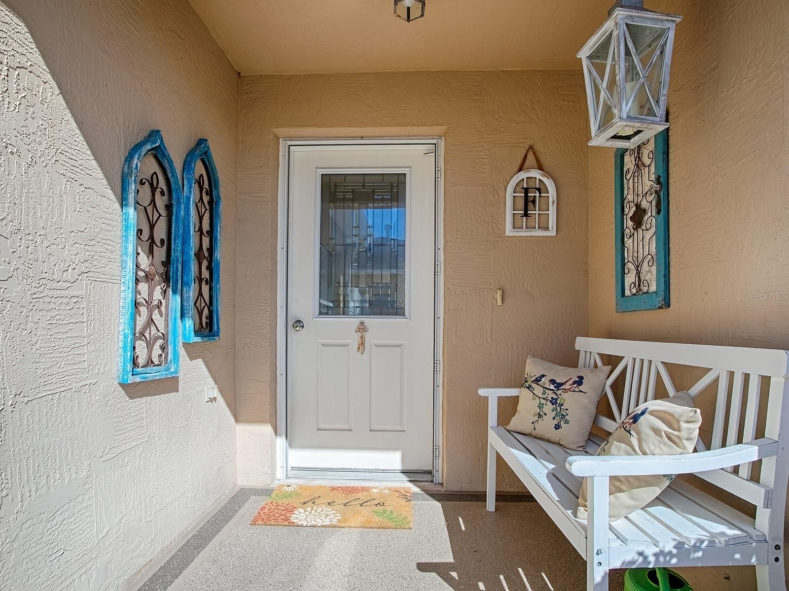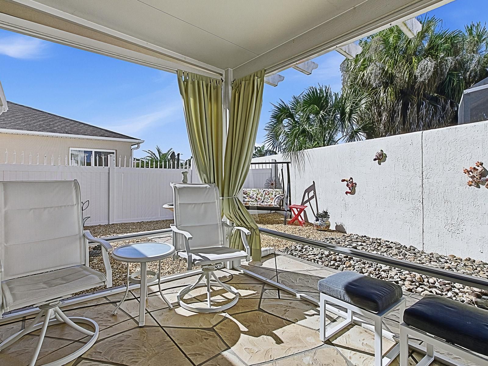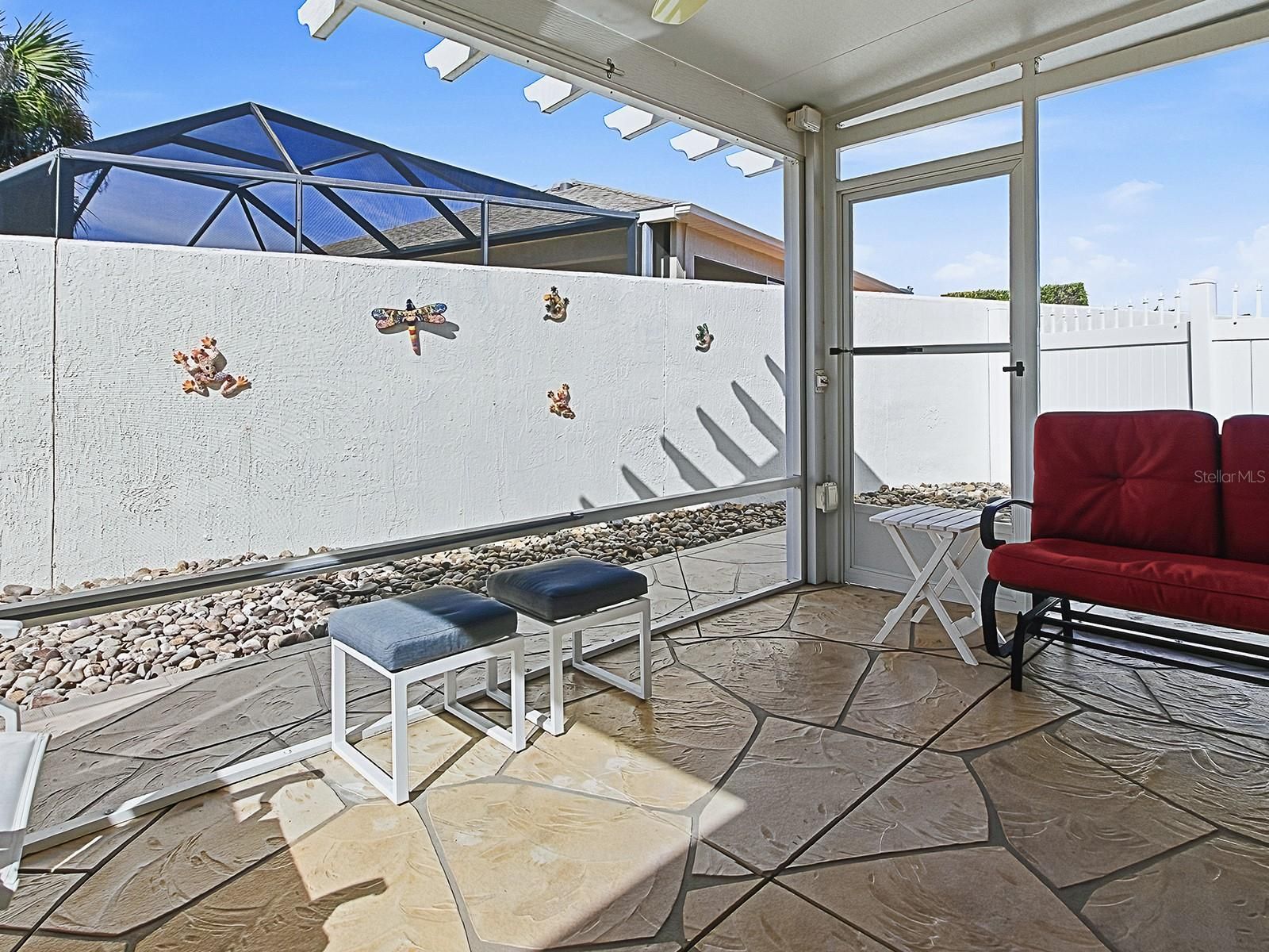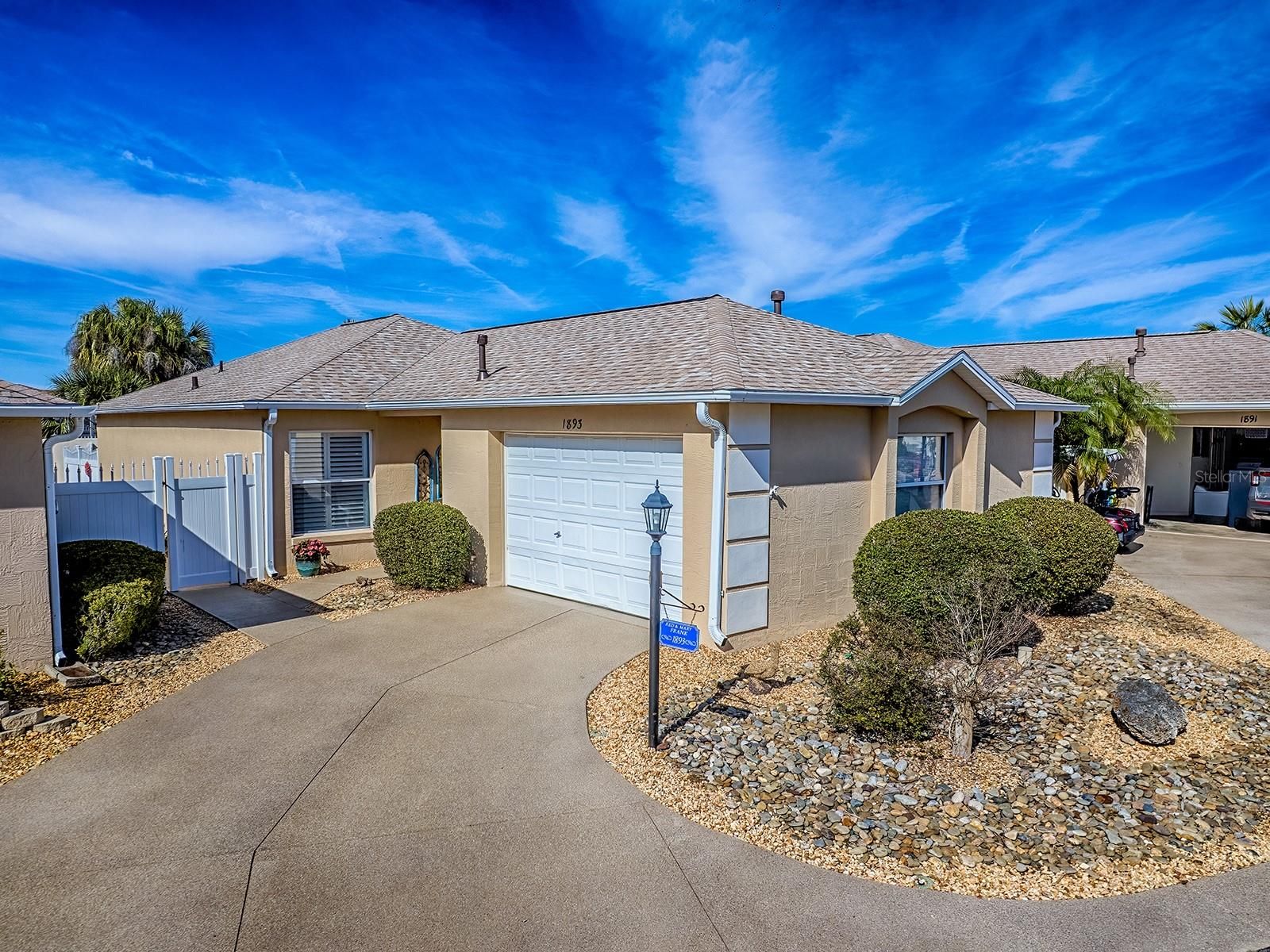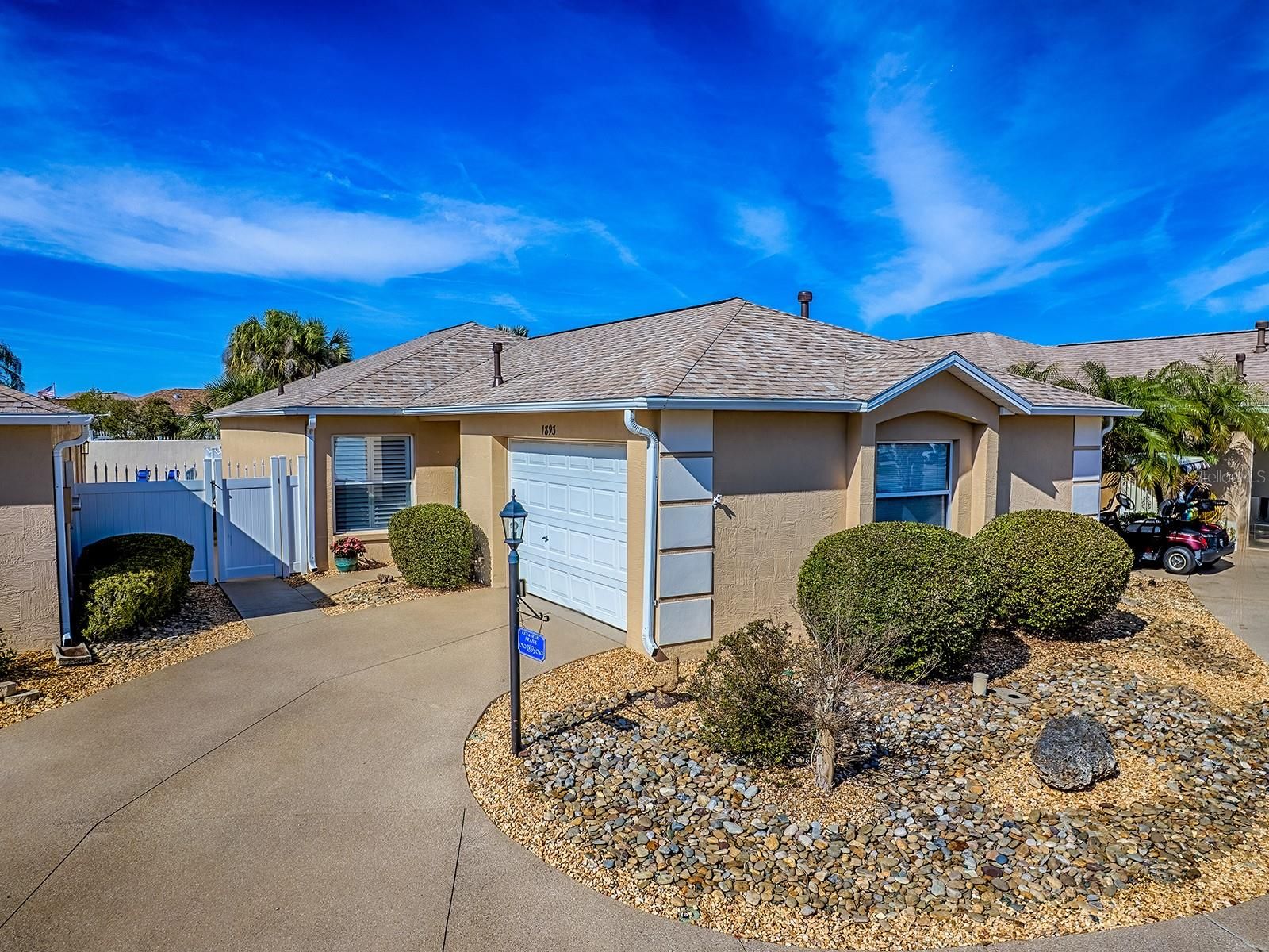 Imagine waking up each morning in The Villages, a vibrant 55+ community where life is as leisurely or as active as you choose. Located within the sought-after locale of Belle Aire is a Woodlawn villa that stands as a hidden treasure, waiting to become your next home. Picture yourself stepping into the bright and airy living space, where a beautifully furnished screened lanai with a stamped concrete floor seamlessly extends into a charming back courtyard adorned with lovely rock landscaping. This picturesque setting invites you to relish in the ultimate backyard experience, sipping your morning coffee or winding down under the stars enveloped by the serenity of your own private oasis. This meticulously maintained courtyard villa not only boasts a Bond Paid status but also has been thoughtfully updated to ensure comfort and style. As you traverse through the home, tile, LVP and laminate wood flooring is found, complementing the open floor plan and soaring vaulted ceilings. These features not only amplify the sense of space but also create an inviting atmosphere perfect for unwinding or hosting family and friends. The smartly designed split-bedroom layout allows for harmonious living, enabling you and your guests to enjoy shared moments while still offering privacy when desired. The original lanai has been transformed and raised, seamlessly integrating into the living area with a chic barn door. This versatile space is perfect for setting up a cozy office, pursuing hobbies, or crafting an entertainment nook. Your convenience is prioritized with a garage that accommodates golf cart parking and ample storage. A brand new 2024 roof ensures peace of mind, while the coated driveway and entry offer great curb appeal that is hard to resist. Safety and luxury intertwine with an upgraded smoke/carbon monoxide detection system and top-of-the-line plantation shutters adorned with wood cornices. The kitchen dazzles with upgraded cabinets, stainless steel appliances, an open counter, and a decorative tile backsplash. The bathrooms mirror this attention to detail, featuring redone vanities and a newly installed, low-maintenance shower in the primary bath. The Villages community enriches your lifestyle with an array of amenities and activities. Imagine spending your days playing golf, indulging in recreation at the nearby centers, savoring local dining experiences, and engaging in a variety of hobbies. Forge long-lasting friendships at lively community events, knowing that this charming villa with its splendid updates and serene courtyard retreat is truly a rare find. For those seeking an inviting, move-in-ready property in this desirable community, the opportunity is now. Embrace the essence of The Villages and begin your next chapter in this enchanting villa.
