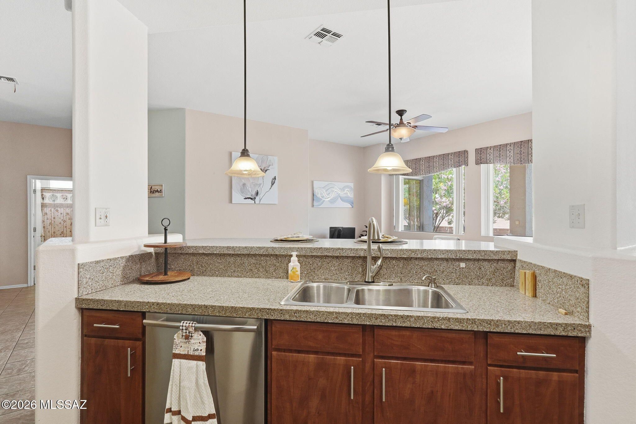 Welcome to this charming, cottage feeling 2-bedroom, 2-bath home located in the 55+ community of Green Valley. This home offers tile flooring throughout the main living areas and soft carpeting in the primary suite. The kitchen shines with granite countertops, stainless steel appliances, and a contemporary backsplash. The spacious primary bedroom includes a private en-suite with dual vanities and shower, plus a large walk-in closet. A sizable laundry room with built-in shelving provides excellent storage space. Step outside to the tranquil covered patio surrounded by blooming vegetation in bright pink, yellow and red shades. Conveniently located near GVR centers and golf courses, this home offers the perfect blend of comfort, convenience, and peaceful retirement living.