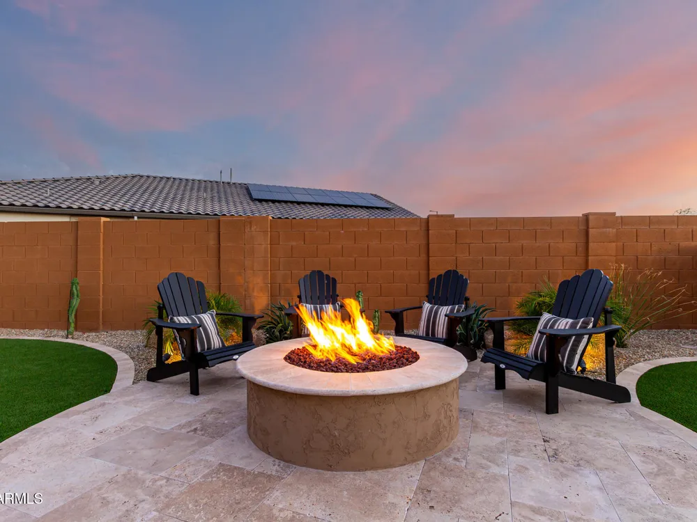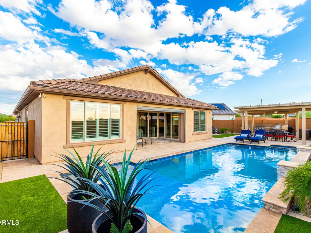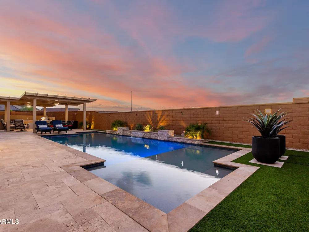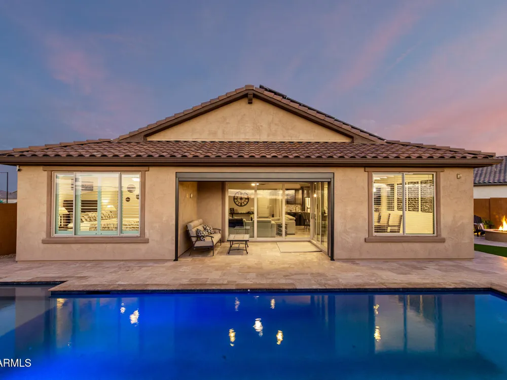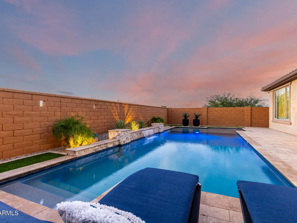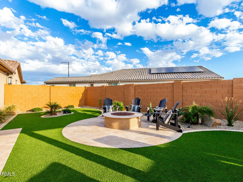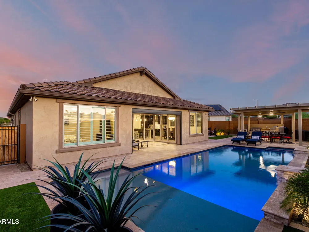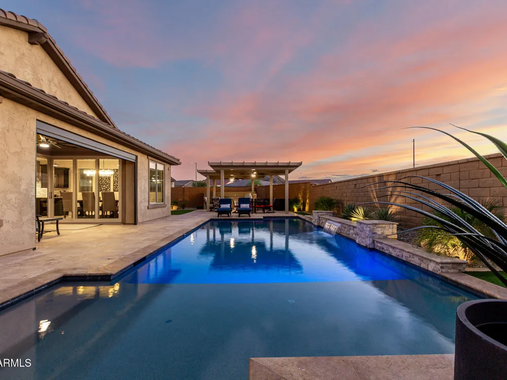 Welcome to this gorgeous one-level lightly lived home in the vibrant Sun City Festival community. Private oasis w/ stunning sunsets & mountain views. Heated pool w/ waterfall feature, BBQ, Solid Pergola w/fans, Fire-pit & turf. Inside, you'll find elegant tile floors & spacious den perfect for a home office or cozy reading nook. Great room invites you to entertain w/ ease, flowing beautifully into the sleek kitchen featuring stainless steel appliances, wall oven, tile backsplash, rich wood cabinetry, spacious walk-in pantry, and a center island w/ a breakfast bar for casual dining. Dining area & open corner patio door with backyard views. Retreat to the serene main bedroom w/ dual vanities, soaking tub, shower, walk-in closet. Laundry room w/ sink, W & D inc. Spacious garage & Owned Solar Outdoor living is a dream, where you can host unforgettable gatherings under the covered patio, around the firepit, or beneath the gazebo. Fire up the built-in BBQ, take a dip in the sparkling pool with soothing water features, and enjoy the resort-style lifestyle you deserve. This beauty truly has it all!