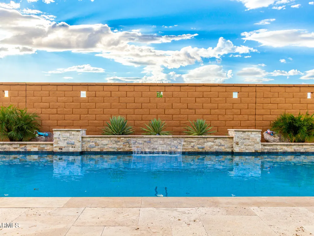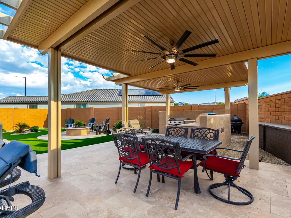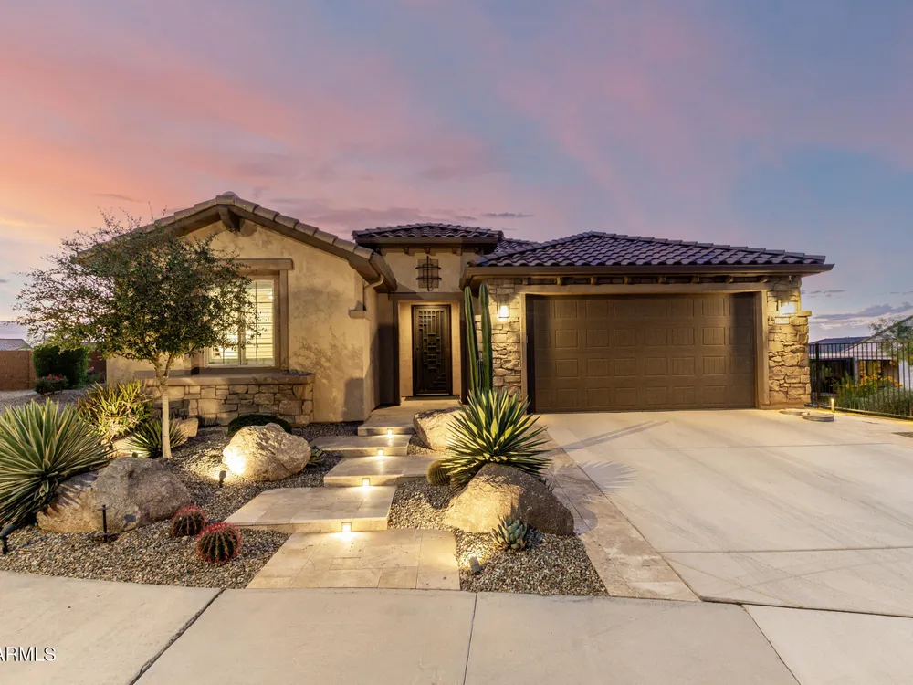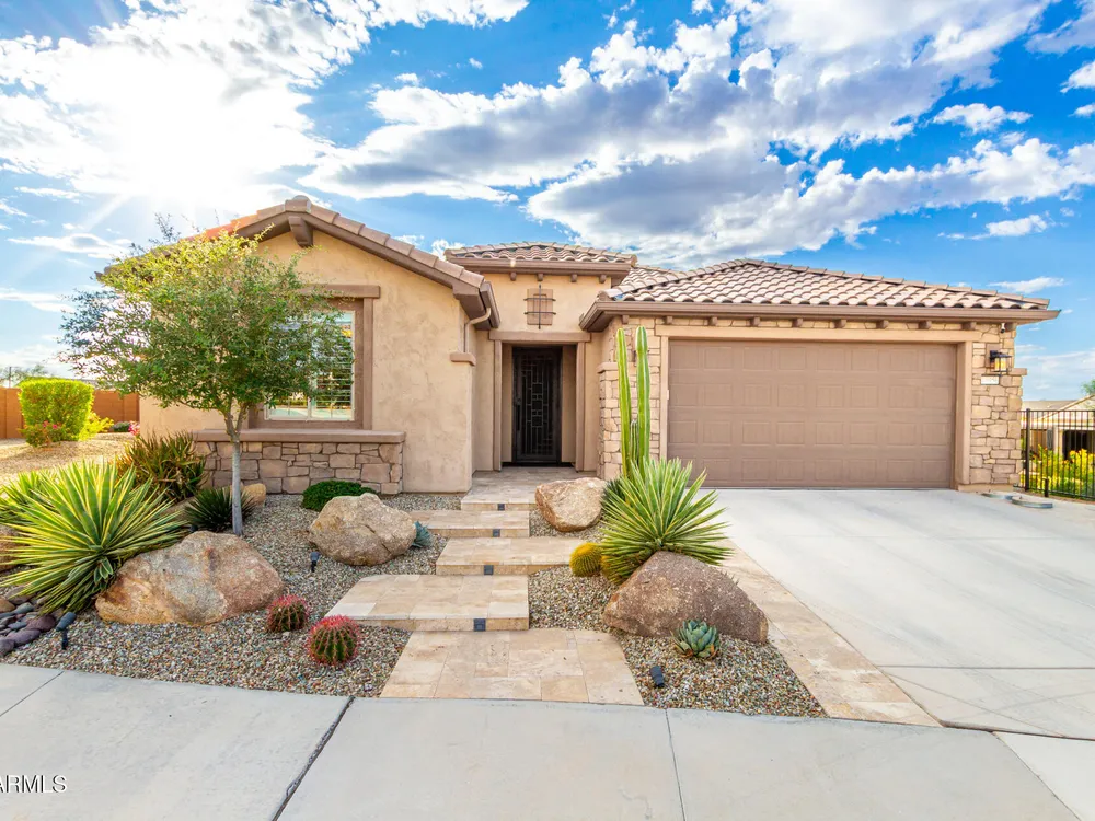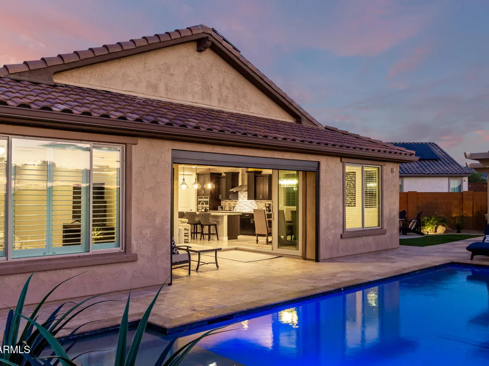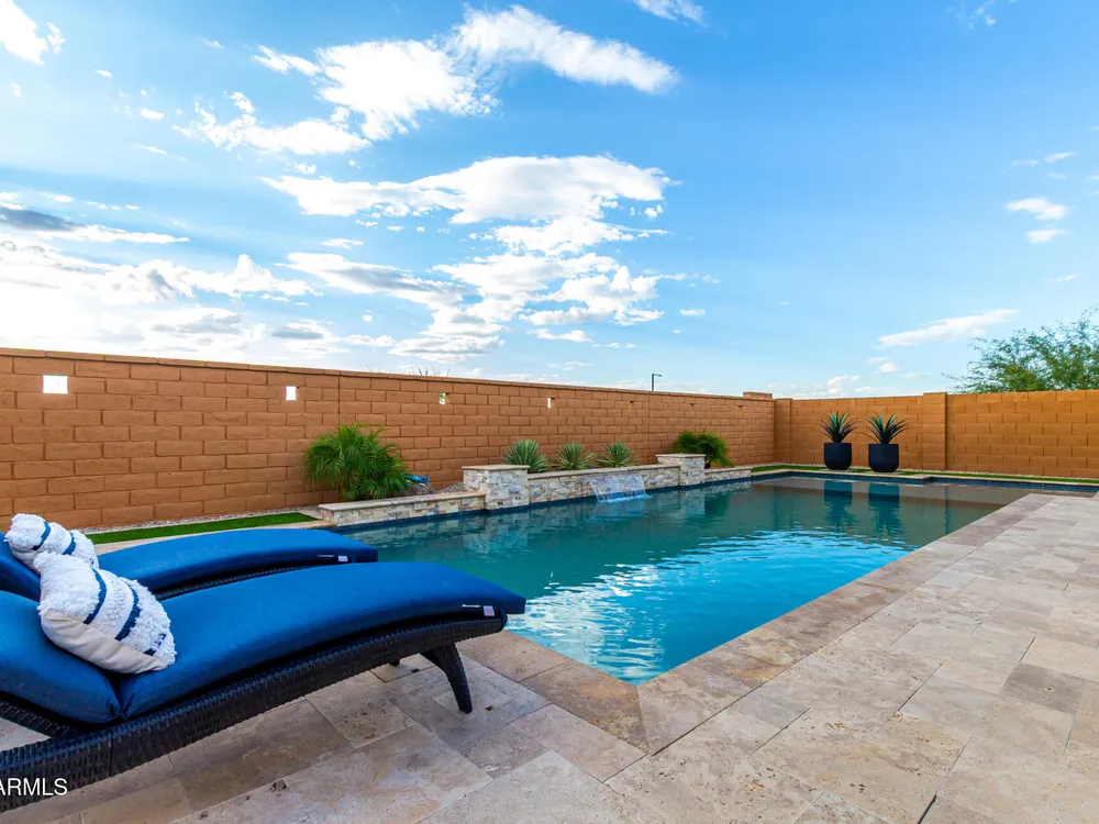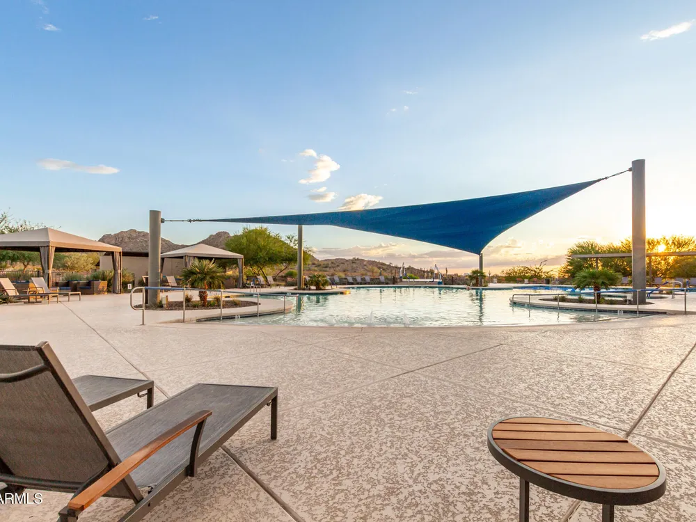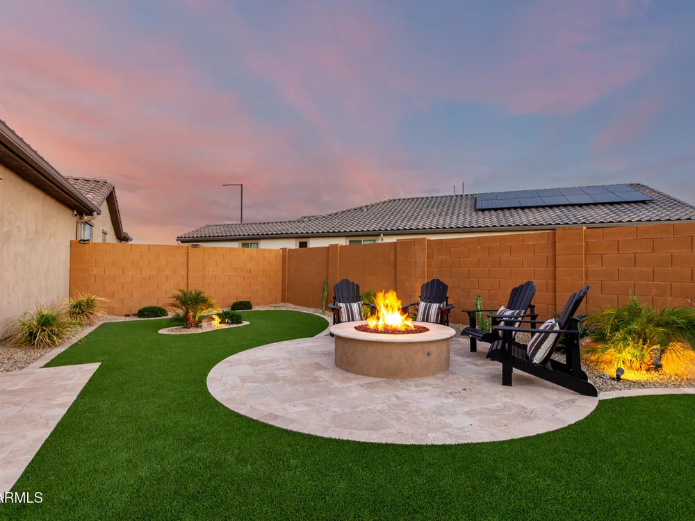 Welcome to this gorgeous one-level lightly lived home in the vibrant Sun City Festival community. Private oasis w/ stunning sunsets & mountain views. Heated pool w/ waterfall feature, BBQ, Solid Pergola w/fans, Fire-pit & turf. Inside, you'll find elegant tile floors & spacious den perfect for a home office or cozy reading nook. Great room invites you to entertain w/ ease, flowing beautifully into the sleek kitchen featuring stainless steel appliances, wall oven, tile backsplash, rich wood cabinetry, spacious walk-in pantry, and a center island w/ a breakfast bar for casual dining. Dining area & open corner patio door with backyard views. Retreat to the serene main bedroom w/ dual vanities, soaking tub, shower, walk-in closet. Laundry room w/ sink, W & D inc. Spacious garage & Owned Solar Outdoor living is a dream, where you can host unforgettable gatherings under the covered patio, around the firepit, or beneath the gazebo. Fire up the built-in BBQ, take a dip in the sparkling pool with soothing water features, and enjoy the resort-style lifestyle you deserve. This beauty truly has it all!