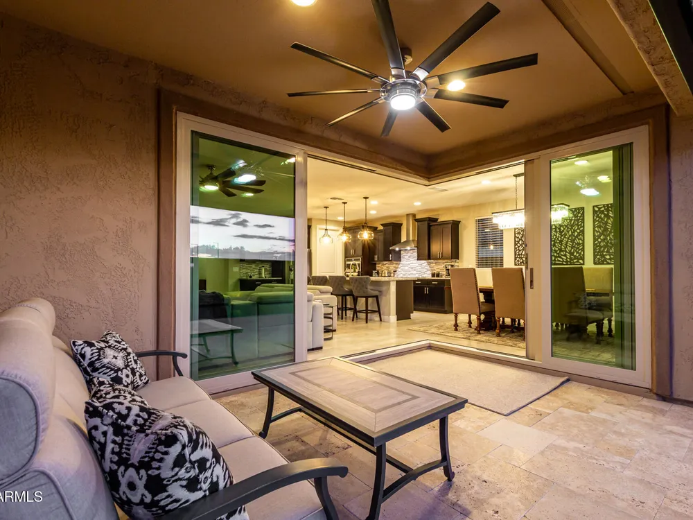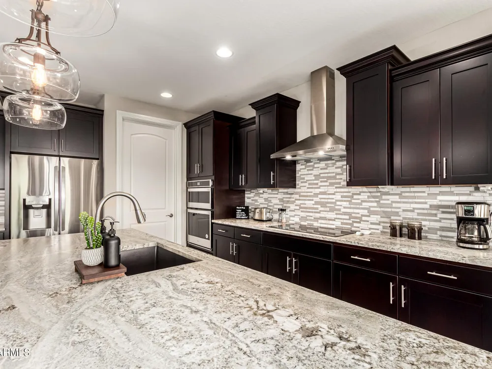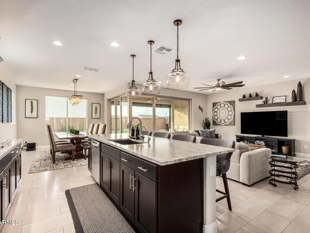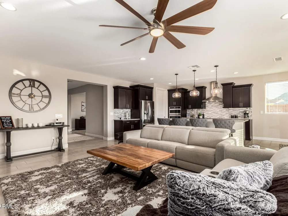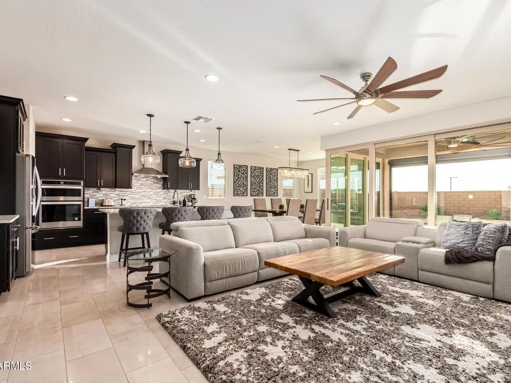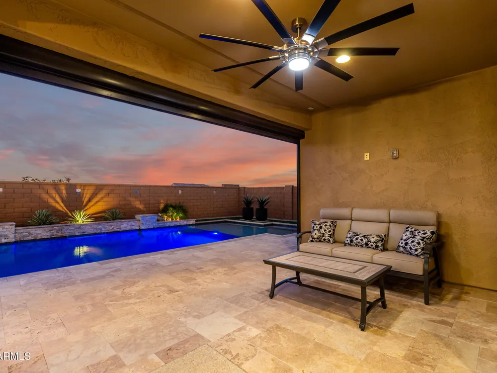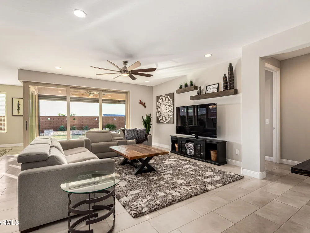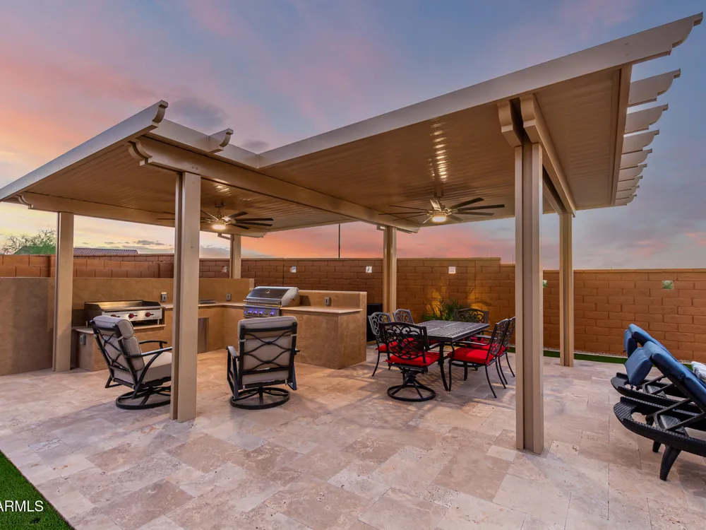 Welcome to this gorgeous one-level lightly lived home in the vibrant Sun City Festival community. Private oasis w/ stunning sunsets & mountain views. Heated pool w/ waterfall feature, BBQ, Solid Pergola w/fans, Fire-pit & turf. Inside, you'll find elegant tile floors & spacious den perfect for a home office or cozy reading nook. Great room invites you to entertain w/ ease, flowing beautifully into the sleek kitchen featuring stainless steel appliances, wall oven, tile backsplash, rich wood cabinetry, spacious walk-in pantry, and a center island w/ a breakfast bar for casual dining. Dining area & open corner patio door with backyard views. Retreat to the serene main bedroom w/ dual vanities, soaking tub, shower, walk-in closet. Laundry room w/ sink, W & D inc. Spacious garage & Owned Solar Outdoor living is a dream, where you can host unforgettable gatherings under the covered patio, around the firepit, or beneath the gazebo. Fire up the built-in BBQ, take a dip in the sparkling pool with soothing water features, and enjoy the resort-style lifestyle you deserve. This beauty truly has it all!