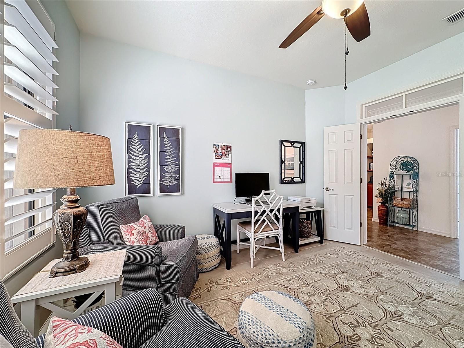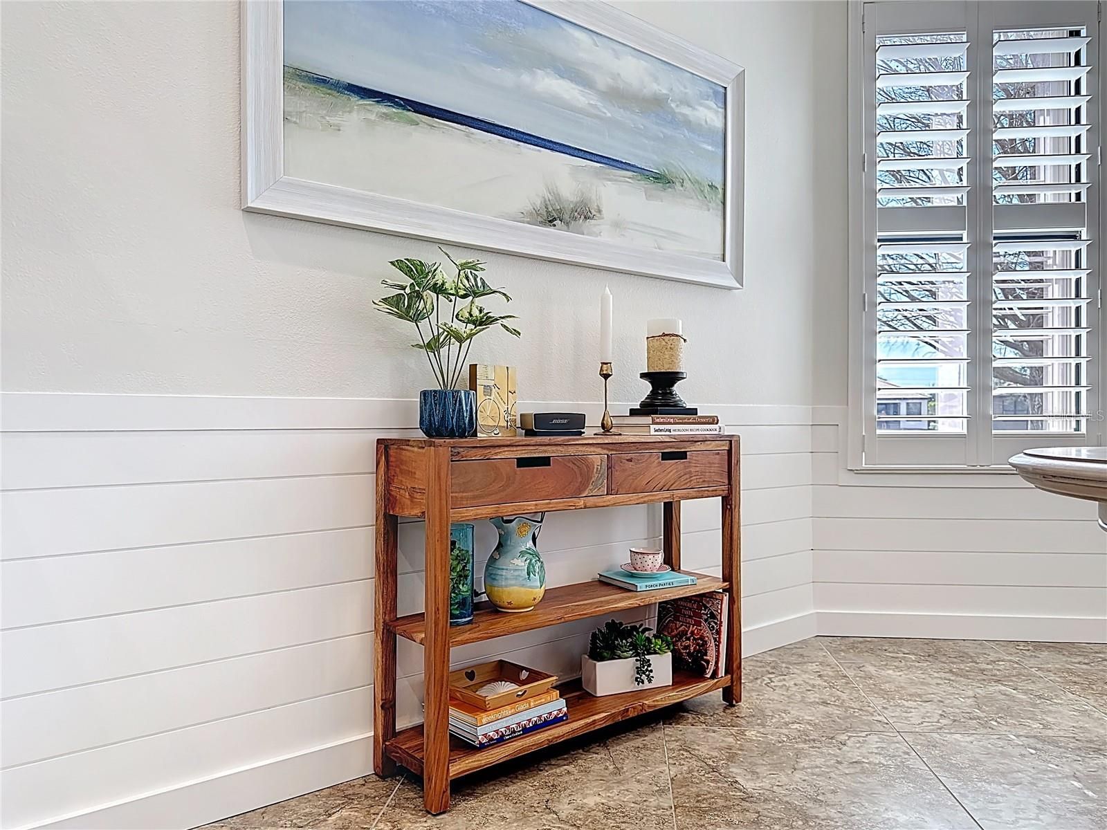 - Built-in Features, Ceiling Fan(s), Eat-in Kitchen, High Ceilings, Open Floorplan, Main Level Primary, Stone Counters, Window Treatments