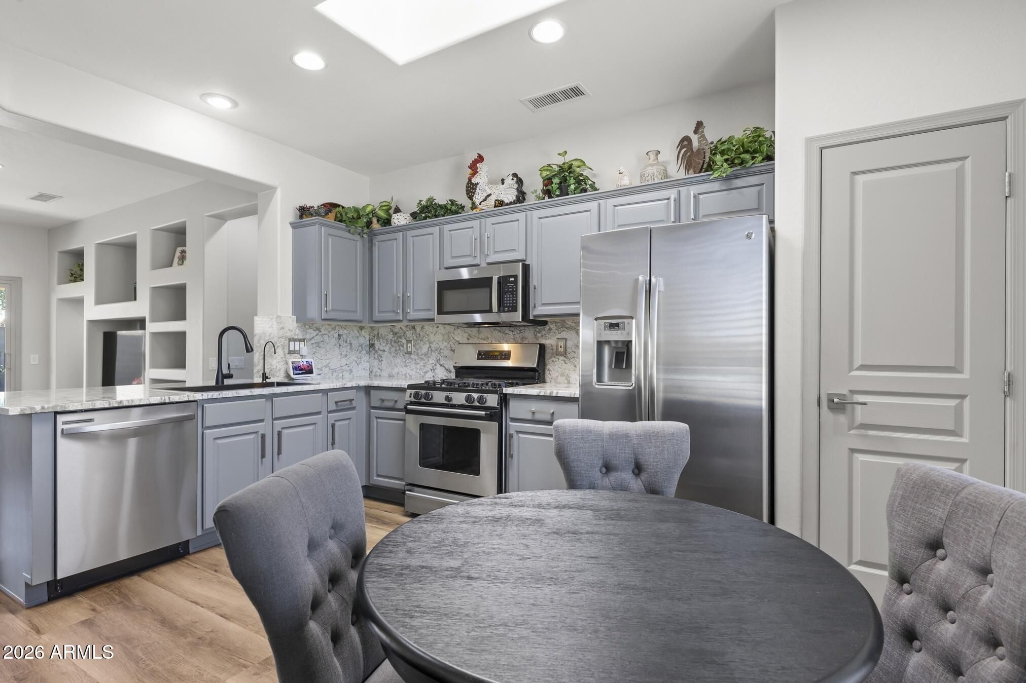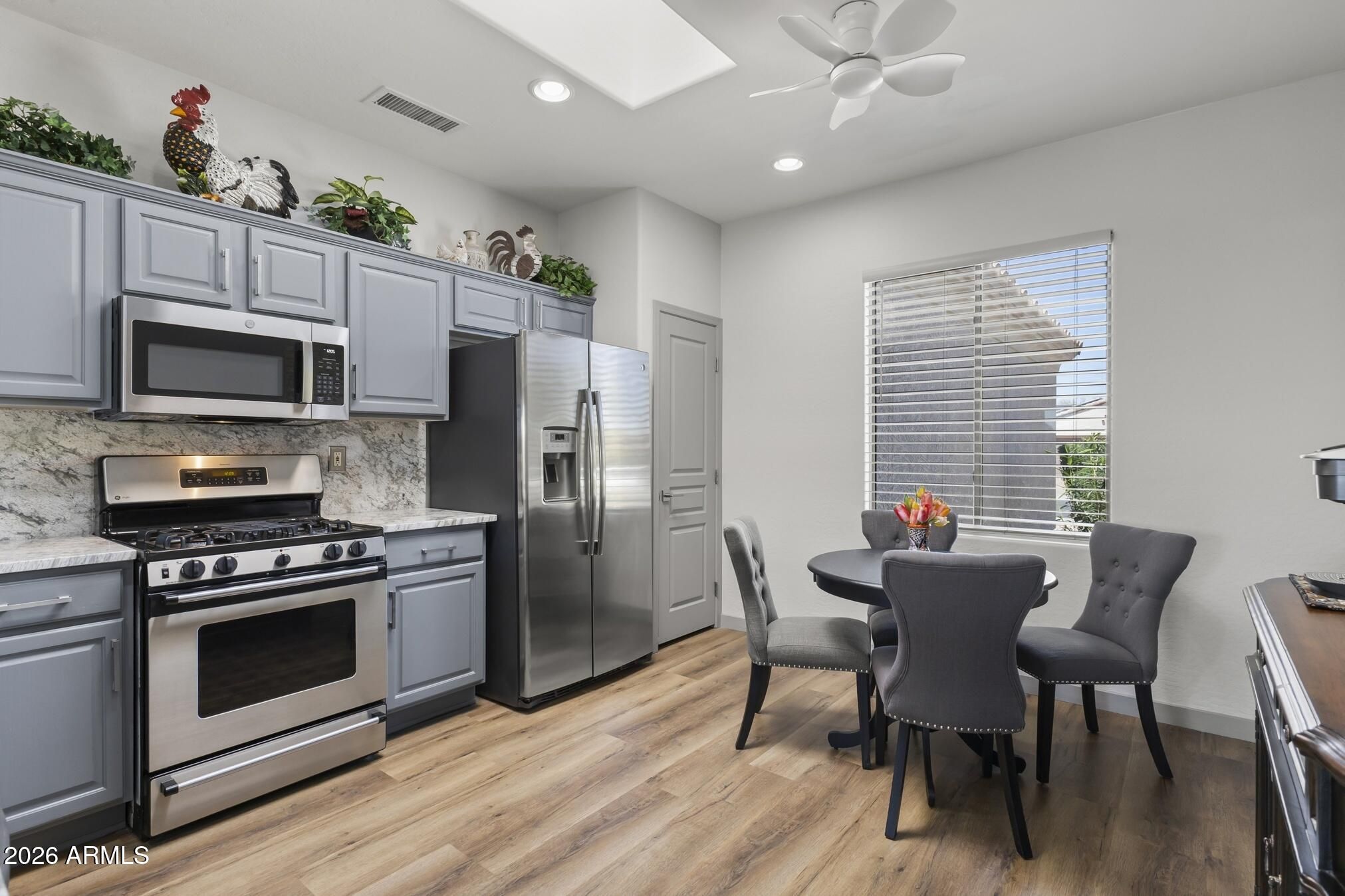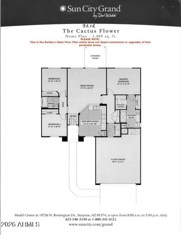 Living in The Grand, Arizona's premier active adult community, is even better with an updated home.Rare 3-bedroom featuring major upgrades;replaced roof underlayment, newer HVAC & hot water heater. Updated kitchen with granite bar, full backsplash, single basin sink, gas cooking, stainless appliances & pull-out shelves. Bathrooms fully remodeled with luxury tiled walk-in showers. LVP flooring throughout with 4'' baseboards. Fresh interior paint, custom blinds, brushed nickel hardware. Extended garage with cabinets, sink & side door to yard. Cool-coated driveway,patio & walkway.Updated irrigation,new landscaping front & back, plus a cozy patio in a block-fenced yard.Additional features include; Skylight in kitchen,new exterior paint,new patio sliding door,soft water loop in the garage, Soft close primary and guest bath vanities,R/O in kitchen,Artificial turf in the backyard,Pergola/patio cover painted,Ceiling fans,Built in media wall,Bay window in primary bedroom,2 closets in primary bathroom, Washer/dryer included inside. Toilets replaced. Garage keypad entry.Window glass replaced where needed. Pomegranate and tangelo trees.