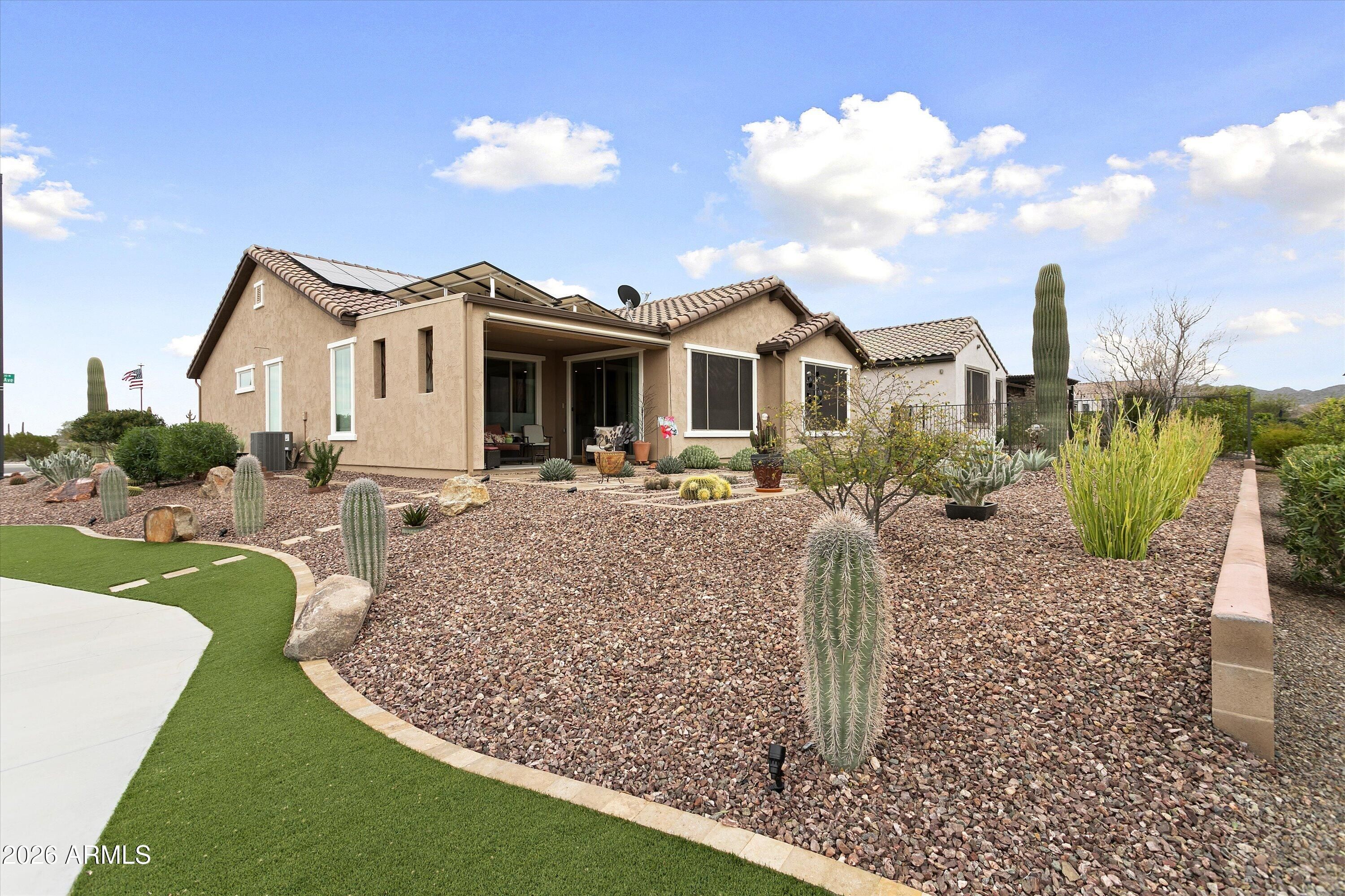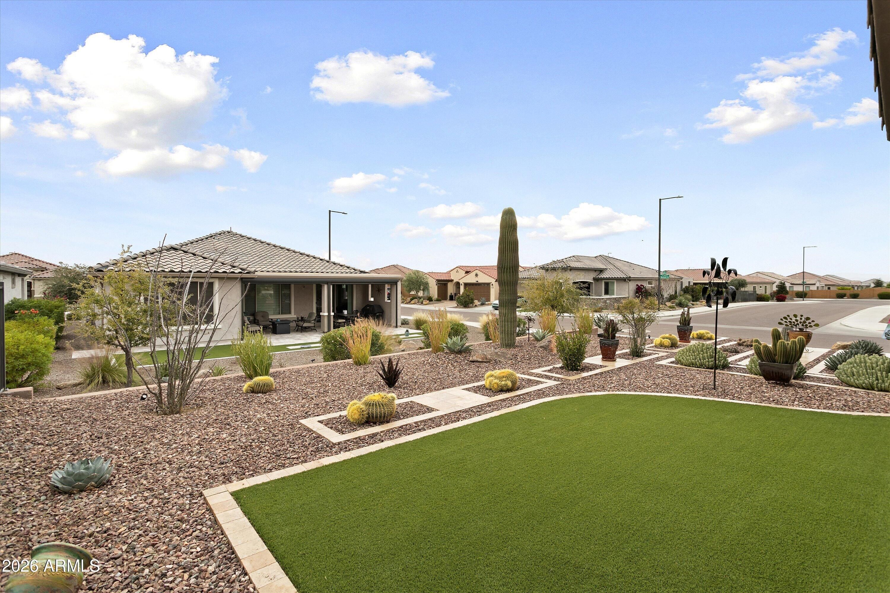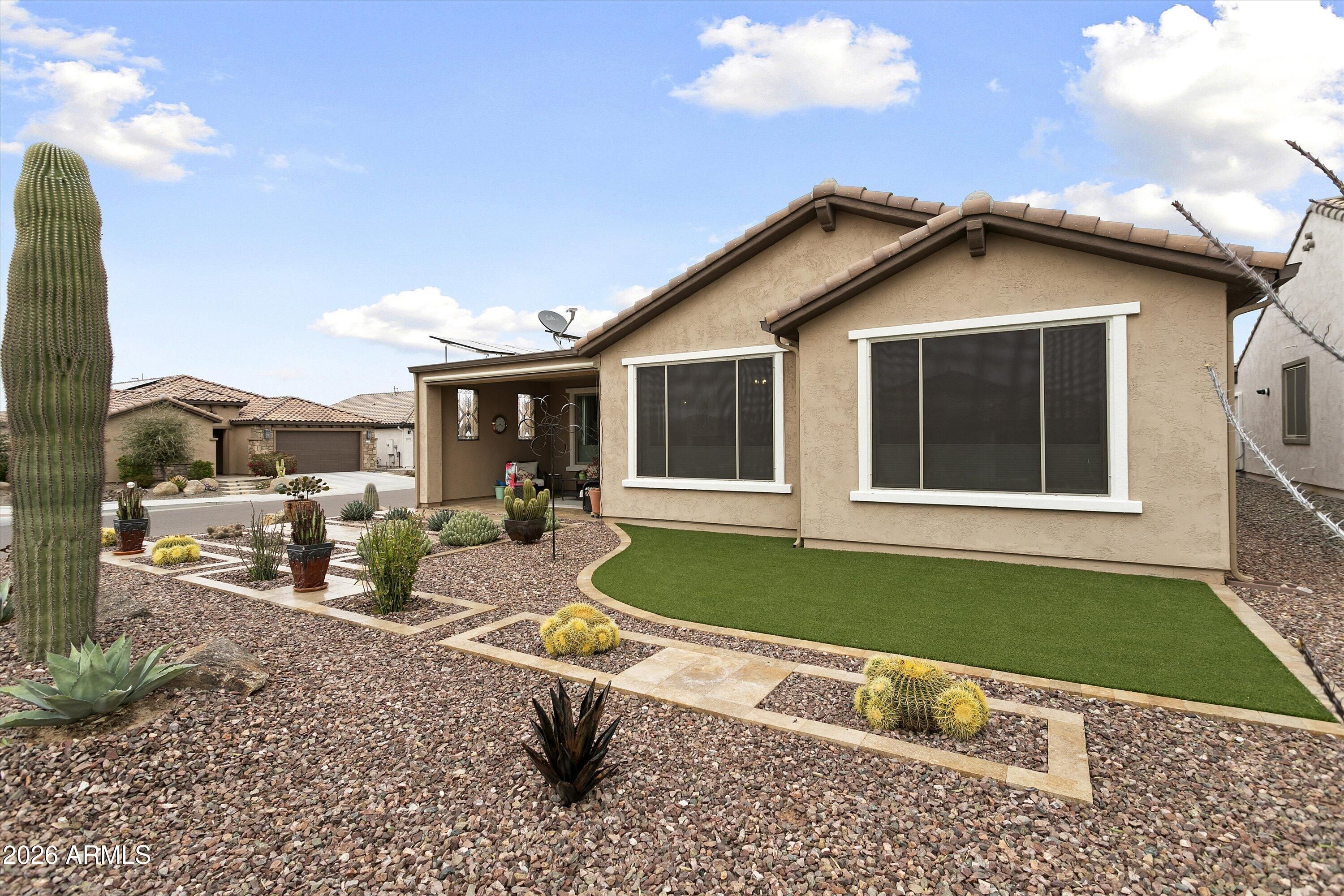 Enjoy unobstructed views filled with Saguaro cacti and the White Tank Mountains from your front courtyard. This spacious Sanctuary model includes 2 bedrooms, 2 baths and a den with an elegant stone façade exterior. The kitchen features maple-colored cabinetry, granite counters, a dual-basin Blanco sink and stainless-steel appliances with a gas cooktop and Samsung refrigerator. The LG wall oven and microwave are brand new with upgraded tile floors throughout the home. The owner's suite features dual vanities, a walk-in closet and a granitex shower surround, while the guest bath also includes a granitex tub/shower combo. The laundry includes a washer with gas dryer. The garage includes a soft water system, sink and overhead shelving. From the back patio you'll enjoy a landscape featuring a unique cactus garden, while the back patio also includes a remote-controlled sunscreen.