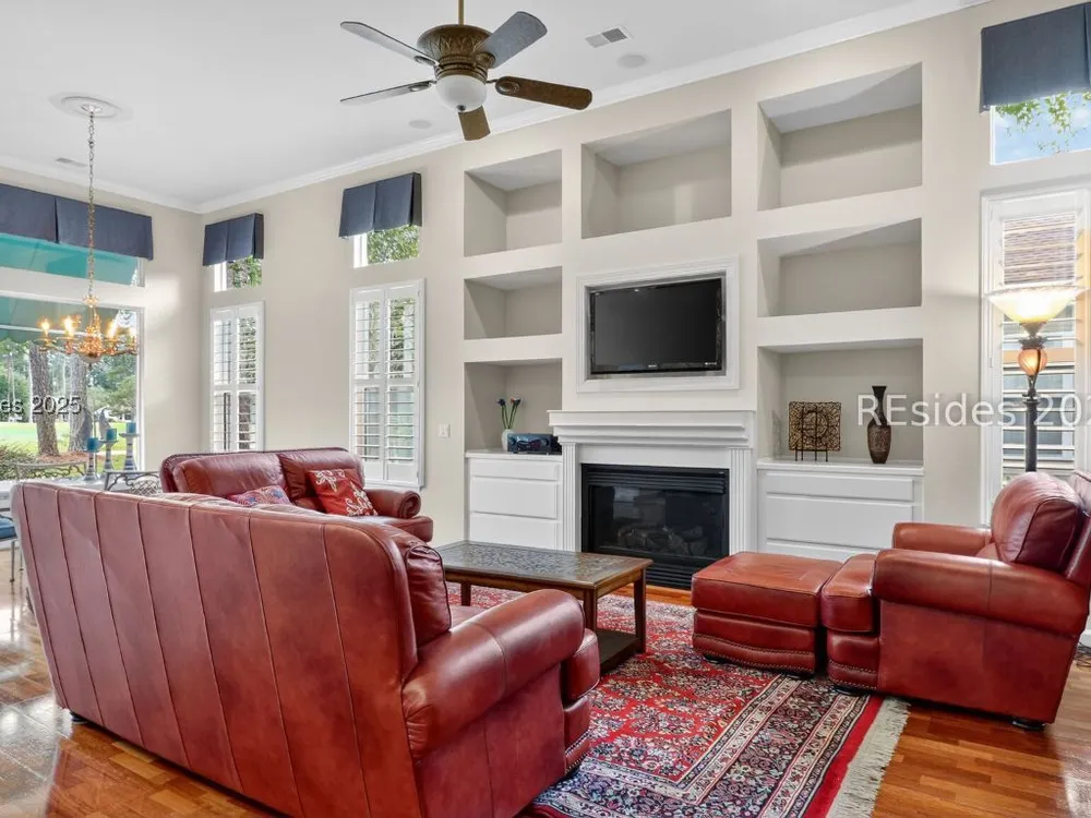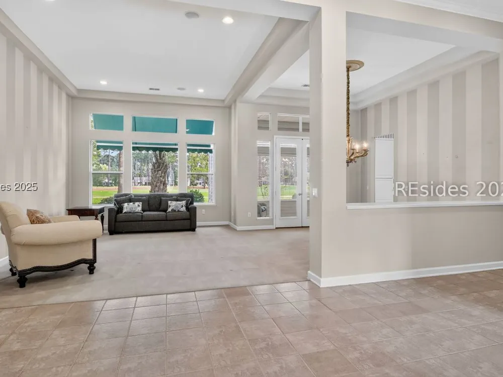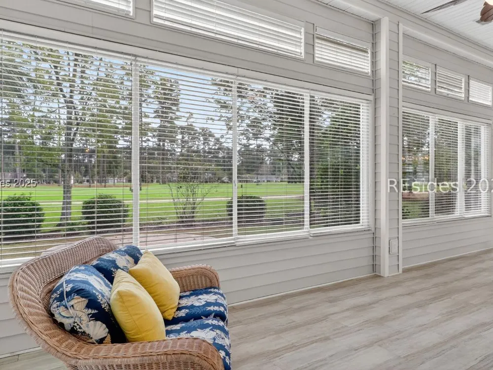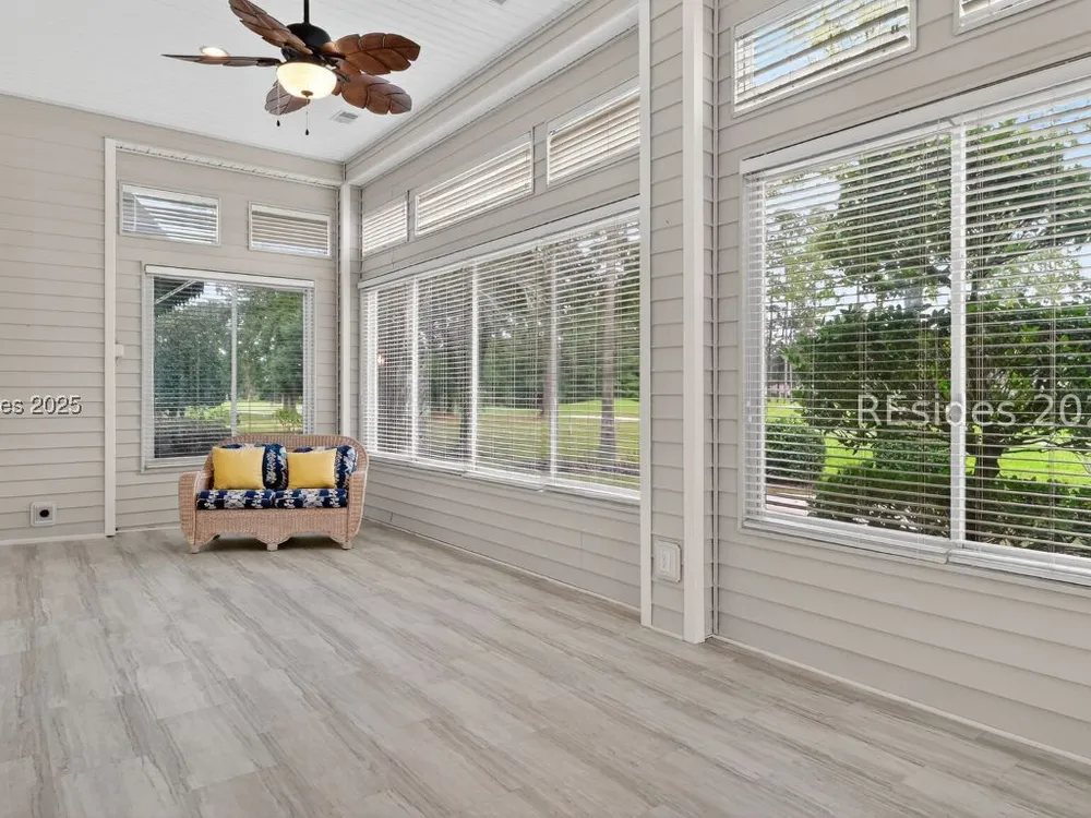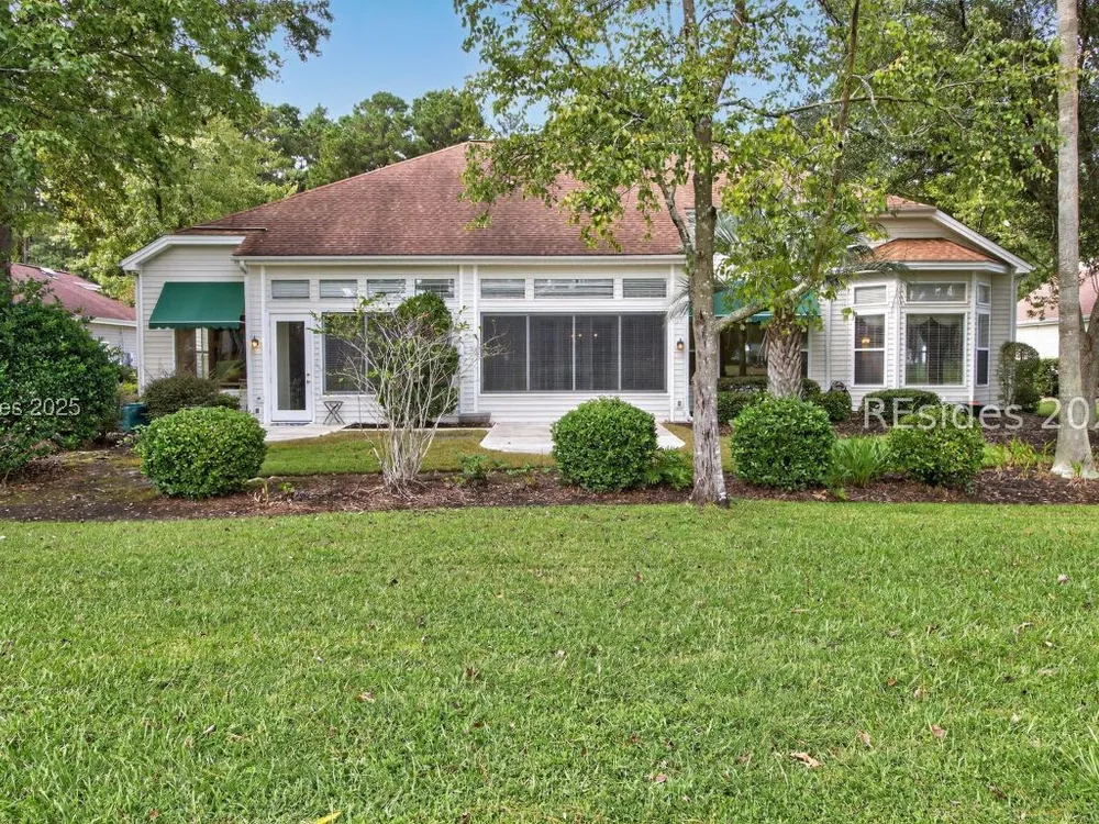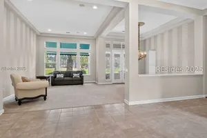 Fall in love with this coveted, Del Webb Marian Webster Estate model featuring 10 and 12 ceilings located on the Okatie Creek Golf Course. Welcome home to your Lowcountry retreat in the premier 55+ community of Sun City Hilton Head. Enjoy magnificent golf course views from your backyard in this elegantly appointed residence. The open and airy layout features a large gracious foyer, private office, half bath for guests, crown molding, plantation shutters, bay windows, tray ceilings, massive laundry room with an abundance of cabinets and counter space. There is a huge primary bedroom and bathroom with a custom closet. There is also a guest bedroom with an ensuite and walk-in closet. Entertain guests in the formal living and dining areas or relax by the gas fireplace in the inviting family room with gleaming wood floors. The spacious kitchen is a chef's delight with stainless-steel appliances. A two-car garage provides ample parking, with an attached golf cart garage! In addition, there is a large Carolina room that leads out to the patio overlooking the golf course. This home has two bedrooms, two and a half baths and is 3113 square feet. You will love entertaining your friends and family in this beautiful home.