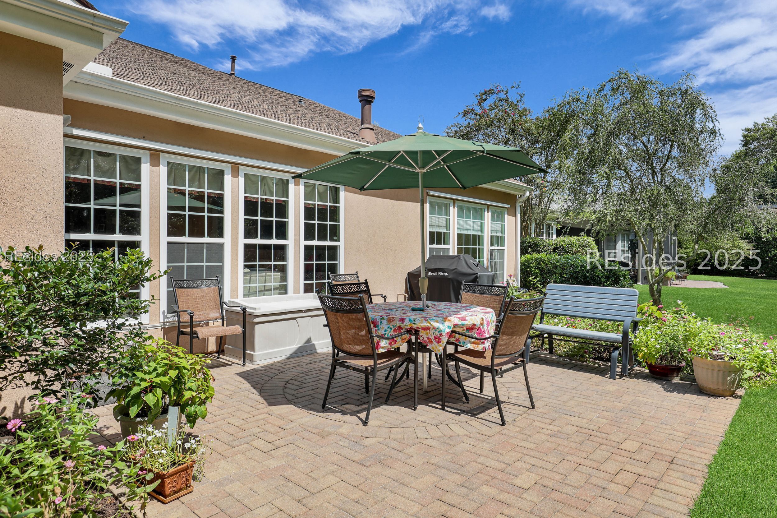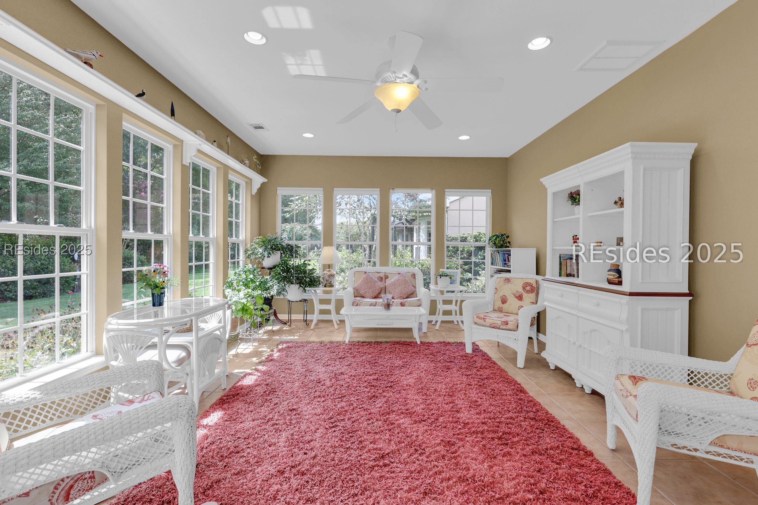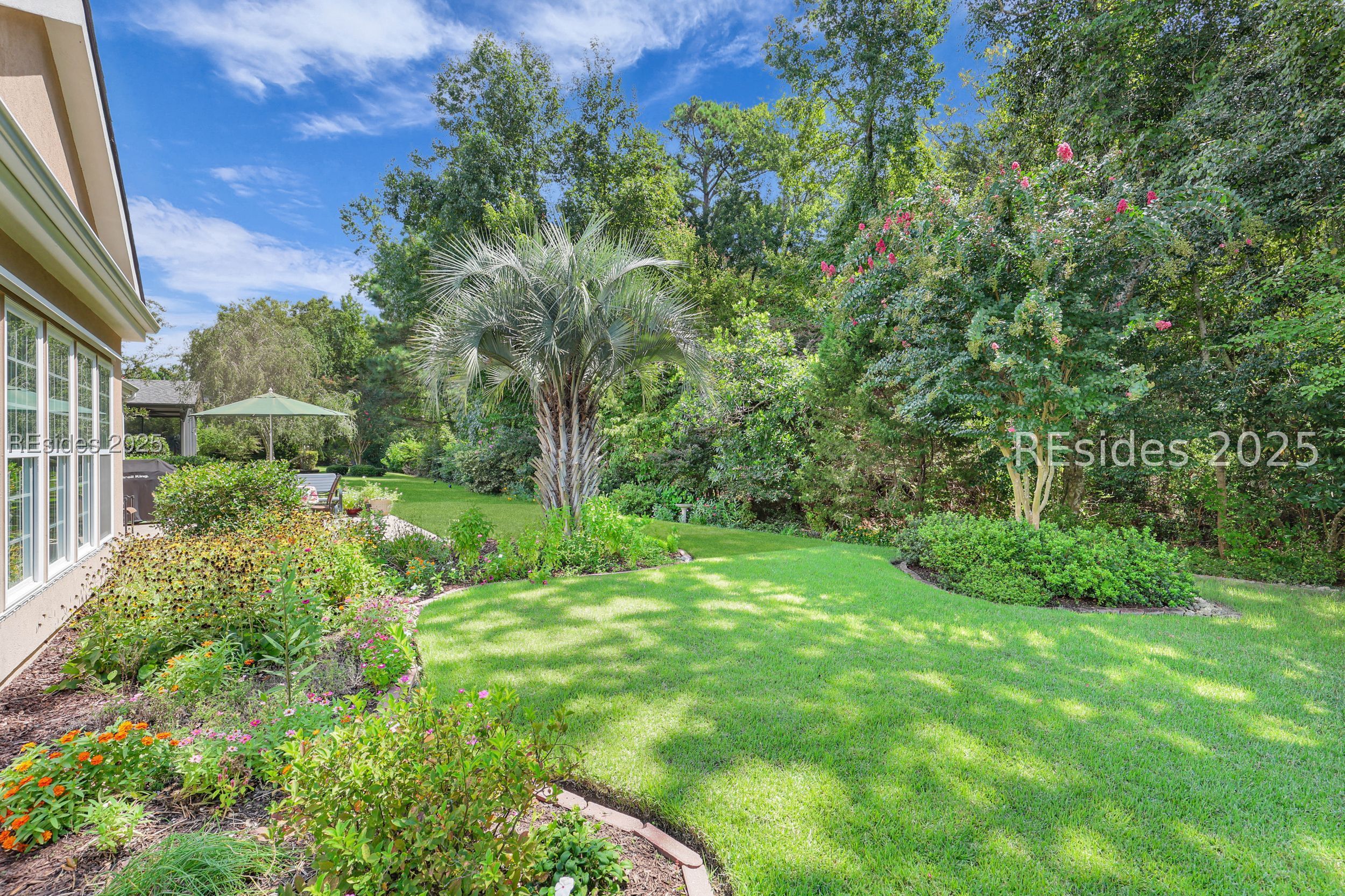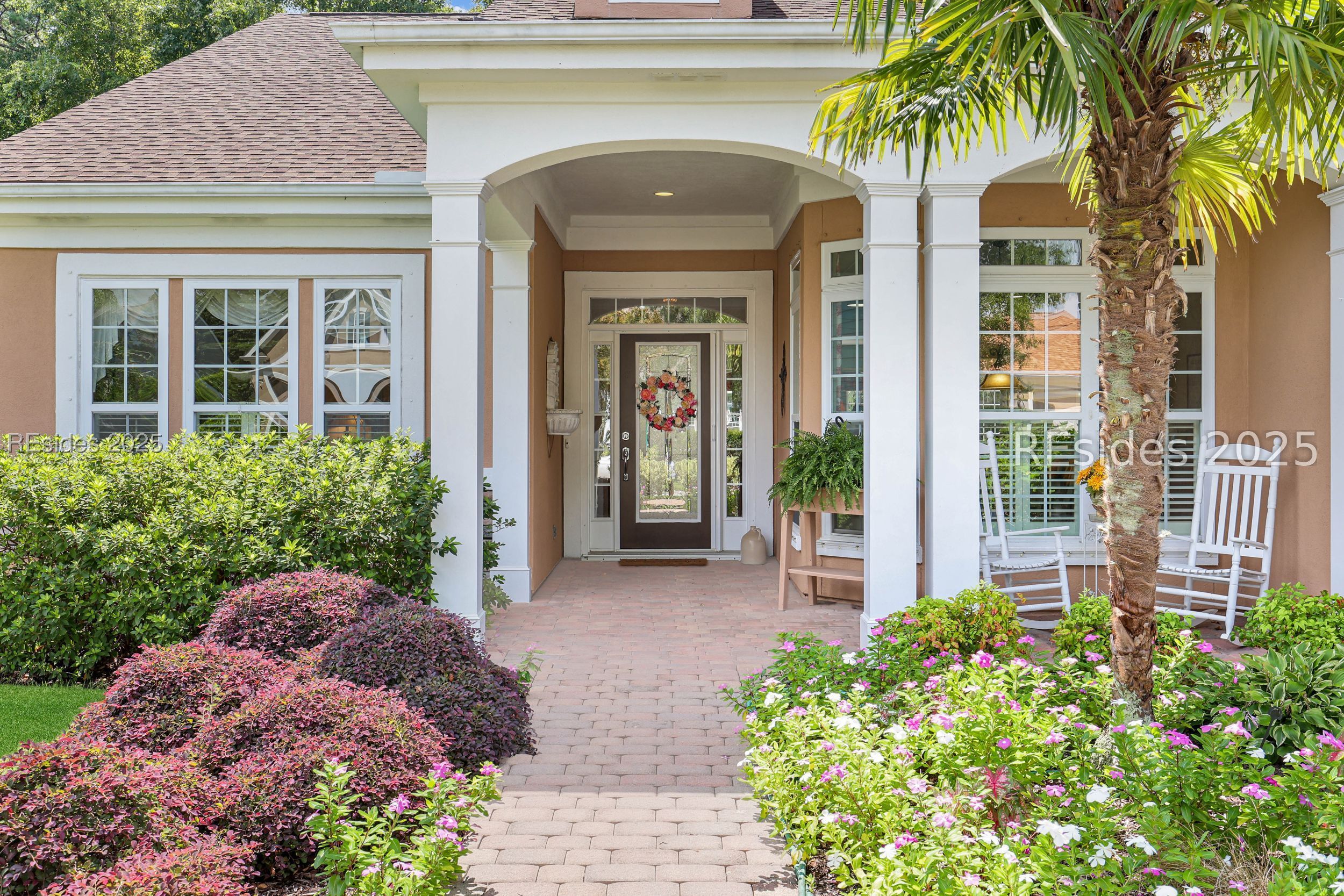 Discover Lowcountry living at its finest in this elegant and sought after Cumberland Hall model located on Sun City Hilton Head's desirable Southside. Set on a beautifully landscaped wooded lot with lush gardens, this 3-bedroom, 2.5-bath home is thoughtfully designed for both comfort and sophistication. A spacious office/den with double-door entry and an expansive four-season sunroom create versatile spaces for work, relaxation, or entertaining. The gourmet kitchen is a chef's delight, showcasing granite countertops, abundant cabinetry with roll-out shelving, a center island, induction range, newer stainless-steel appliances, and a charming eat-in area highlighted by a tray ceiling and plantation shutters. The primary suite offers a tray ceiling, generous walk-in closet and spa-inspired bath with double vanity, walk-in shower, and garden tub. Two additional bedrooms are thoughtfully separated by a full bath with dual vanities, while a convenient and large linen closet enhances the powder room. Notable features include a 2021 roof and water heater, smooth ceilings, Low-E windows throughout, plantation shutters in the front, and a spacious walk-in hall closet with custom shelving. Outdoor living is elevated by an extended paver driveway, paver entryway, and extended rear paver patio, complemented by gutters, French drains, and lush zoysia sod. The 2-car 4-foot extended garage with golf cart bay, lifestyle screen, and 150 sq. ft. of floored storage ensures exceptional function and convenience. All of this is paired with Sun City Hilton Heads world-class amenities: multiple pools, fitness centers, golf, pickleball, tennis, softball, woodworking, and over 200 clubs making this home a true Lowcountry retreat where comfort meets resort-style living.