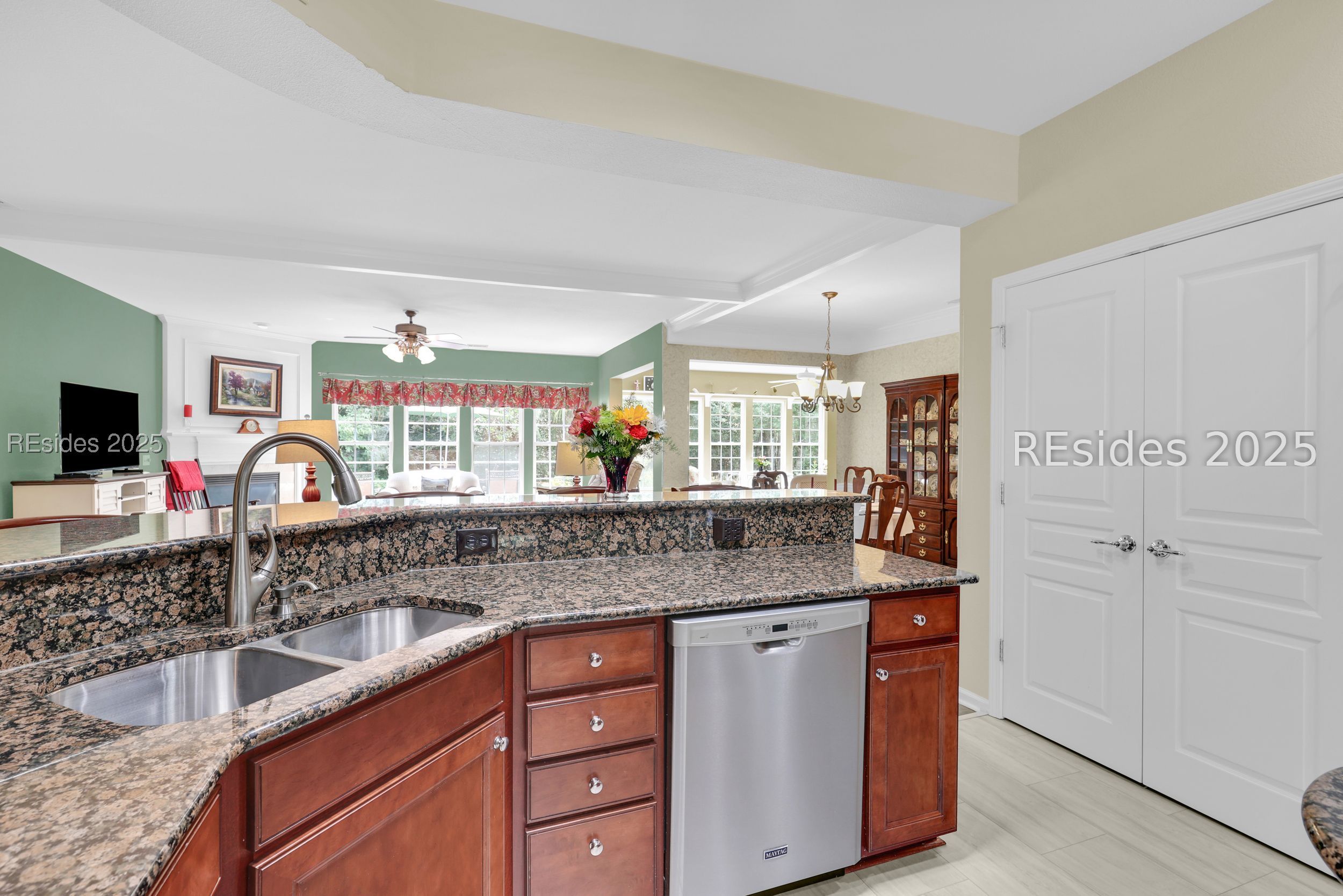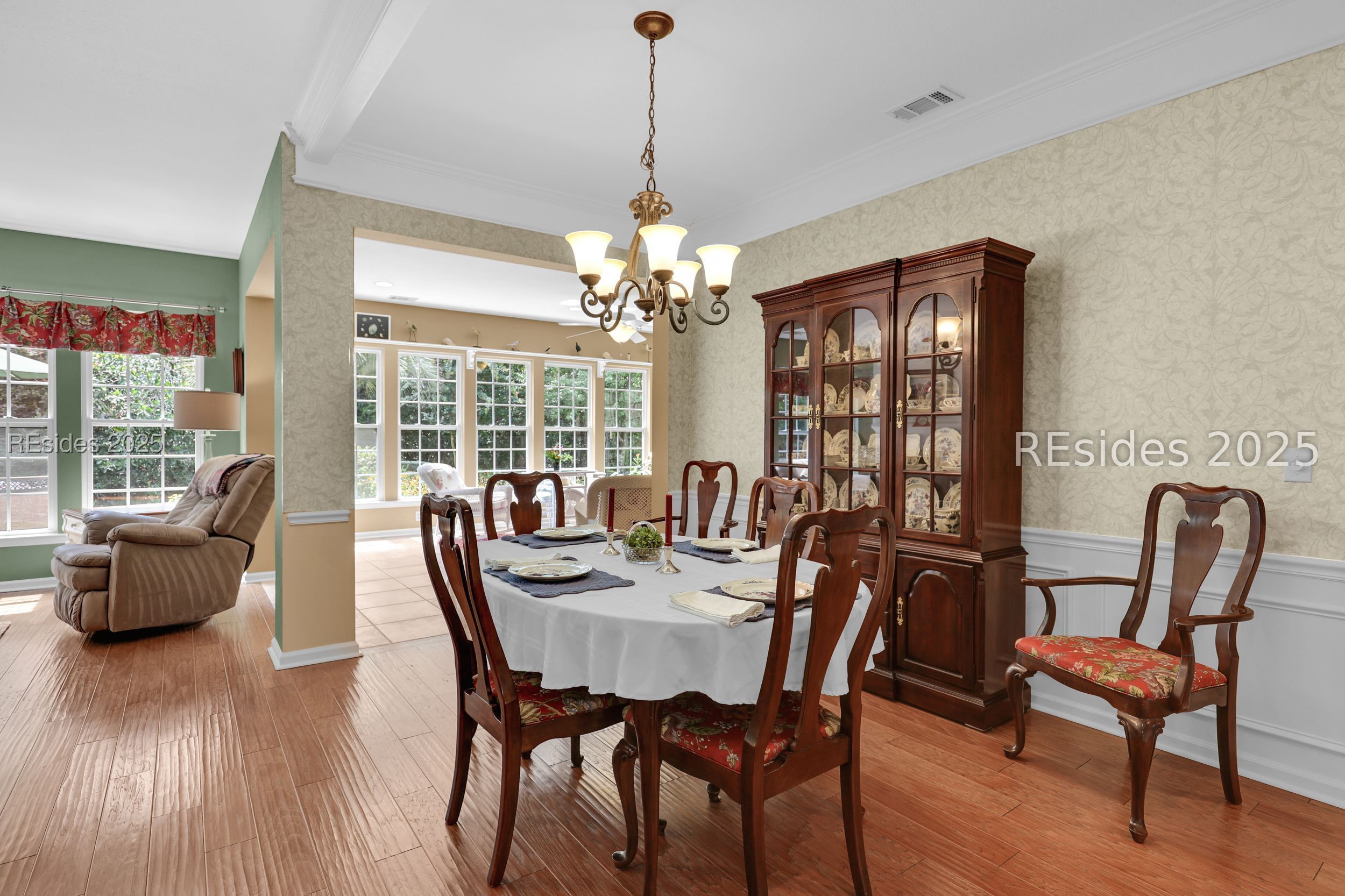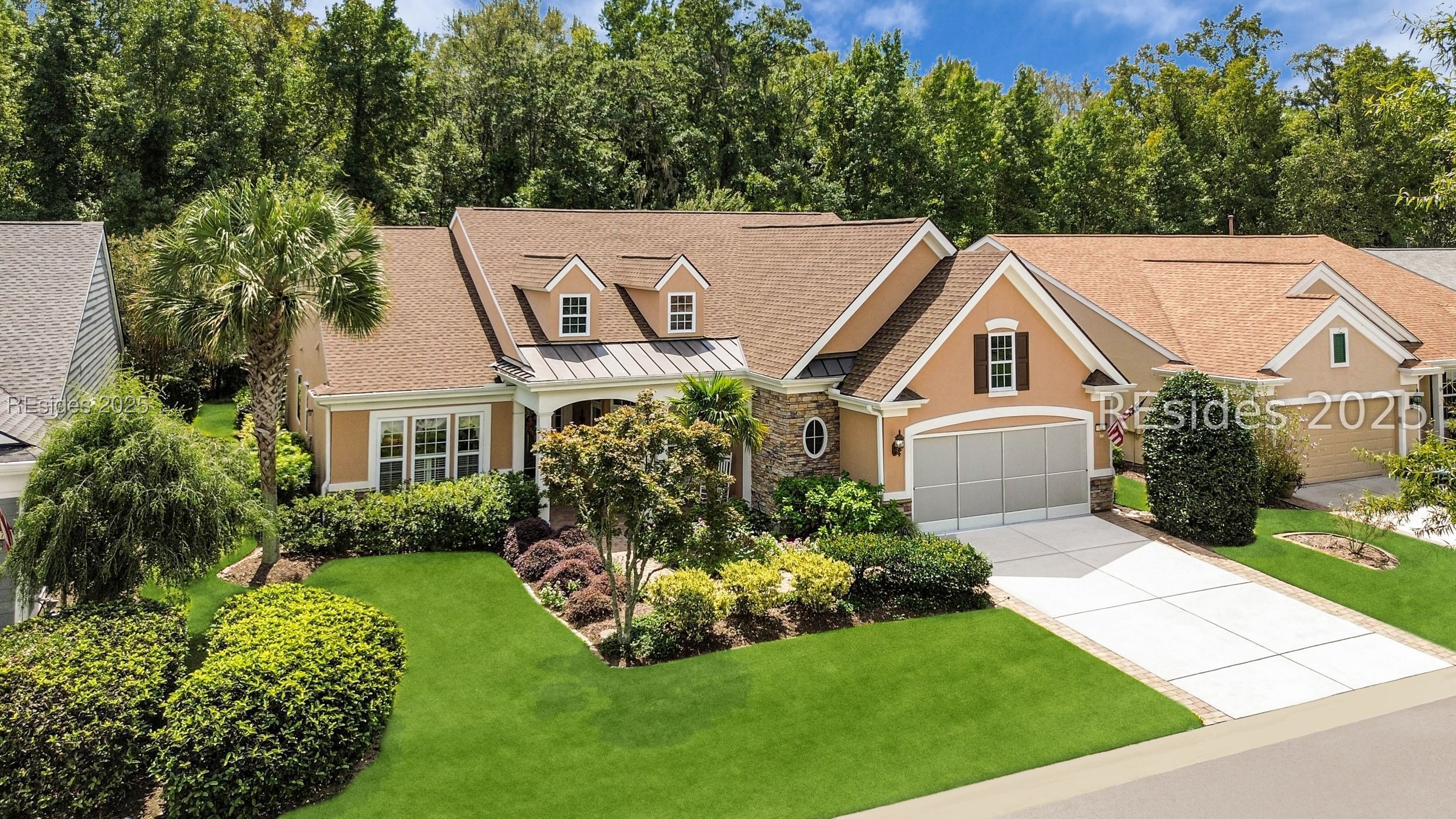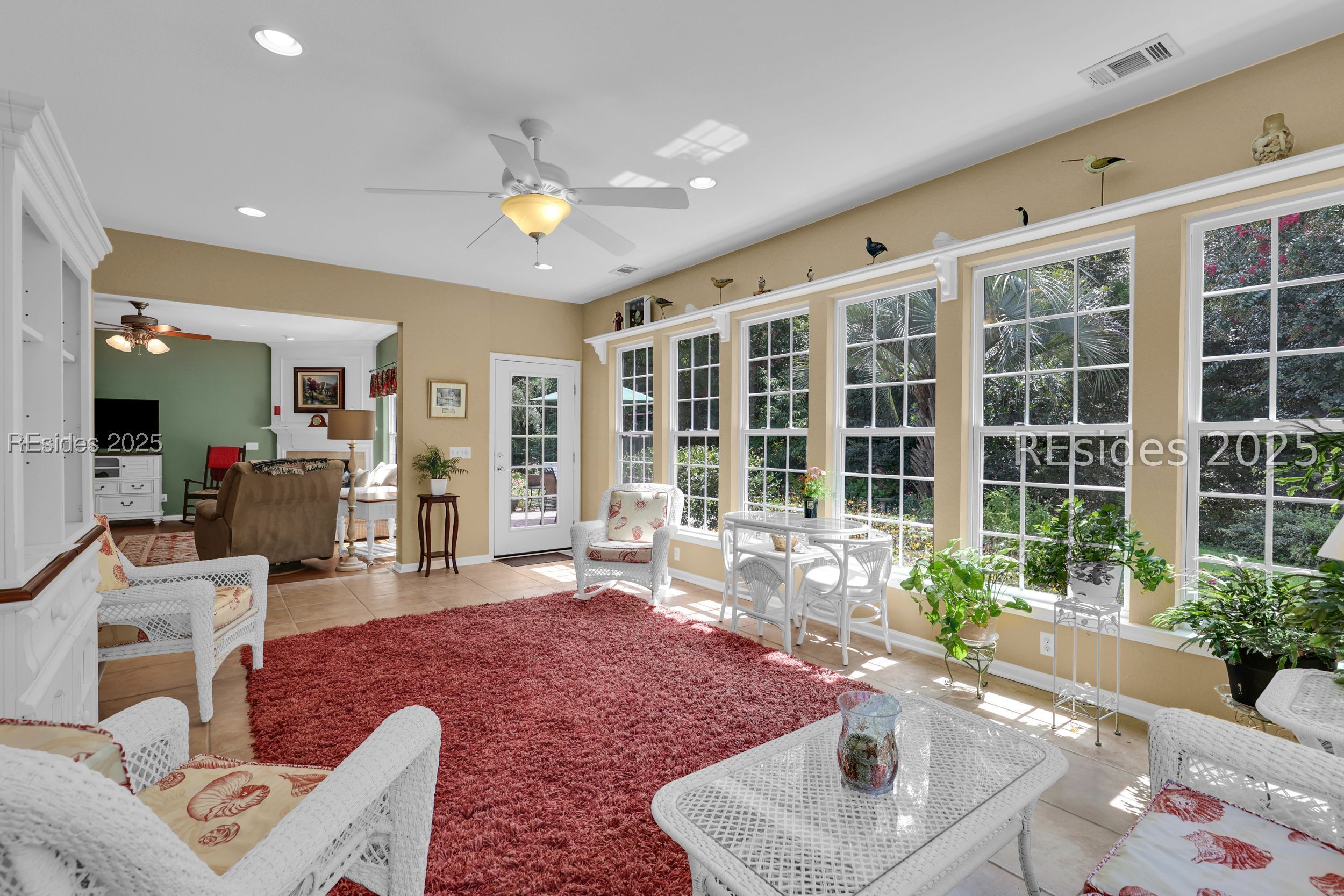 Discover Lowcountry living at its finest in this elegant and sought after Cumberland Hall model located on Sun City Hilton Head's desirable Southside. Set on a beautifully landscaped wooded lot with lush gardens, this 3-bedroom, 2.5-bath home is thoughtfully designed for both comfort and sophistication. A spacious office/den with double-door entry and an expansive four-season sunroom create versatile spaces for work, relaxation, or entertaining. The gourmet kitchen is a chef's delight, showcasing granite countertops, abundant cabinetry with roll-out shelving, a center island, induction range, newer stainless-steel appliances, and a charming eat-in area highlighted by a tray ceiling and plantation shutters. The primary suite offers a tray ceiling, generous walk-in closet and spa-inspired bath with double vanity, walk-in shower, and garden tub. Two additional bedrooms are thoughtfully separated by a full bath with dual vanities, while a convenient and large linen closet enhances the powder room. Notable features include a 2021 roof and water heater, smooth ceilings, Low-E windows throughout, plantation shutters in the front, and a spacious walk-in hall closet with custom shelving. Outdoor living is elevated by an extended paver driveway, paver entryway, and extended rear paver patio, complemented by gutters, French drains, and lush zoysia sod. The 2-car 4-foot extended garage with golf cart bay, lifestyle screen, and 150 sq. ft. of floored storage ensures exceptional function and convenience. All of this is paired with Sun City Hilton Heads world-class amenities: multiple pools, fitness centers, golf, pickleball, tennis, softball, woodworking, and over 200 clubs making this home a true Lowcountry retreat where comfort meets resort-style living.