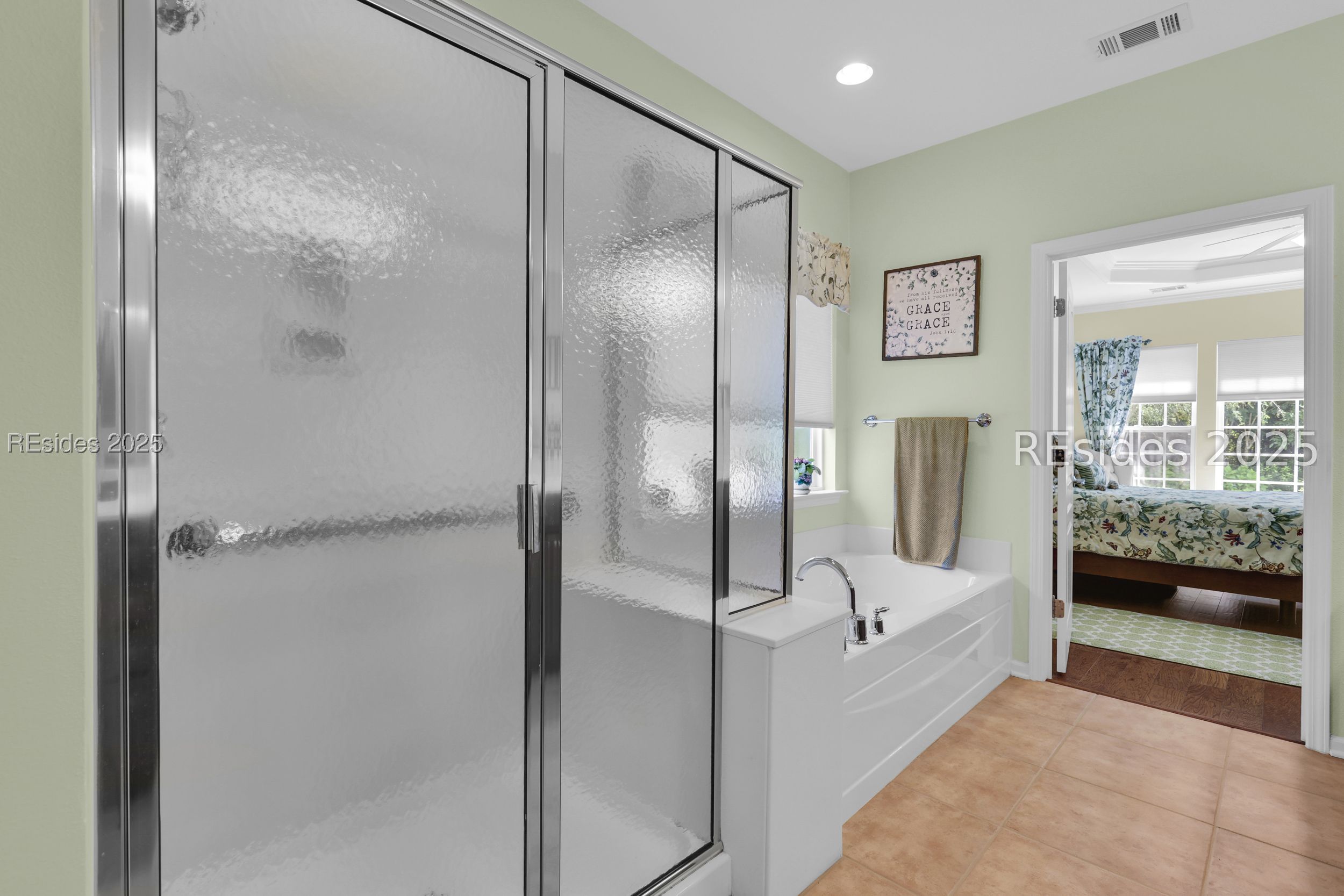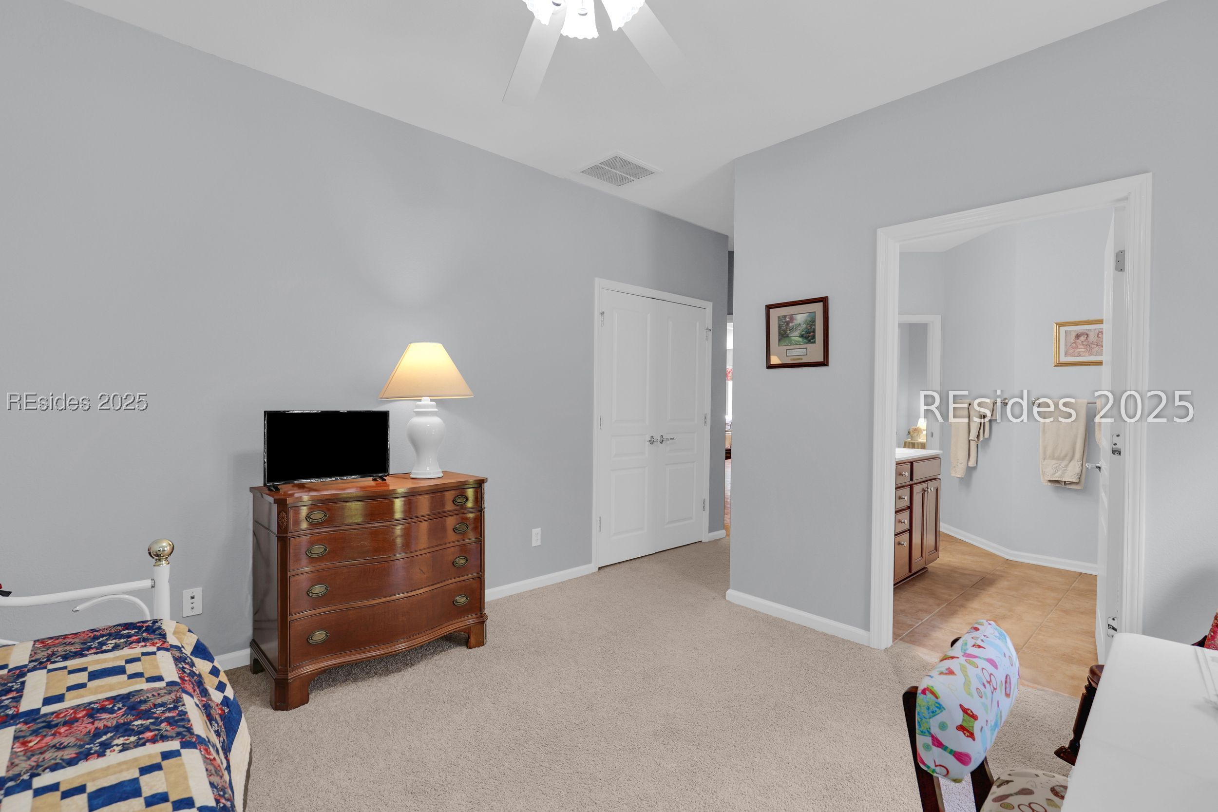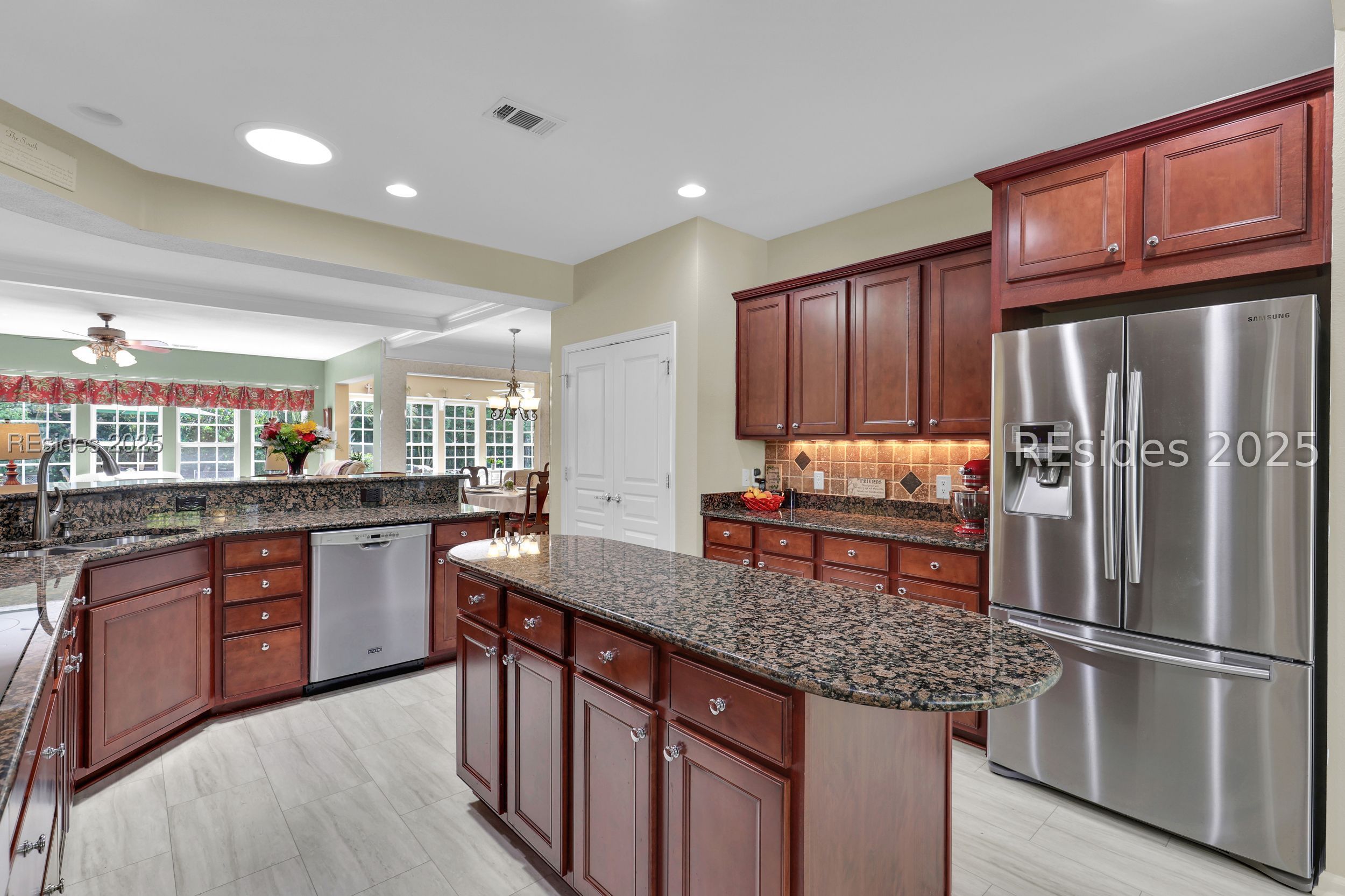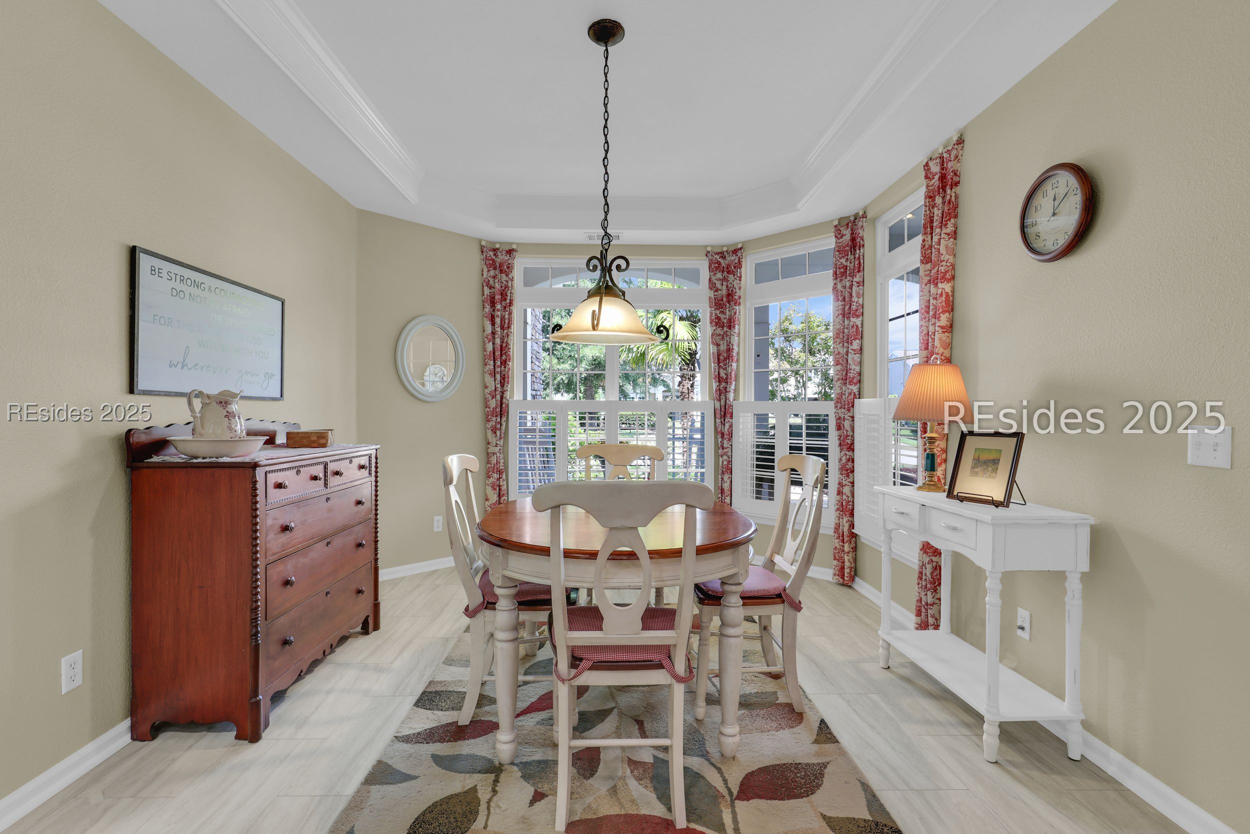 Discover Lowcountry living at its finest in this elegant and sought after Cumberland Hall model located on Sun City Hilton Head's desirable Southside. Set on a beautifully landscaped wooded lot with lush gardens, this 3-bedroom, 2.5-bath home is thoughtfully designed for both comfort and sophistication. A spacious office/den with double-door entry and an expansive four-season sunroom create versatile spaces for work, relaxation, or entertaining. The gourmet kitchen is a chef's delight, showcasing granite countertops, abundant cabinetry with roll-out shelving, a center island, induction range, newer stainless-steel appliances, and a charming eat-in area highlighted by a tray ceiling and plantation shutters. The primary suite offers a tray ceiling, generous walk-in closet and spa-inspired bath with double vanity, walk-in shower, and garden tub. Two additional bedrooms are thoughtfully separated by a full bath with dual vanities, while a convenient and large linen closet enhances the powder room. Notable features include a 2021 roof and water heater, smooth ceilings, Low-E windows throughout, plantation shutters in the front, and a spacious walk-in hall closet with custom shelving. Outdoor living is elevated by an extended paver driveway, paver entryway, and extended rear paver patio, complemented by gutters, French drains, and lush zoysia sod. The 2-car 4-foot extended garage with golf cart bay, lifestyle screen, and 150 sq. ft. of floored storage ensures exceptional function and convenience. All of this is paired with Sun City Hilton Heads world-class amenities: multiple pools, fitness centers, golf, pickleball, tennis, softball, woodworking, and over 200 clubs making this home a true Lowcountry retreat where comfort meets resort-style living.