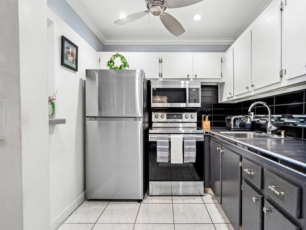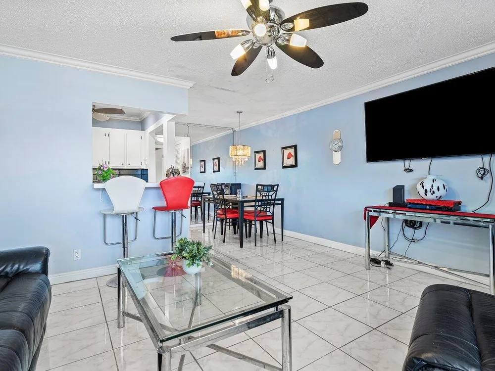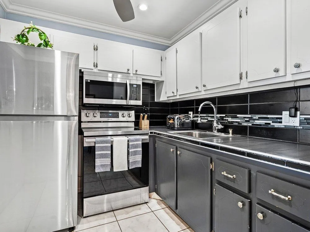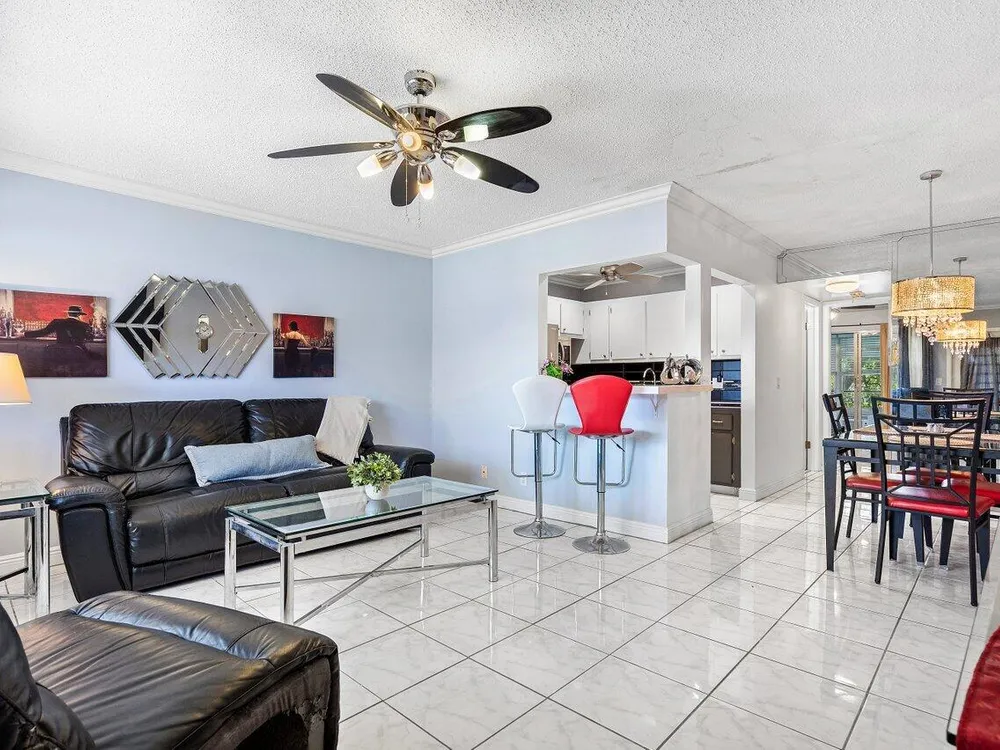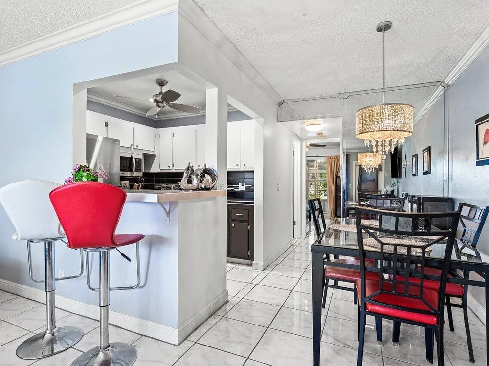 NEW ROOF! Beautifully updated second floor unit in the 55+ community of Century Village East. Meticulously taken care of and move-in ready. The open-concept gourmet kitchen features newer stainless steel appliances, bar seating, and flows seamlessly into the living and dining area. Tile flooring throughout (no carpet). Updated bathroom with shower/tub combo. Two oversized closets and ample cabinet space offer excellent storage space. Enclosed patio with canal view. Condo fee includes cable, water, and access to a multi-million dollar clubhouse with a gym, movie theater, pickleball, pools, yoga, art classes, and on-site restaurant. Assigned parking space and storage unit included. Laundry room just one door away.