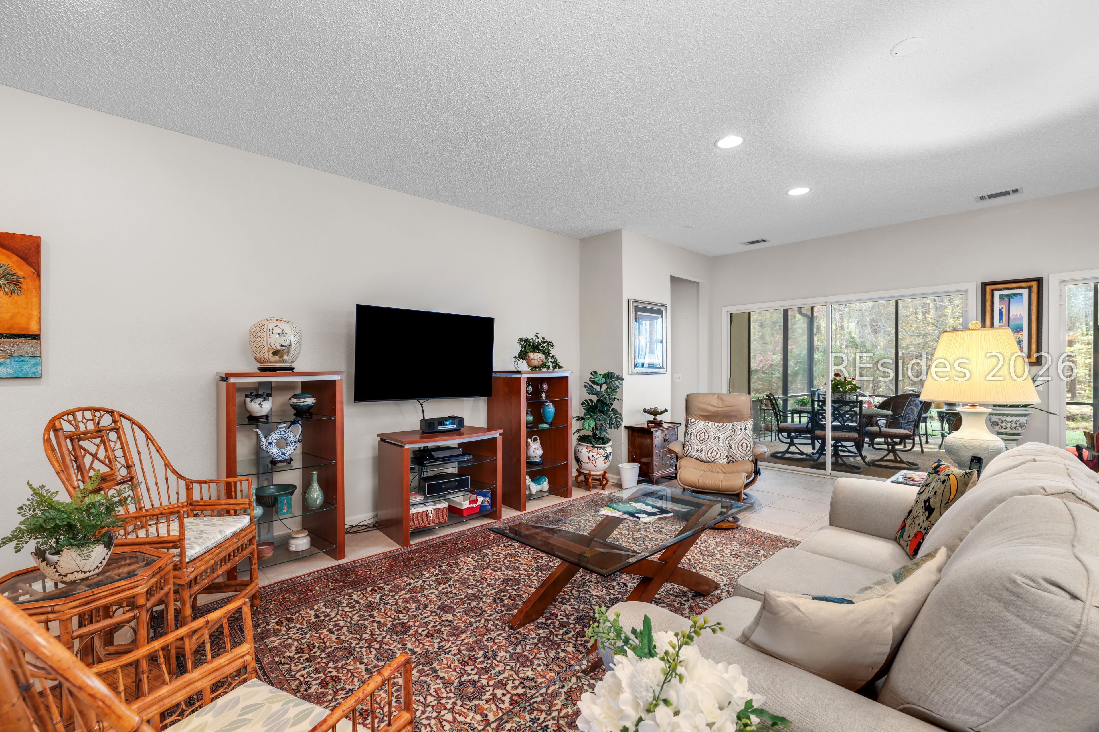 Spacious design and an inviting Lowcountry lifestyle come together in this beautifully maintained Wisteria model located in the sought-after Sun City active adult community. With over 2,400 square feet, this three bedroom, two bath home offers comfortable single-level living with generous gathering spaces designed for both everyday life and entertaining.The main level features a large primary suite along with an open living and dining area that flows naturally into the expansive kitchen, creating a layout that feels bright, connected, and welcoming. Thoughtful details throughout the home include abundant storage, flexible living areas, and comfortable guest accommodations.Outdoor living is just as appealing, with a screened porch that invites year-round enjoyment, whether it is morning coffee, afternoon reading, or evenings spent enjoying the peaceful wooded backdrop.Located in Sun City South, residents enjoy access to an exceptional range of amenities including championship golf, resort-style pools, tennis and pickleball courts, state-of-the-art fitness centers, walking trails, and a vibrant calendar of clubs and social activities. This home offers the ideal opportunity to enjoy the Lowcountry lifestyle within one of Bluffton's most established active adult communities.