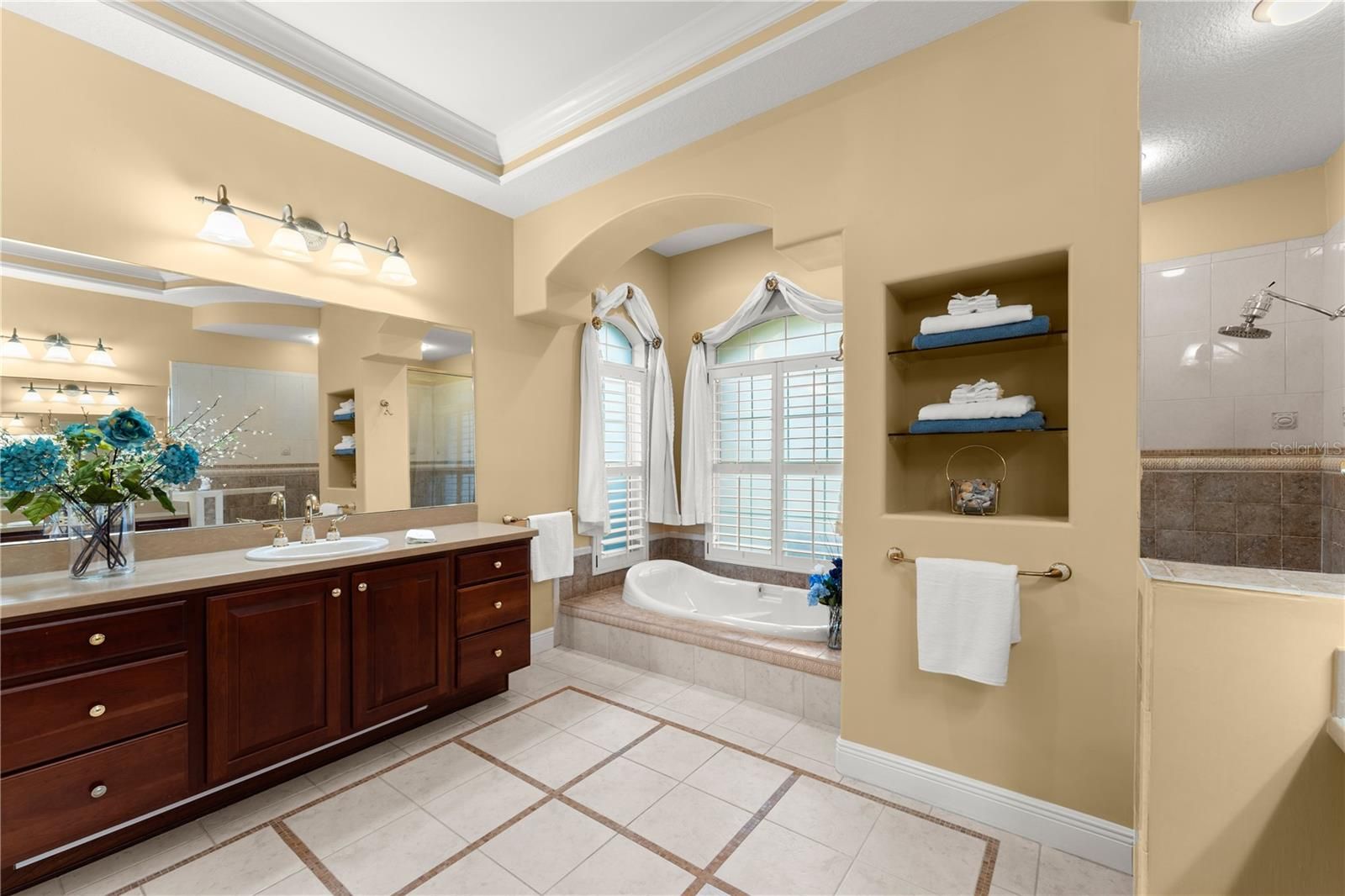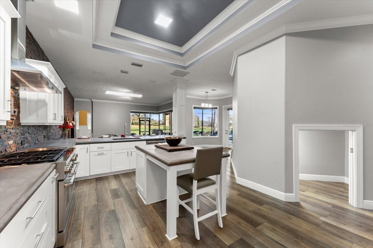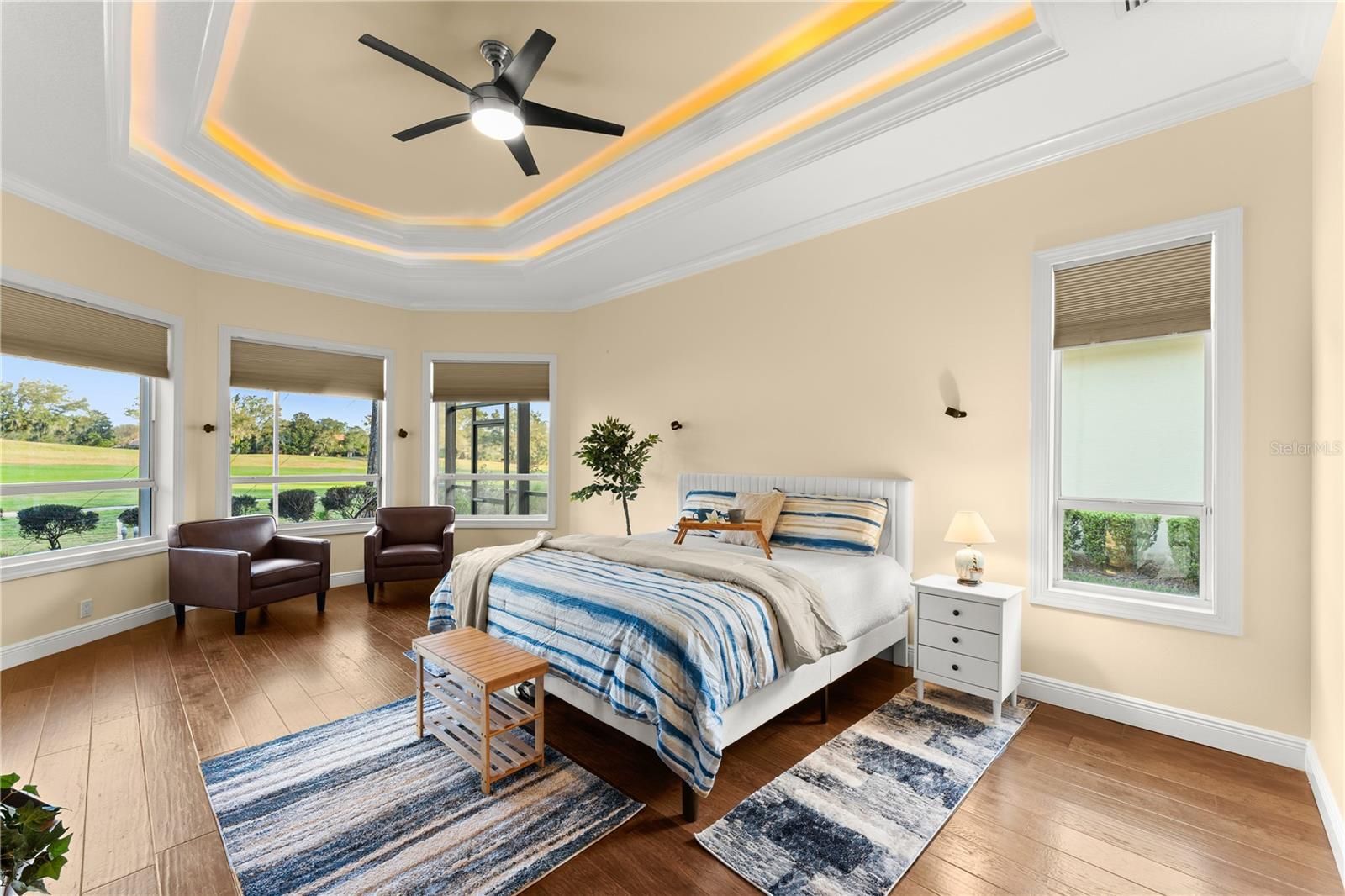 - Ceiling Fan(s), Crown Molding, High Ceilings, Kitchen/Family Room Combo, Open Floorplan, Main Level Primary, Solid Surface Counters, Tray Ceiling(s), Walk-In Closet(s), Wet Bar