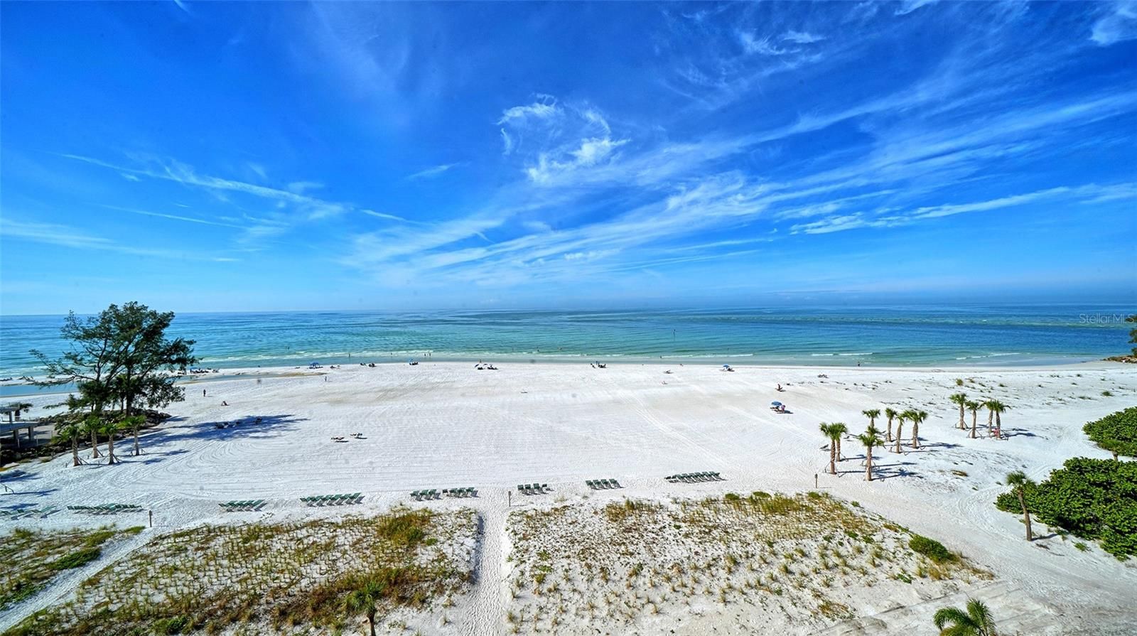 Experience breathtaking, 180 degree FULL GULF VIEWS from this 8th floor North Tower residence overlooking 800’ of private beach in the premiere Gulf front property of Whispering Sands! Priced to sell, this 2 bedroom/2 bath, upper floor unit represents an exceptional investment opportunity in one of Siesta Key’s most sought after communities. It could be considered a blank slate, offering the new owner the opportunity to use their imagination and create a retreat that reflects their own personal style. A 25' private balcony, accessible via floor to ceiling sliders opening from the living room and primary bedroom, offers panoramic vistas across the shimmering shoreline and powder soft sands and a lifetime of spectacular symphonies of colorful sunsets over the Gulf. A complete set of NEW 2024 hurricane impact exterior balcony sliders provides total peace of mind. The galley kitchen includes a nice eat-in space and Bosch, Whirlpool, and Frigidaire appliances. The primary bedroom features an ensuite bath with tub/shower combination, walk-in closet, and generous vanity area. The guest bedroom is large enough to accommodate two queen beds – or would easily make a great home office or den. The furniture and furnishings minus a small exclusion list are being offered with this property. Residents of Whispering Sands enjoy resort style amenities, including 2 heated pools, 800’ of private beach, clubhouse and Gulf front Tower Lounge – both of which are currently in the process of being completely remodeled – NEW beachside gas grills, Tiki Hut, shuffleboard, and canoe/kayak storage. Beach loungers are put out daily for the exclusive use of owners and their guests. Leave your car at home: all of this is conveniently just around the corner from the myriad of dining options, colorful boutiques, and vibrant island lifestyle of Siesta Key Village! Seize this opportunity to create a lifetime of memories by investing in one of Siesta Key’s most desirable Gulf front communities.