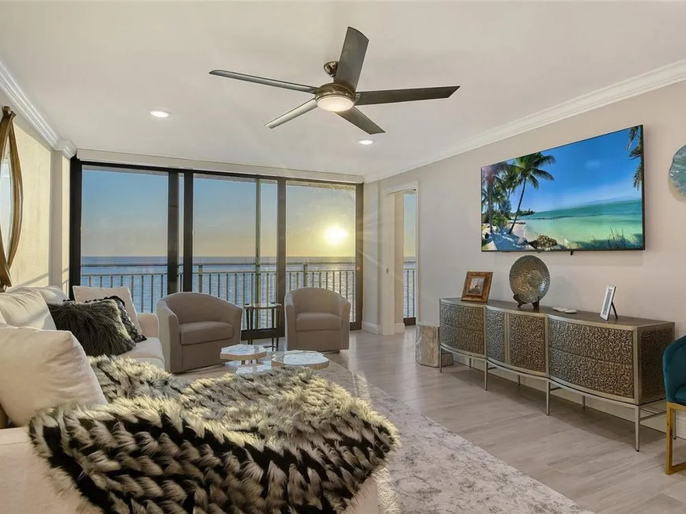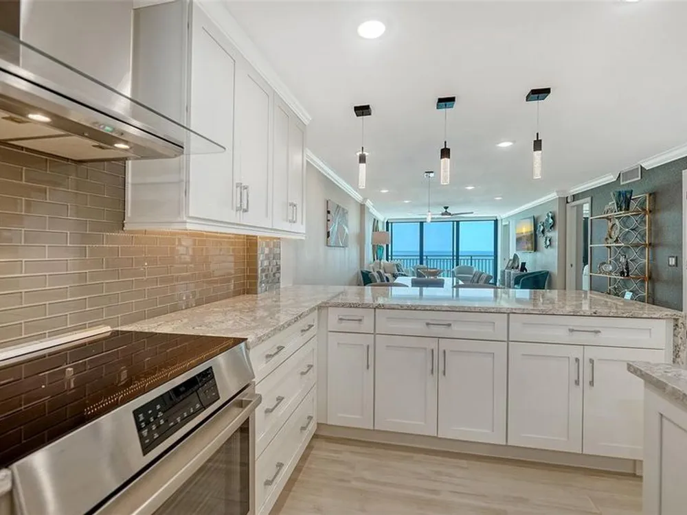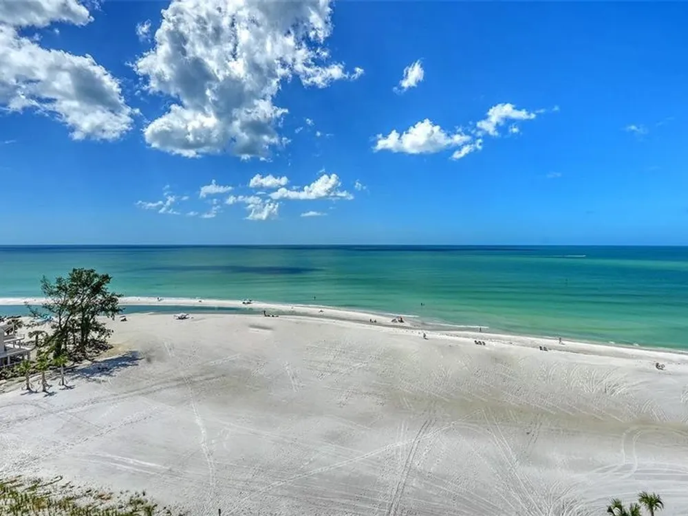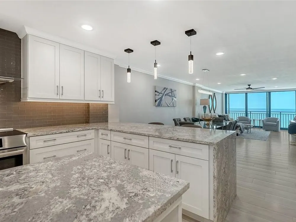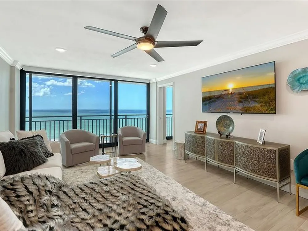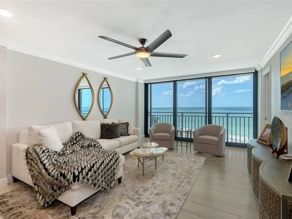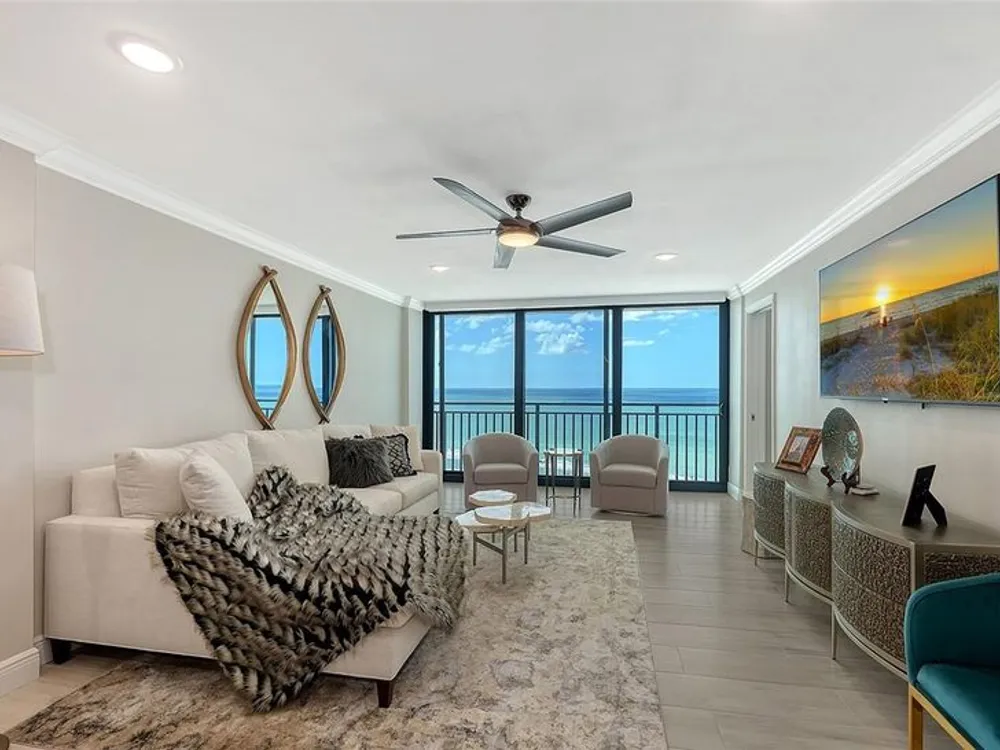 EXQUISITE GULF FRONT LUXURY! Just one floor from the top, this stunning, 11th floor, FULLY remodeled GULF FRONT tower residence offers a seamless blend of sophistication and coastal style against a background of breathtaking, unobstructed 180-degree views of the shimmering Gulf! A rare combination of sophistication, comfort, and coastal beauty, this residence defines modern Gulf front luxury living. Every detail of this 2022 remodel reflects the finest in contemporary design and craftsmanship. The open concept interior is graced with beautiful wide plank tile flooring, seamlessly connecting living, dining, and kitchen spaces to the endless blue horizon beyond. True floor-to-ceiling 2020 hurricane impact sliders open to mesmerizing Gulf vistas, enhanced by Hunter Douglas motorized light-filtering shades for effortless ambiance control. The gourmet kitchen is a showpiece featuring striking Cambria® quartz surfaces, a dramatic 8’ waterfall breakfast bar with dimmable pendant lighting, Bosch stainless appliances, 32 bottle wine refrigerator, fabulous under counter drawer microwave, and custom soft-close cabinetry. The serene primary suite is equally refined, featuring a spa-inspired ensuite tiled bath with Cambria® quartz dual vanity and glassed walk-in shower. The guest bath echoes the same refined elegance. FURNITURE AND FURNISHINGS including Robb & Stucky pieces are included with the sale of the property, minus a small exclusion list. Whispering Sands is a premiere 55+ Gulf front property offering resort style living with two heated pools, a clubhouse and a Gulf front Tower Lounge - both of which are currently undergoing complete remodeling - beachside Tiki Hut, grills, canoe/kayak storage, & 800’ of private beach on the Gulf. Ideally located right next to the dining and charm of Siesta Key Village, this unit is also just a short drive across the North Bridge to Sarasota’s wealth of world class visual and performing arts, theatre, and cultural attractions!