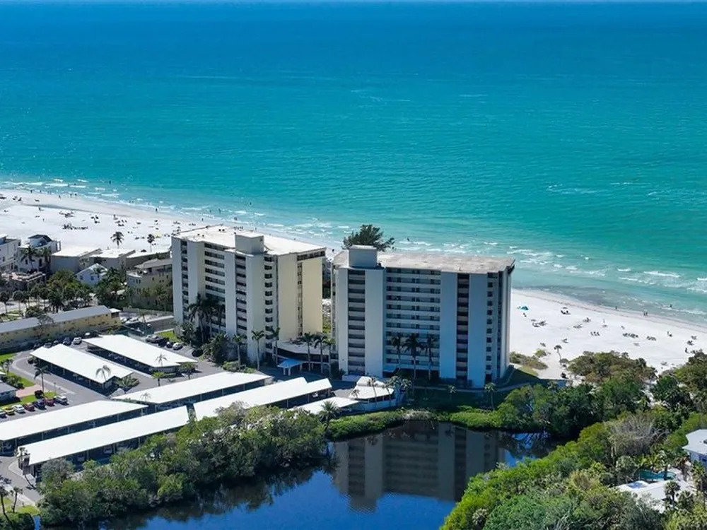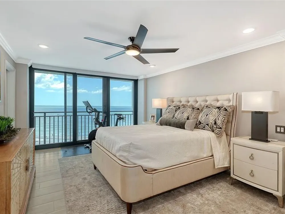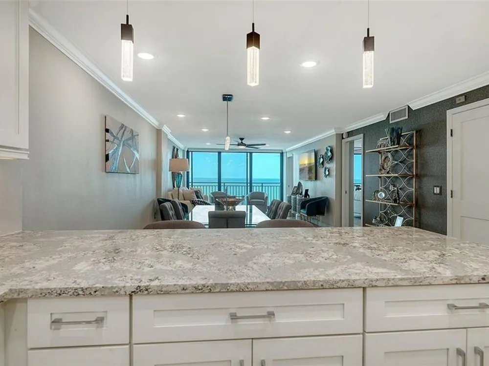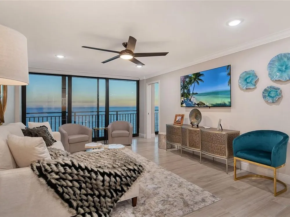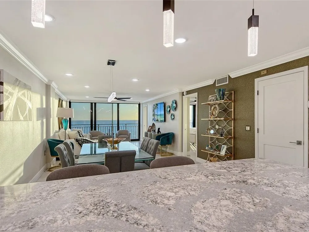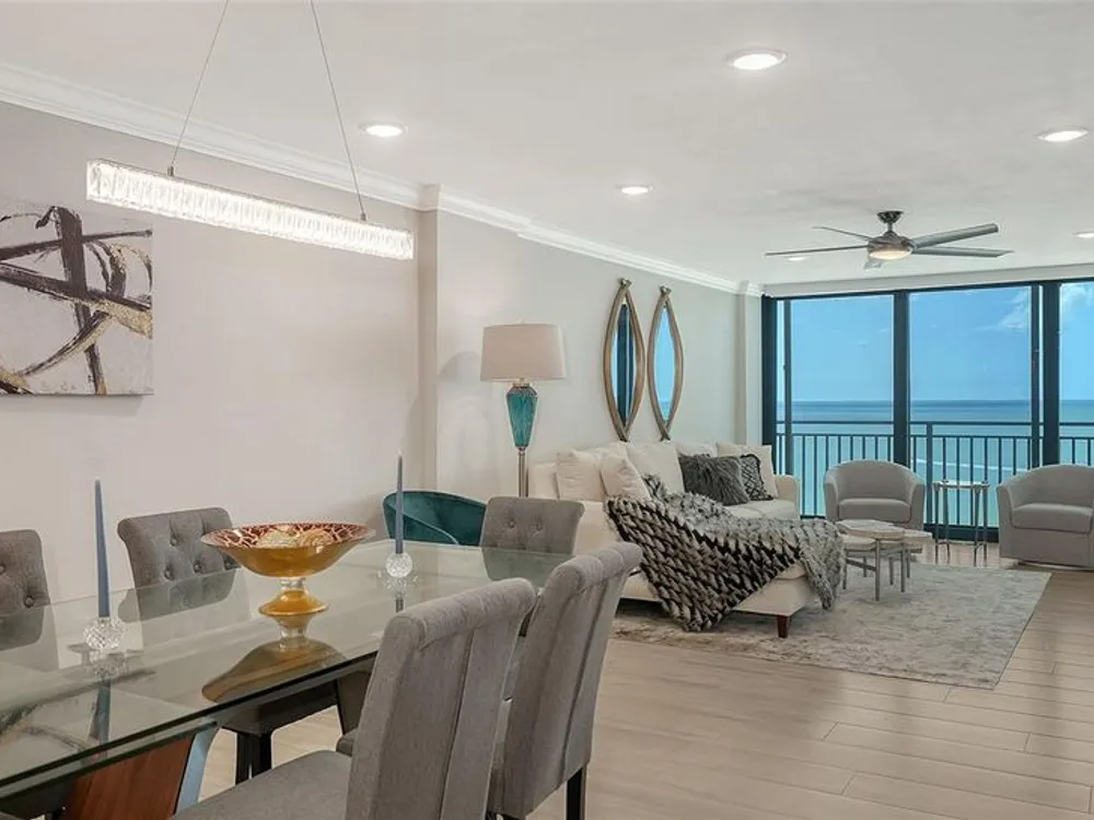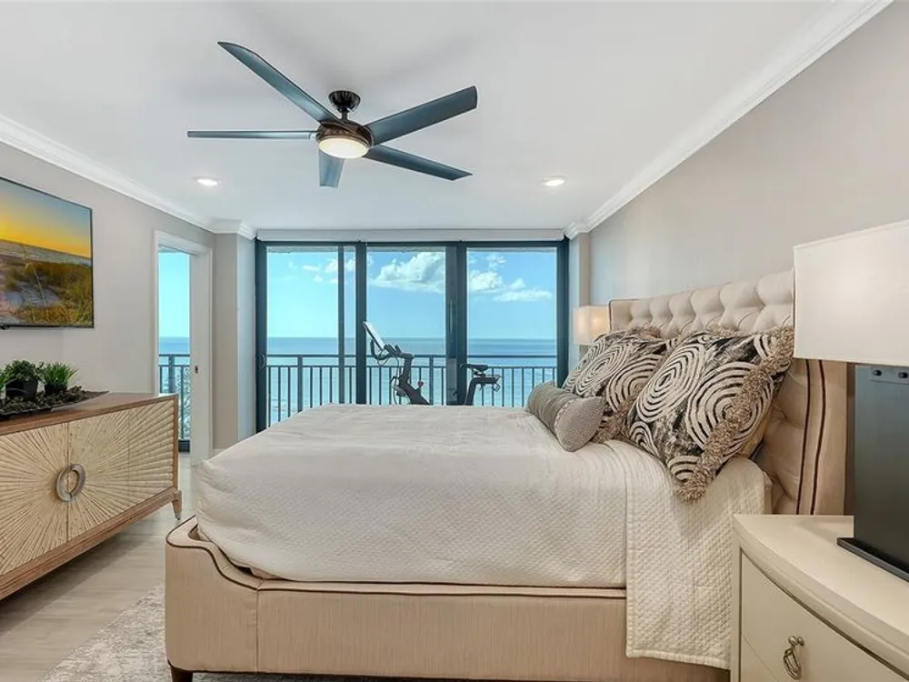 EXQUISITE GULF FRONT LUXURY! Just one floor from the top, this stunning, 11th floor, FULLY remodeled GULF FRONT tower residence offers a seamless blend of sophistication and coastal style against a background of breathtaking, unobstructed 180-degree views of the shimmering Gulf! A rare combination of sophistication, comfort, and coastal beauty, this residence defines modern Gulf front luxury living. Every detail of this 2022 remodel reflects the finest in contemporary design and craftsmanship. The open concept interior is graced with beautiful wide plank tile flooring, seamlessly connecting living, dining, and kitchen spaces to the endless blue horizon beyond. True floor-to-ceiling 2020 hurricane impact sliders open to mesmerizing Gulf vistas, enhanced by Hunter Douglas motorized light-filtering shades for effortless ambiance control. The gourmet kitchen is a showpiece featuring striking Cambria® quartz surfaces, a dramatic 8’ waterfall breakfast bar with dimmable pendant lighting, Bosch stainless appliances, 32 bottle wine refrigerator, fabulous under counter drawer microwave, and custom soft-close cabinetry. The serene primary suite is equally refined, featuring a spa-inspired ensuite tiled bath with Cambria® quartz dual vanity and glassed walk-in shower. The guest bath echoes the same refined elegance. FURNITURE AND FURNISHINGS including Robb & Stucky pieces are included with the sale of the property, minus a small exclusion list. Whispering Sands is a premiere 55+ Gulf front property offering resort style living with two heated pools, a clubhouse and a Gulf front Tower Lounge - both of which are currently undergoing complete remodeling - beachside Tiki Hut, grills, canoe/kayak storage, & 800’ of private beach on the Gulf. Ideally located right next to the dining and charm of Siesta Key Village, this unit is also just a short drive across the North Bridge to Sarasota’s wealth of world class visual and performing arts, theatre, and cultural attractions!