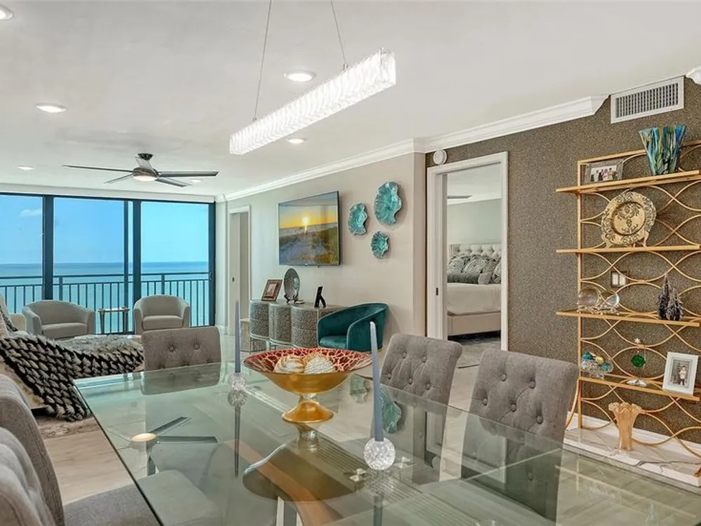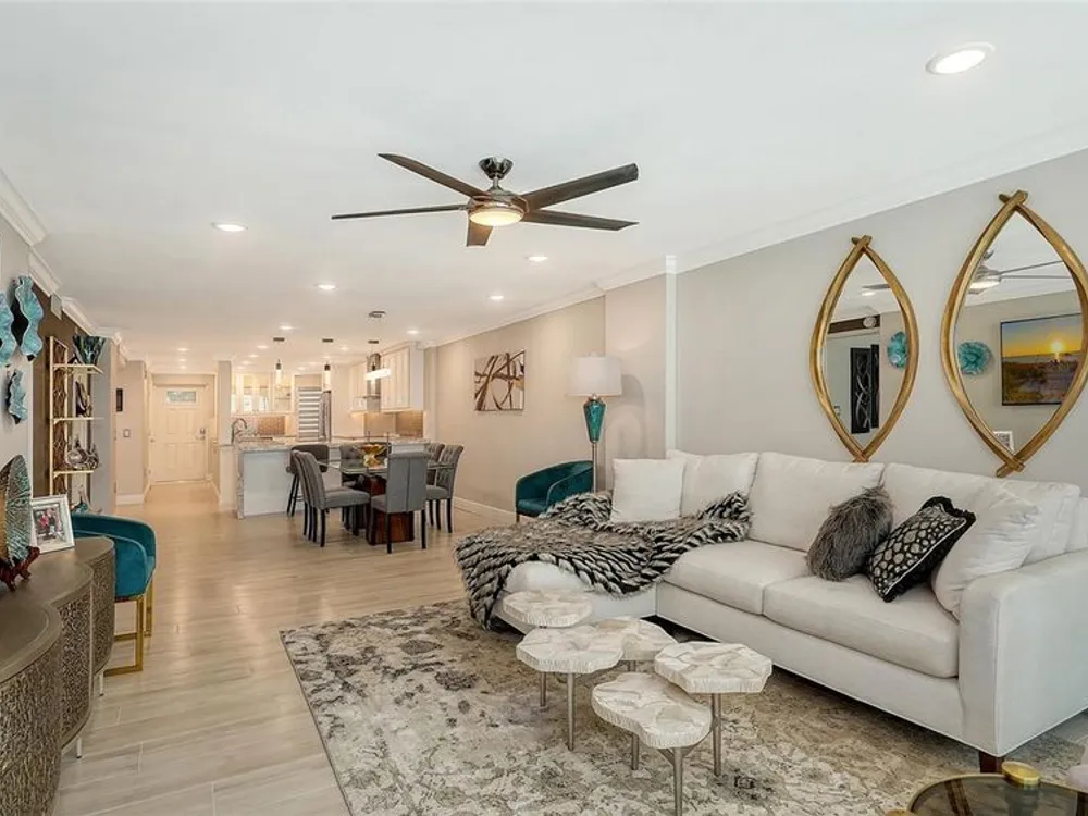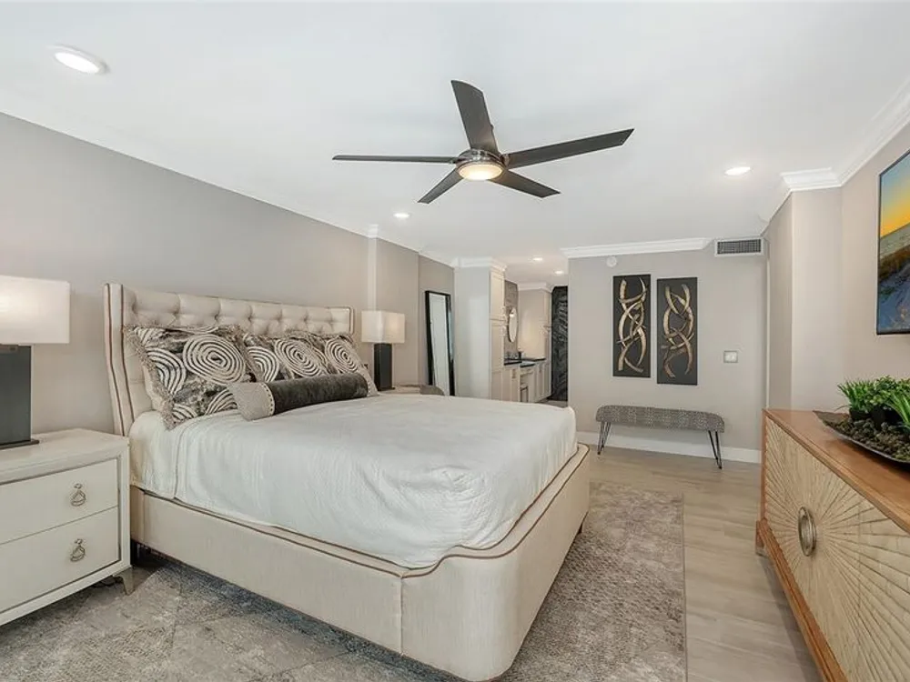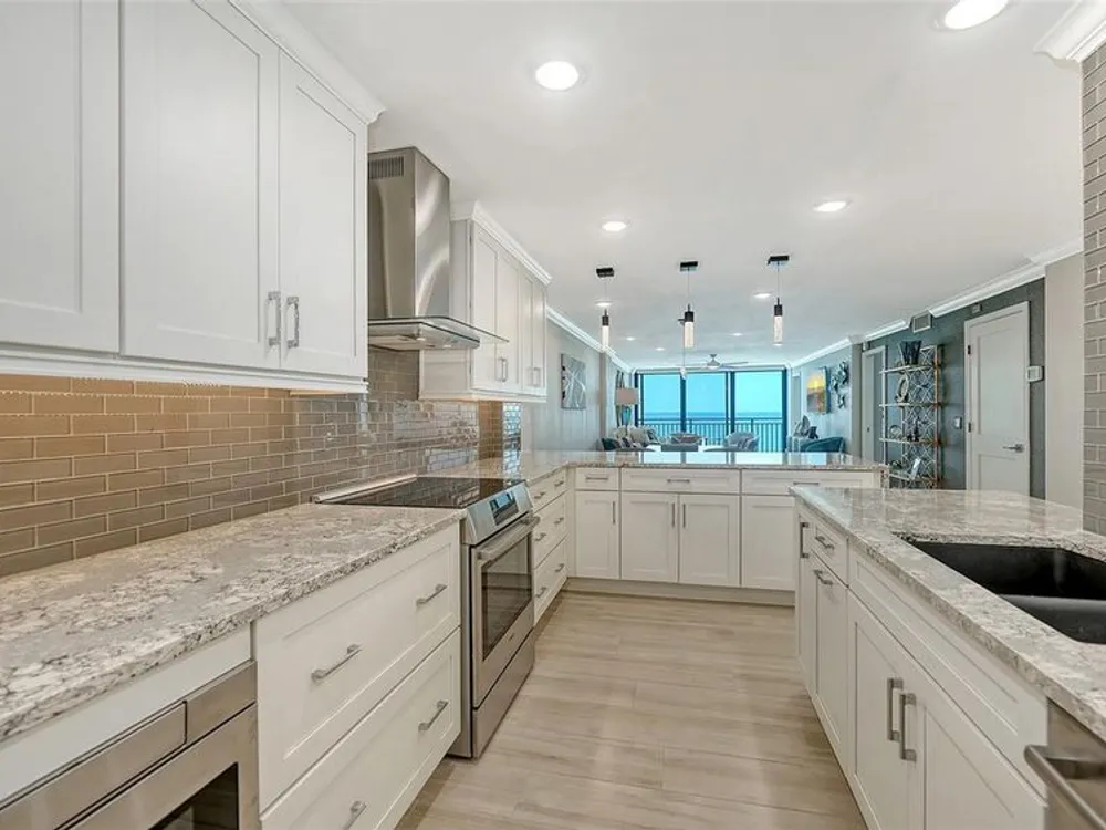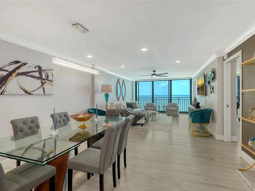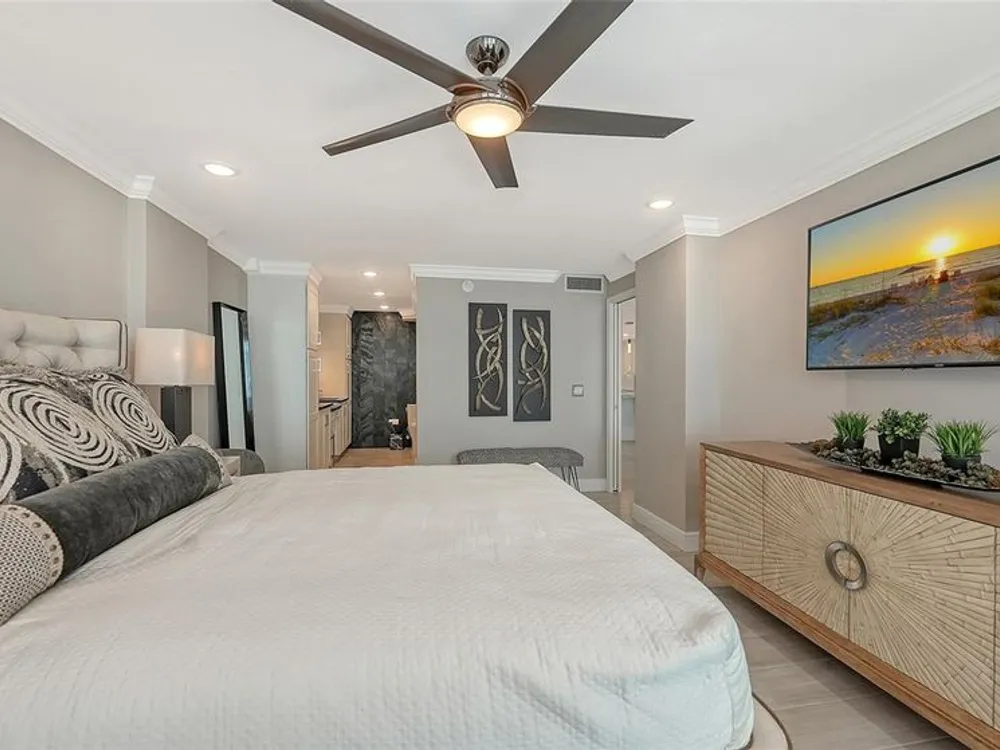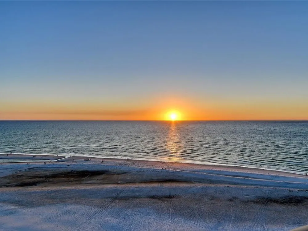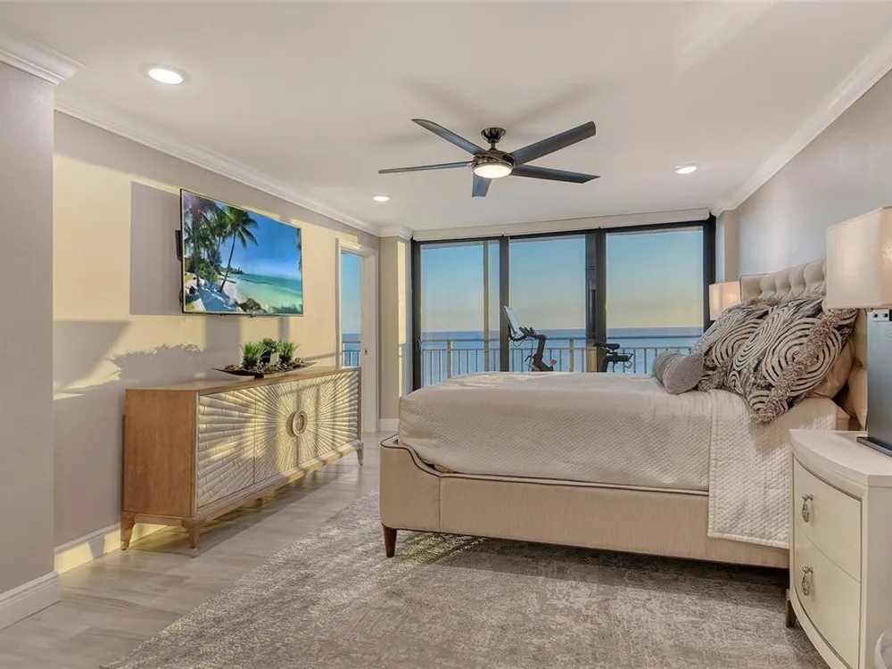 EXQUISITE GULF FRONT LUXURY! Just one floor from the top, this stunning, 11th floor, FULLY remodeled GULF FRONT tower residence offers a seamless blend of sophistication and coastal style against a background of breathtaking, unobstructed 180-degree views of the shimmering Gulf! A rare combination of sophistication, comfort, and coastal beauty, this residence defines modern Gulf front luxury living. Every detail of this 2022 remodel reflects the finest in contemporary design and craftsmanship. The open concept interior is graced with beautiful wide plank tile flooring, seamlessly connecting living, dining, and kitchen spaces to the endless blue horizon beyond. True floor-to-ceiling 2020 hurricane impact sliders open to mesmerizing Gulf vistas, enhanced by Hunter Douglas motorized light-filtering shades for effortless ambiance control. The gourmet kitchen is a showpiece featuring striking Cambria® quartz surfaces, a dramatic 8’ waterfall breakfast bar with dimmable pendant lighting, Bosch stainless appliances, 32 bottle wine refrigerator, fabulous under counter drawer microwave, and custom soft-close cabinetry. The serene primary suite is equally refined, featuring a spa-inspired ensuite tiled bath with Cambria® quartz dual vanity and glassed walk-in shower. The guest bath echoes the same refined elegance. FURNITURE AND FURNISHINGS including Robb & Stucky pieces are included with the sale of the property, minus a small exclusion list. Whispering Sands is a premiere 55+ Gulf front property offering resort style living with two heated pools, a clubhouse and a Gulf front Tower Lounge - both of which are currently undergoing complete remodeling - beachside Tiki Hut, grills, canoe/kayak storage, & 800’ of private beach on the Gulf. Ideally located right next to the dining and charm of Siesta Key Village, this unit is also just a short drive across the North Bridge to Sarasota’s wealth of world class visual and performing arts, theatre, and cultural attractions!