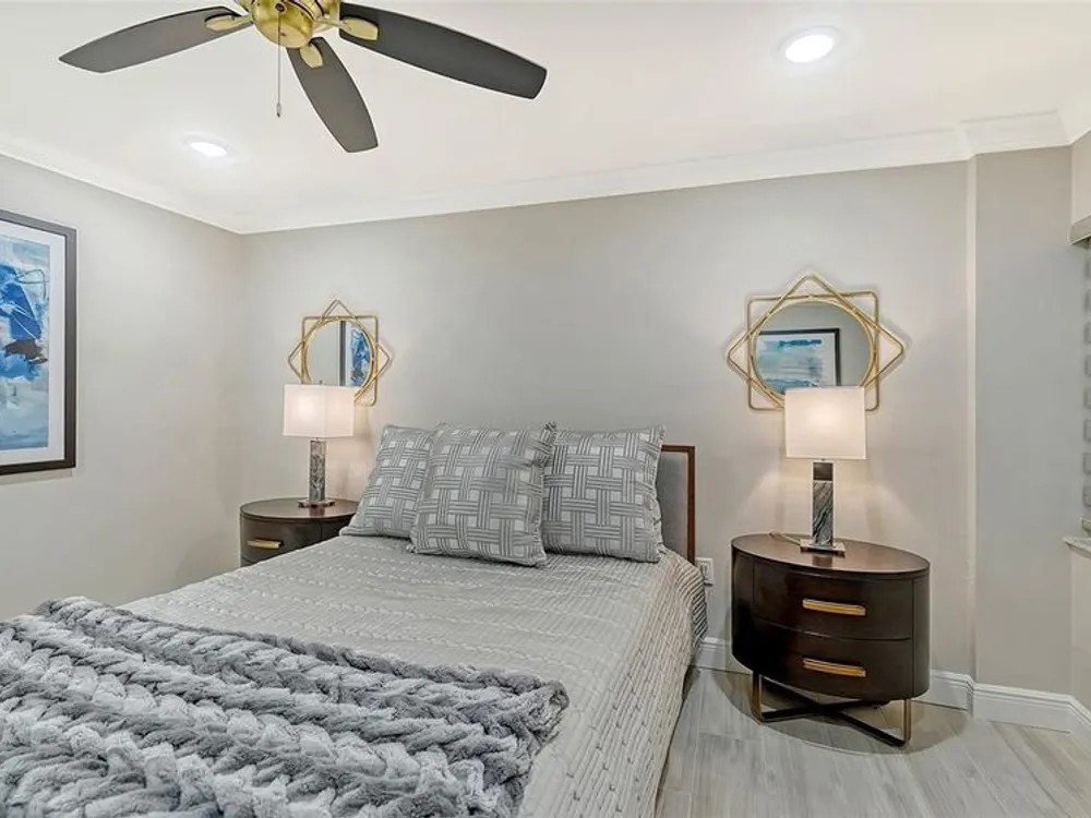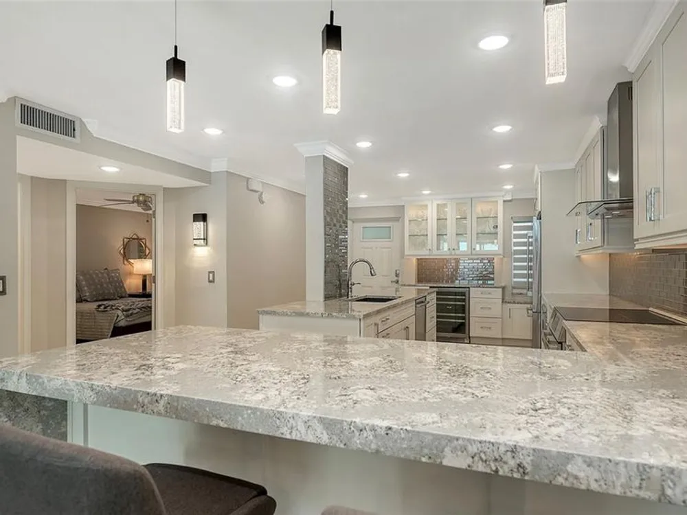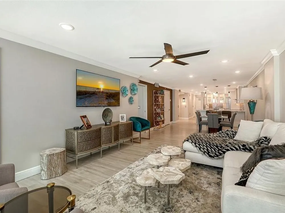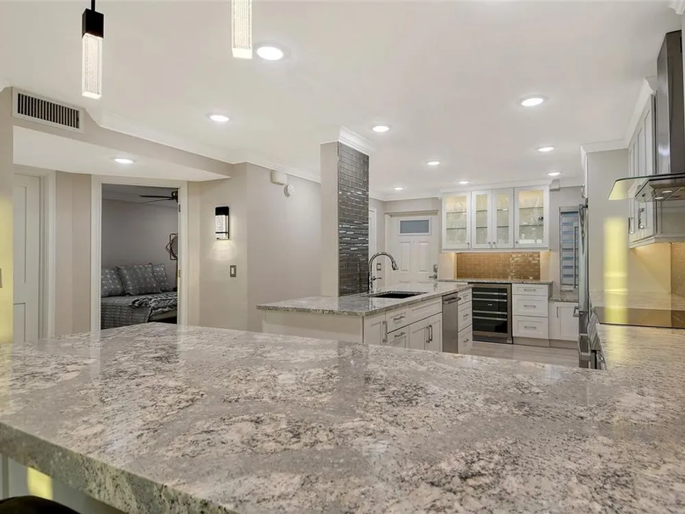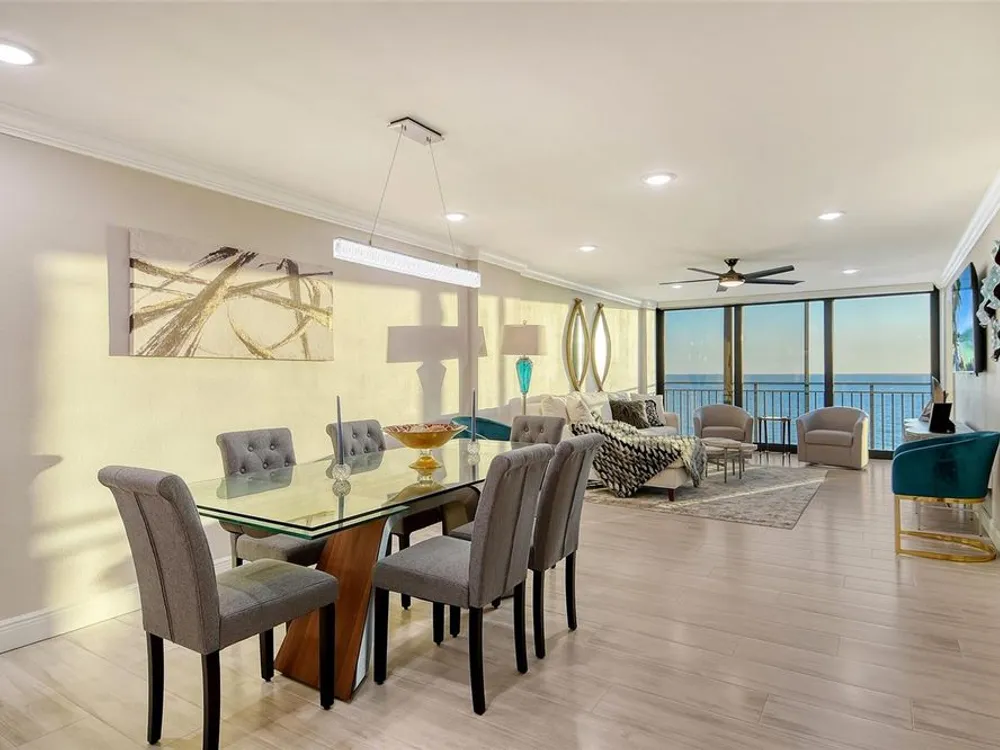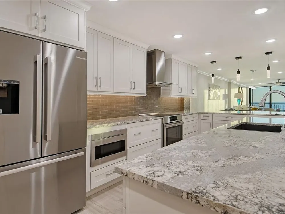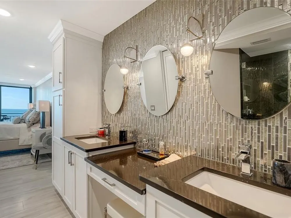 EXQUISITE GULF FRONT LUXURY! Just one floor from the top, this stunning, 11th floor, FULLY remodeled GULF FRONT tower residence offers a seamless blend of sophistication and coastal style against a background of breathtaking, unobstructed 180-degree views of the shimmering Gulf! A rare combination of sophistication, comfort, and coastal beauty, this residence defines modern Gulf front luxury living. Every detail of this 2022 remodel reflects the finest in contemporary design and craftsmanship. The open concept interior is graced with beautiful wide plank tile flooring, seamlessly connecting living, dining, and kitchen spaces to the endless blue horizon beyond. True floor-to-ceiling 2020 hurricane impact sliders open to mesmerizing Gulf vistas, enhanced by Hunter Douglas motorized light-filtering shades for effortless ambiance control. The gourmet kitchen is a showpiece featuring striking Cambria® quartz surfaces, a dramatic 8’ waterfall breakfast bar with dimmable pendant lighting, Bosch stainless appliances, 32 bottle wine refrigerator, fabulous under counter drawer microwave, and custom soft-close cabinetry. The serene primary suite is equally refined, featuring a spa-inspired ensuite tiled bath with Cambria® quartz dual vanity and glassed walk-in shower. The guest bath echoes the same refined elegance. FURNITURE AND FURNISHINGS including Robb & Stucky pieces are included with the sale of the property, minus a small exclusion list. Whispering Sands is a premiere 55+ Gulf front property offering resort style living with two heated pools, a clubhouse and a Gulf front Tower Lounge - both of which are currently undergoing complete remodeling - beachside Tiki Hut, grills, canoe/kayak storage, & 800’ of private beach on the Gulf. Ideally located right next to the dining and charm of Siesta Key Village, this unit is also just a short drive across the North Bridge to Sarasota’s wealth of world class visual and performing arts, theatre, and cultural attractions!