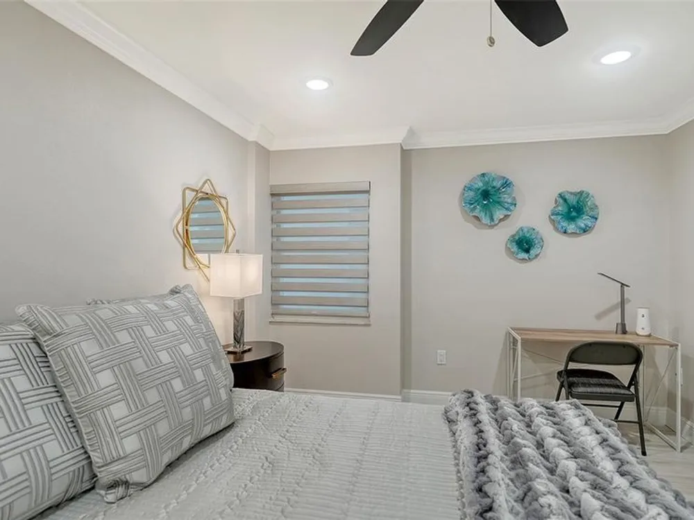 - Ceiling Fan(s), Crown Molding, Open Floorplan, Main Level Primary, Solid-Wood Cabinets, Stone Counters, Thermostat, Walk-In Closet(s), Window Treatments