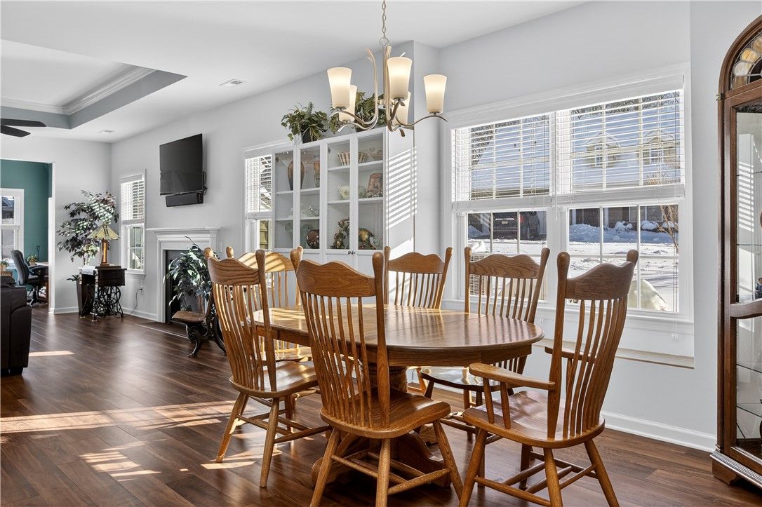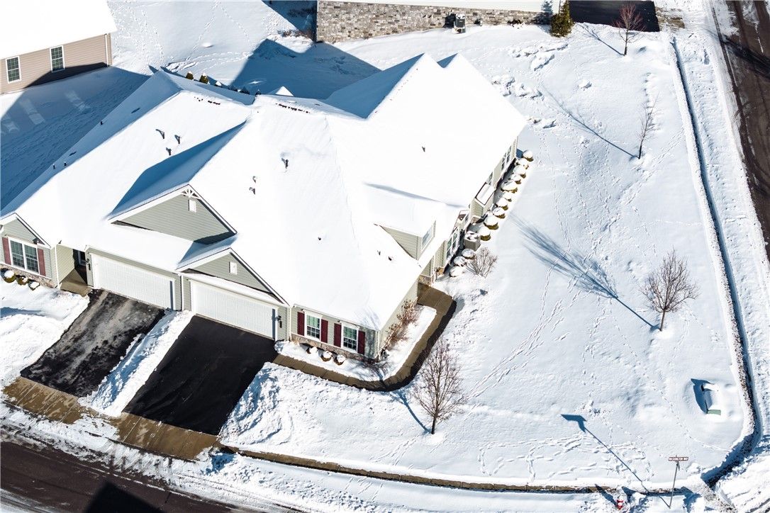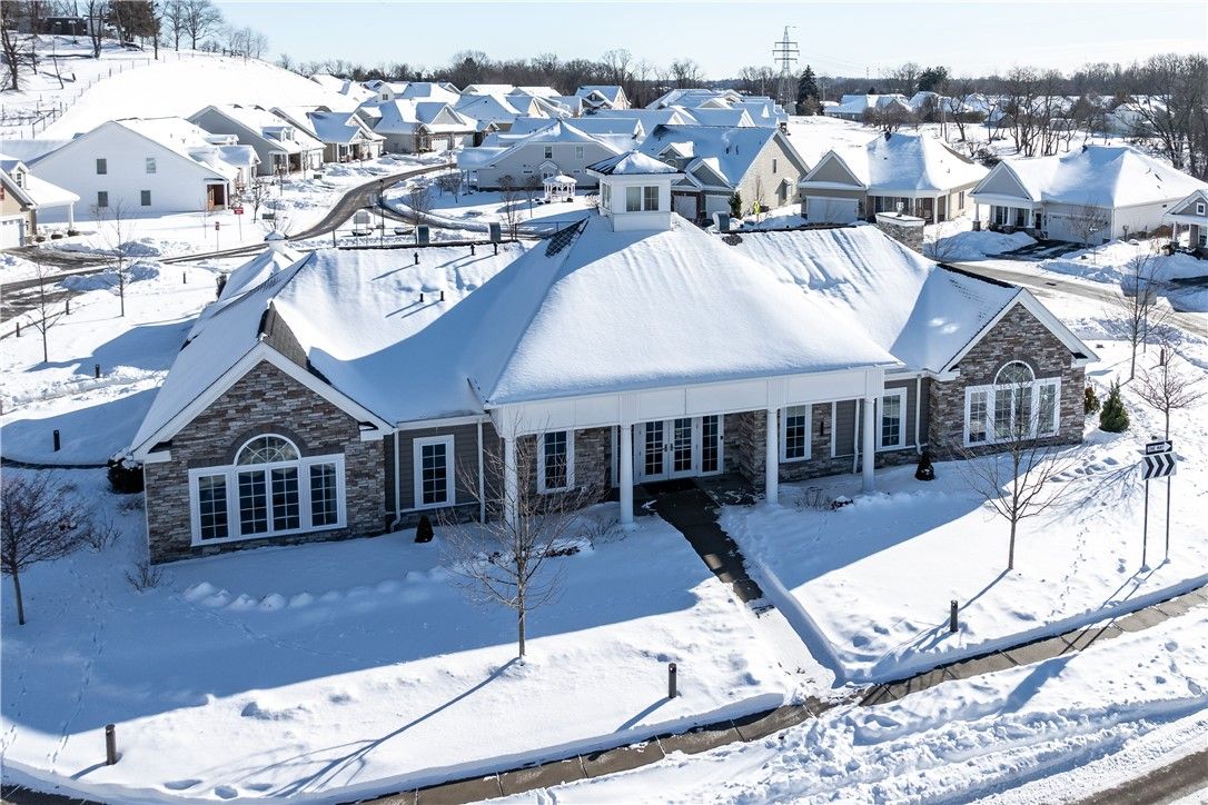 Welcome to this beautifully updated corner patio home, designed for comfort, style, and convenience. A rounded corner walkway leads to the inviting zero-entry front entrance, setting the tone for the quality found throughout. This open-concept floorplan offers two bedrooms, two full bathrooms and a two-car garage, all thoughtfully designed. The eat-in kitchen featuring Cambria Buckingham quartz countertops, newer stainless-steel appliances, Moen touch water faucet, pendant lighting, recessed lighting, soft-close drawers, and abundant cabinet space is well-suited for everyday living and entertaining. The living room showcases enhanced vinyl plank flooring, a Heatilator fireplace with remote, tray ceiling and ceiling fan, flowing seamlessly into the sunroom where natural light pours in through expansive windows. French doors open to the covered patio, creating an inviting indoor-outdoor living space for relaxing or hosting guests. French doors open to the vaulted primary suite, offering an additional 4 feet of expanded space, along with two walk-in closets with custom organizers. The spa-like primary bath features gorgeous tile flooring, a tiled walk-in shower with bench, marble vanity, and linen closet. The second full bath is equally impressive with a tile surround walk-in shower, tile accent wall, granite vanity, and dual-flush commode. Additional highlights include the main-level laundry room with pocket door, tile flooring & laundry tub with front loading washer and dryer. This smart home includes a Nest thermostat, Ring doorbell with camera, home security system with camera system & temperature sensor, remote front door lock, remote garage door opener and remote water sensor and shutoff. The energy efficient heat pump furnace and upgraded insulation were thoughtfully added as well as nightlight electrical switches and timers on both exhaust fans. You will appreciate the spacious 18x13 storage area above the garage! Enjoy a low-maintenance lifestyle with access to the community clubhouse featuring a fitness center, pool, hot tub, billiards room and pickleball courts, ideal for both relaxation and recreation. This home is truly move-in ready and offers a blend of luxury, technology, and easy living.