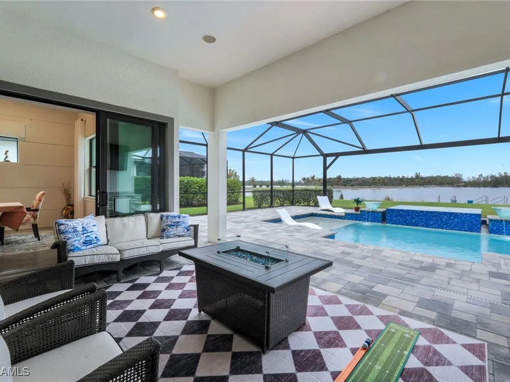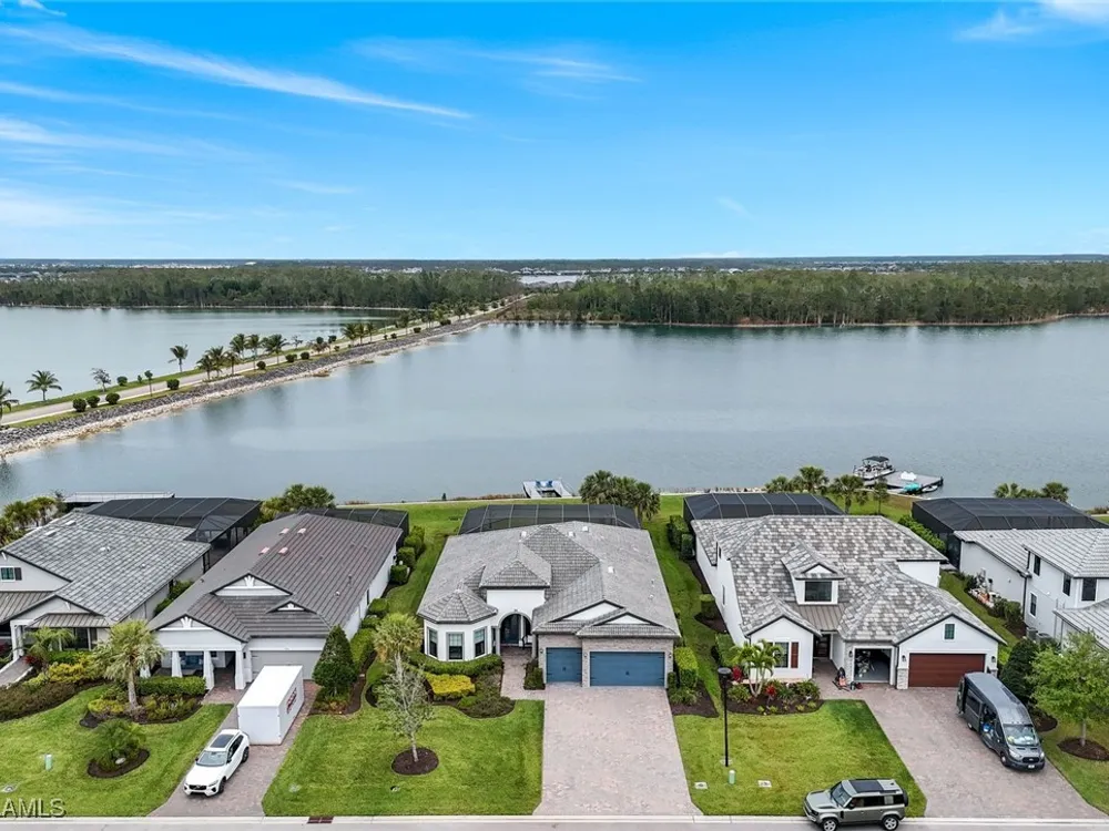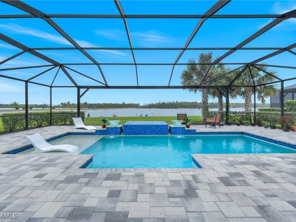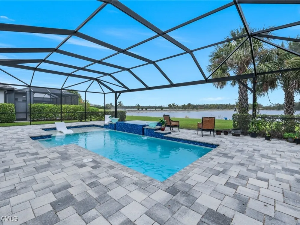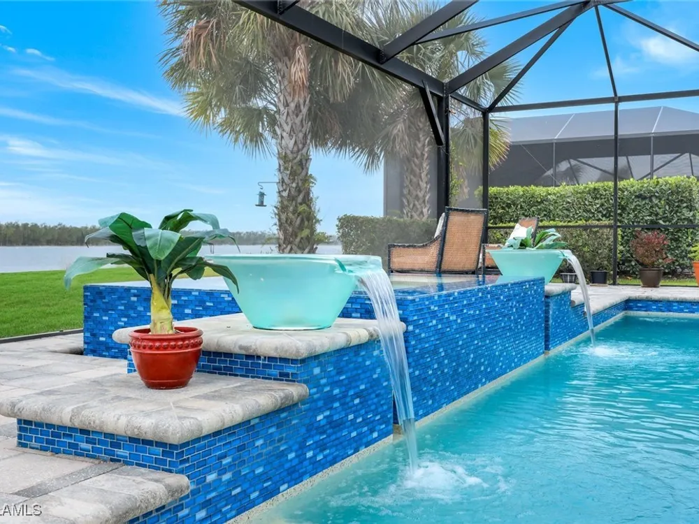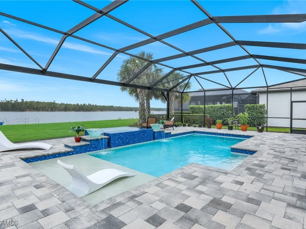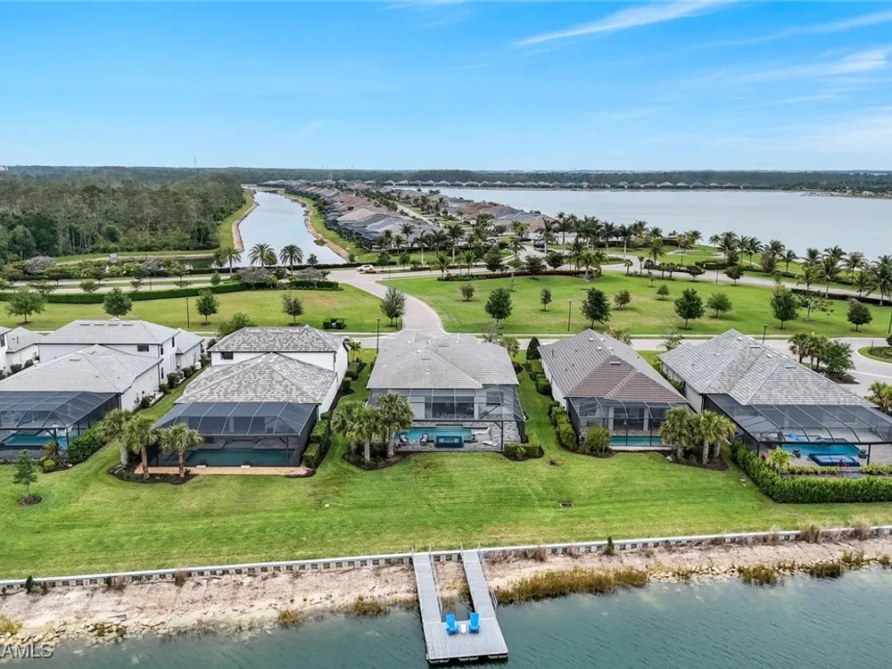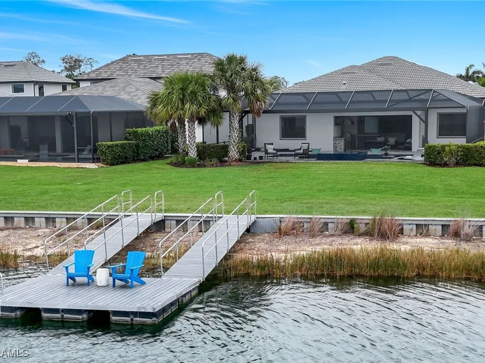Experience LUXURY redefined in this FORMER Pinnacle MODEL home, perfectly positioned on W-I-D-E Indigo Lake with a private DOCK for boating enthusiasts! Offering 3 bedrooms PLUS DEN, 3 baths, and a spacious 3-car garage with additional storage, this residence is thoughtfully designed with upscale enhancements. The GOURMET KITCHEN showcases stainless steel appliances, a WINE COOLER, quartz countertops, a designer tile backsplash, and WHITE CABINETRY. Each guest room features impeccable attention to detail, offering a bright and inviting retreat where COMFORT meets STYLE. The spacious DEN/OFFICE ensures you can concentrate on business or watch your stocks in the lap of luxury. Stylish details like coffered ceilings add architectural charm, while IMPACT WINDOWS and DOORS provide peace of mind. ZERO-CORNER SLIDERS disappear, revealing an EXPANSIVE lanai that feels like a five-star resort destination. The CUSTOM POOL and SPA with a tranquil WATERFALL FEATURE are framed by a PANORAMIC SCREEN enclosure, offering uninterrupted LAKE VIEWS. The OUTDOOR KITCHEN is perfect for entertaining, while the southeast orientation ensures SUN-DRENCHED mornings and serene afternoons. Residents of WildBlue enjoy resort-style amenities, including a CLUBHOUSE with DINING options, a fitness center, PICKLEBALL, tennis, bocce courts, and WATER ACTIVITIES like kayaking and boating. There's also a fishing club, book club, canoe/kayak club, line dancing, board games, bingo, poker, mahjong, and bridge. All this is just minutes from RSW International Airport, Fort Myers's vibrancy, and Naples' fun and sophistication. In addition to a luxurious waterfront lifestyle, this home and community offer sumptuous living, easy accessibility, a clubhouse with a full social calendar, and an exceptional investment opportunity!