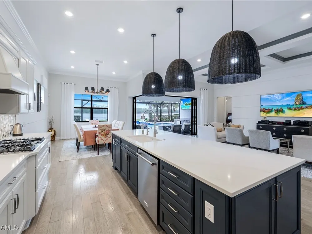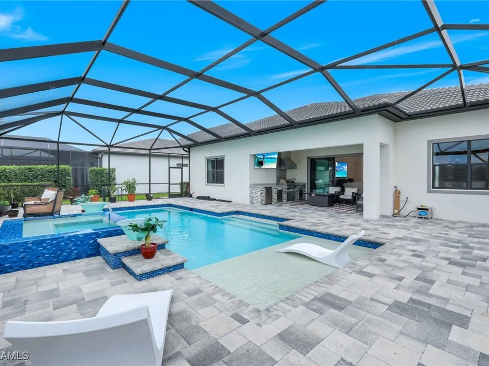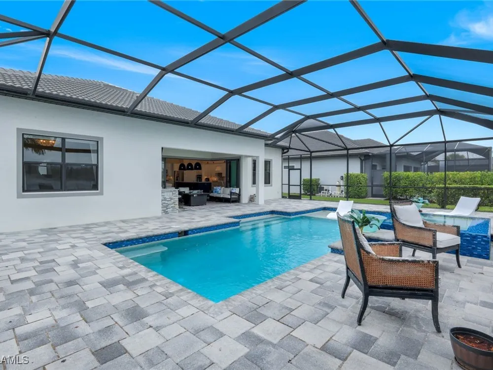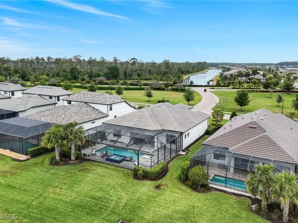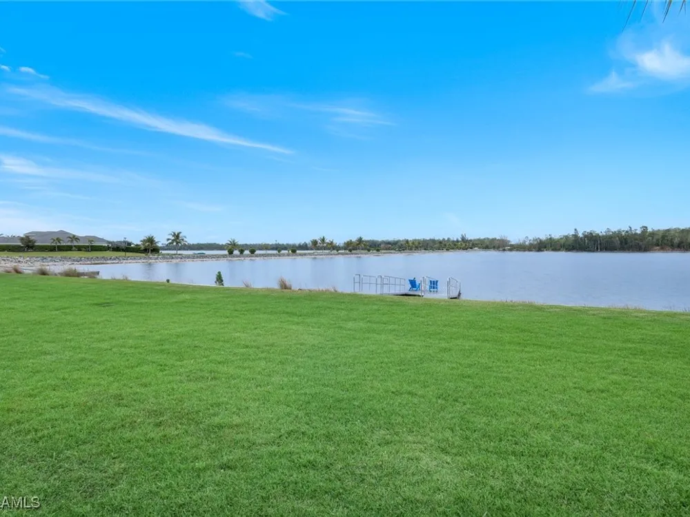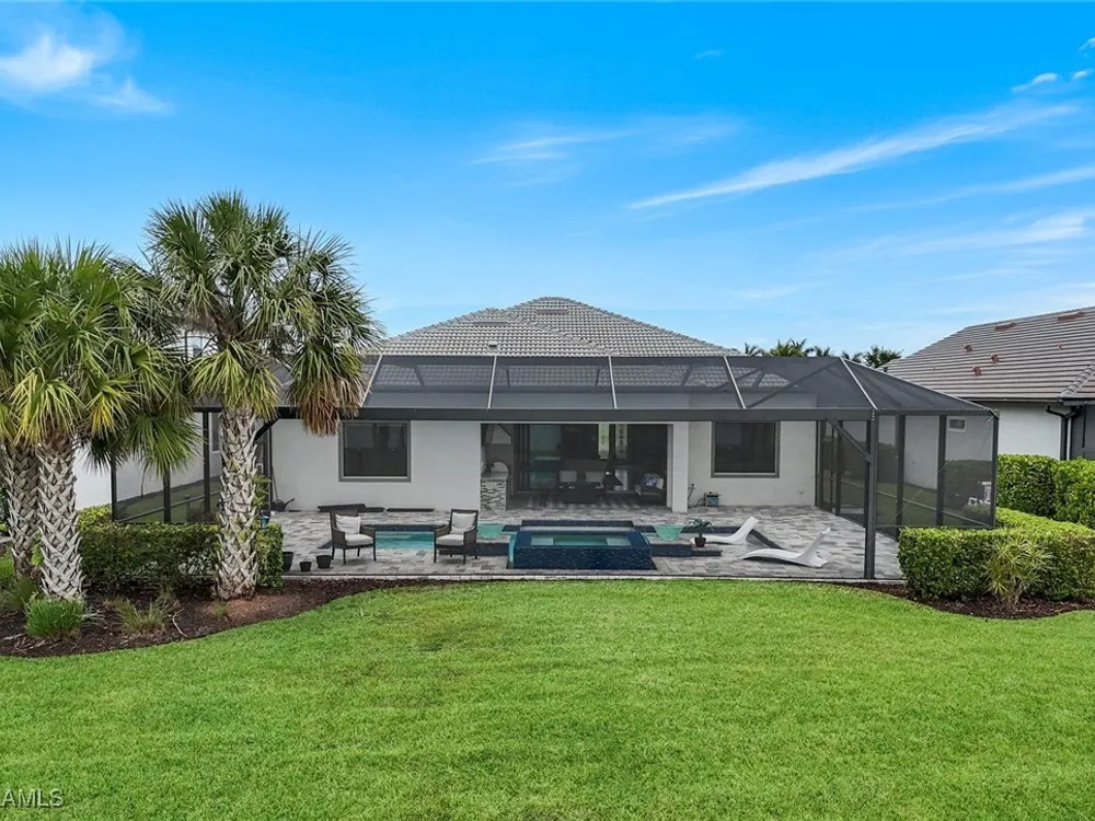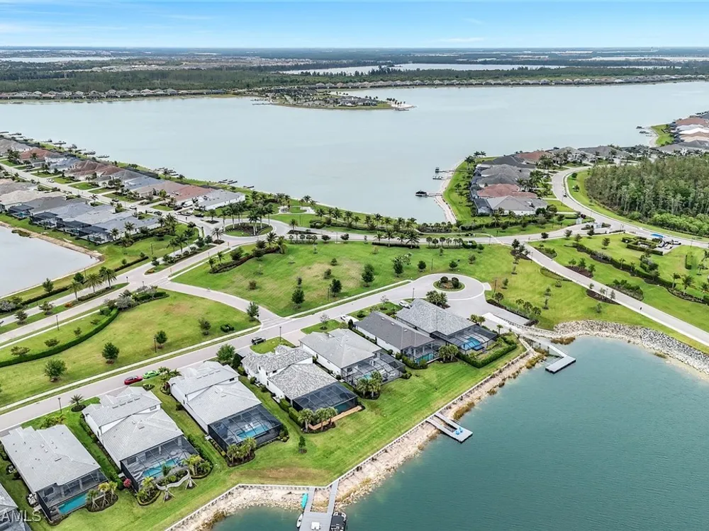 Experience LUXURY redefined in this FORMER Pinnacle MODEL home, perfectly positioned on W-I-D-E Indigo Lake with a private DOCK for boating enthusiasts! Offering 3 bedrooms PLUS DEN, 3 baths, and a spacious 3-car garage with additional storage, this residence is thoughtfully designed with upscale enhancements. The GOURMET KITCHEN showcases stainless steel appliances, a WINE COOLER, quartz countertops, a designer tile backsplash, and WHITE CABINETRY. Each guest room features impeccable attention to detail, offering a bright and inviting retreat where COMFORT meets STYLE. The spacious DEN/OFFICE ensures you can concentrate on business or watch your stocks in the lap of luxury. Stylish details like coffered ceilings add architectural charm, while IMPACT WINDOWS and DOORS provide peace of mind. ZERO-CORNER SLIDERS disappear, revealing an EXPANSIVE lanai that feels like a five-star resort destination. The CUSTOM POOL and SPA with a tranquil WATERFALL FEATURE are framed by a PANORAMIC SCREEN enclosure, offering uninterrupted LAKE VIEWS. The OUTDOOR KITCHEN is perfect for entertaining, while the southeast orientation ensures SUN-DRENCHED mornings and serene afternoons. Residents of WildBlue enjoy resort-style amenities, including a CLUBHOUSE with DINING options, a fitness center, PICKLEBALL, tennis, bocce courts, and WATER ACTIVITIES like kayaking and boating. There's also a fishing club, book club, canoe/kayak club, line dancing, board games, bingo, poker, mahjong, and bridge. All this is just minutes from RSW International Airport, Fort Myers's vibrancy, and Naples' fun and sophistication. In addition to a luxurious waterfront lifestyle, this home and community offer sumptuous living, easy accessibility, a clubhouse with a full social calendar, and an exceptional investment opportunity!