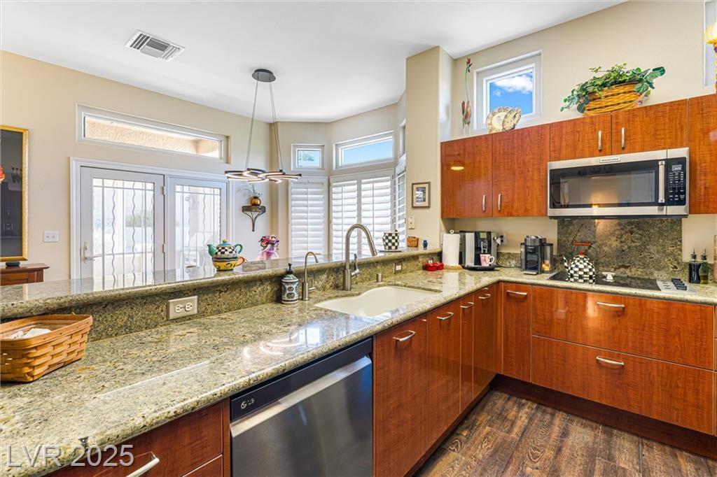 Step Into Style & Sophistication on one of the Largest Lots in Sun City Summerlin! Welcome to a RARE FIND! Nearly ½ acre on a premium cul-de-sac lot with partial views of the Strip, golf course, and mountains from the backyard. The heart of this home is a chef’s dream kitchen with $28,000 in custom luxury cabinetry and sleek upgraded stainless appliances that set the stage for unforgettable meals and gatherings. Throughout the home, stunning engineered wood floors flow seamlessly, complemented by elegant plantation shutters and Andersen windows that flood each room with natural light. Add in energy-saving solar panels, a smart thermostat, and countless thoughtful upgrades—this isn’t just a house, it’s the Sun City lifestyle you’ve been waiting for. Garage features epoxy floors, EV charger, and workshop. The backyard is fully fenced with a full-length covered patio—perfect for entertaining & relaxing. Don’t just imagine it—come see it before it’s gone! Schedule your private tour today!