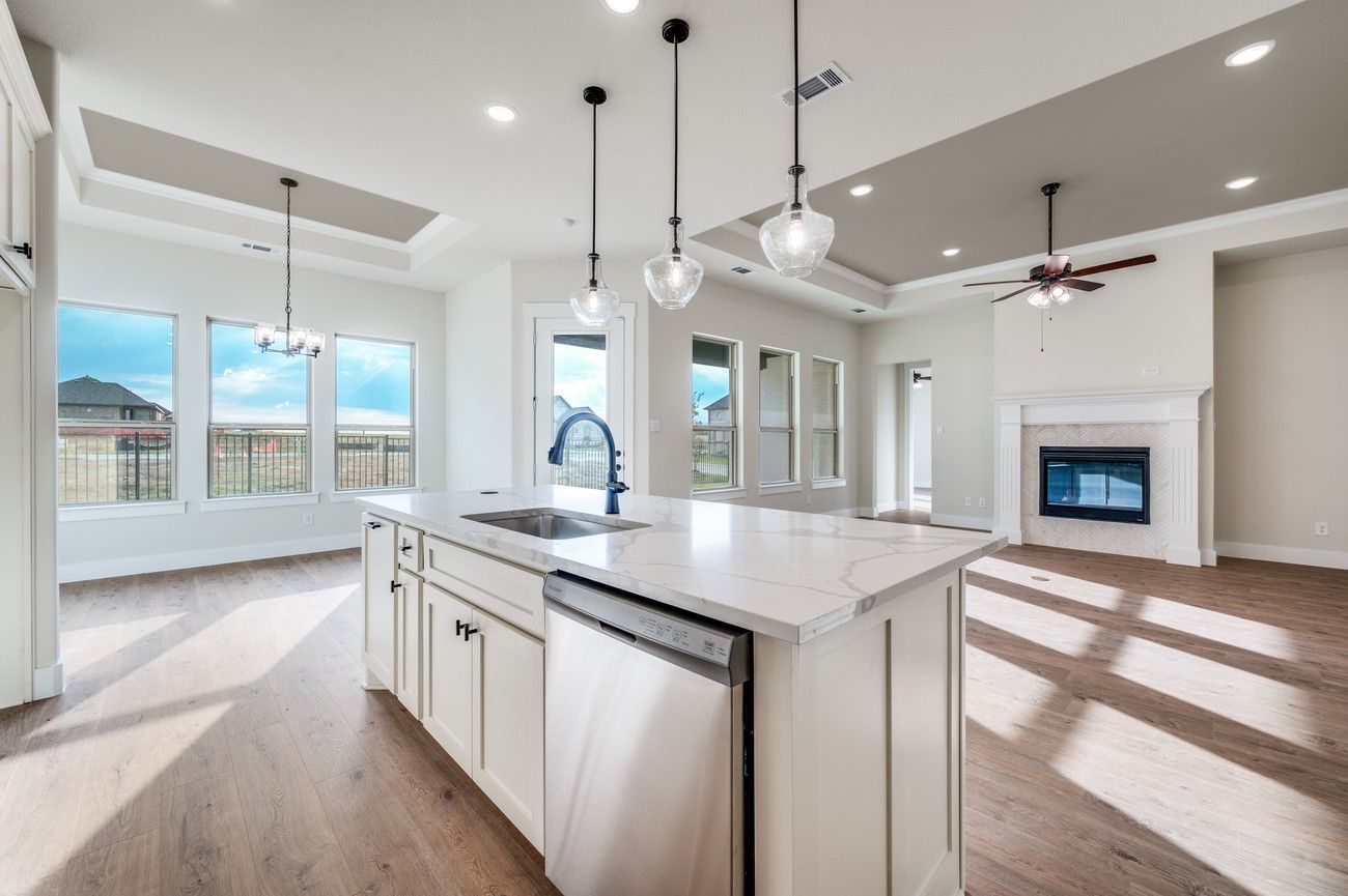 MLS# 21026067 - Built by Ladera Living - Ready Now! ~ The Arabella , Corner Lot Living with a Lake Lifestyle Welcome to the Arabella—a beautifully designed, move-in ready home in Ladera Living Little Elm, perfectly positioned on a premium corner homesite. With 2 bedrooms, 2 baths, a private study, and 1,877 square feet, this home offers the ideal balance of comfort, style, and low-maintenance living. Step inside to a bright, open-concept layout where soaring ceilings and a wall of windows fill the home with natural light. The kitchen, dining, and living areas flow effortlessly together, creating a warm, inviting space perfect for gathering with friends or enjoying a quiet evening by the cozy gas log fireplace. The kitchen is designed for both function and connection, featuring generous counter space, a center island with breakfast bar, and a gas cooktop—making everyday living feel easy. The private primary suite offers a peaceful retreat with dual vanities, an oversized walk-in shower, and a spacious walk-in closet. A separate guest suite with its own bath ensures comfort and privacy for visitors, while a dedicated study provides flexible space for work or hobbies. Step outside to your covered patio with outdoor fireplace—your personal spot to relax year-round. At Ladera Living Little Elm, enjoy a lock-and-leave lifestyle on the shores of Lake Lewisville, with resort-style amenities, a vibrant HUB, and a connected, active community designed for what’s next.