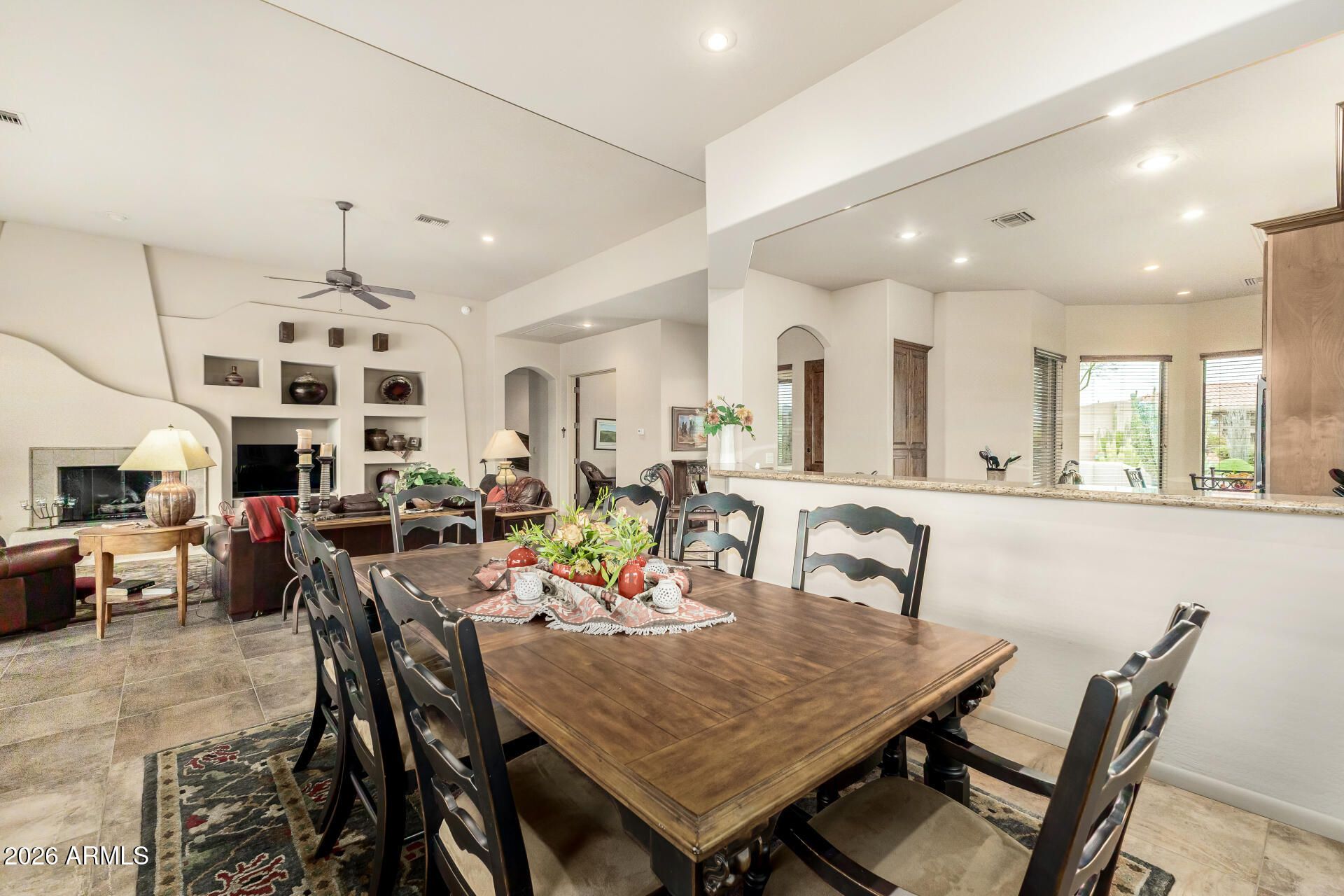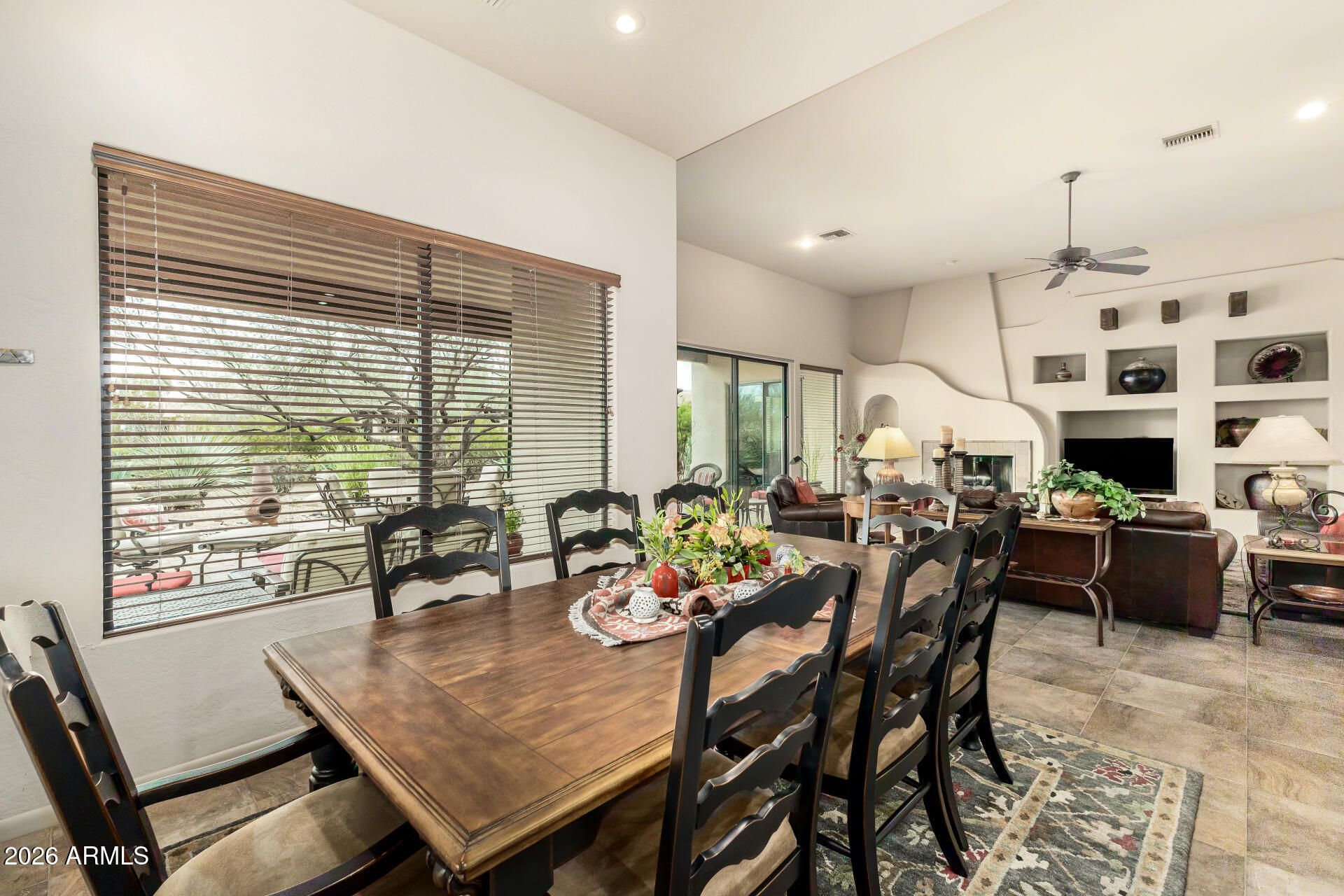 Discover the allure of this exquisite 2-bedroom + office territorial-style home with a 2.5-car garage & timeless curb appeal. Inside, sleek tile floors guide you into a welcoming living room adorned with elegant wall niches and a cozy gas fireplace perfect for relaxing evenings. Enjoy intimate dinners in the formal dining area, then gather in the beautifully appointed kitchen featuring rich wood cabinetry, granite counters, tile backsplash, wall ovens, essential appliances, a center island, breakfast bar, and a sunny breakfast nook. The serene primary suite offers direct backyard access and a private bath with dual sinks, a soaking tub, and a spacious walk-in closet. A versatile den makes an ideal office or creative space, while the laundry room includes a convenient utility sink... Outdoors, unwind under the covered patio surrounded by desert plantings in the sizable backyard. This dream home is ready to inspire lasting memories! Don't miss out!