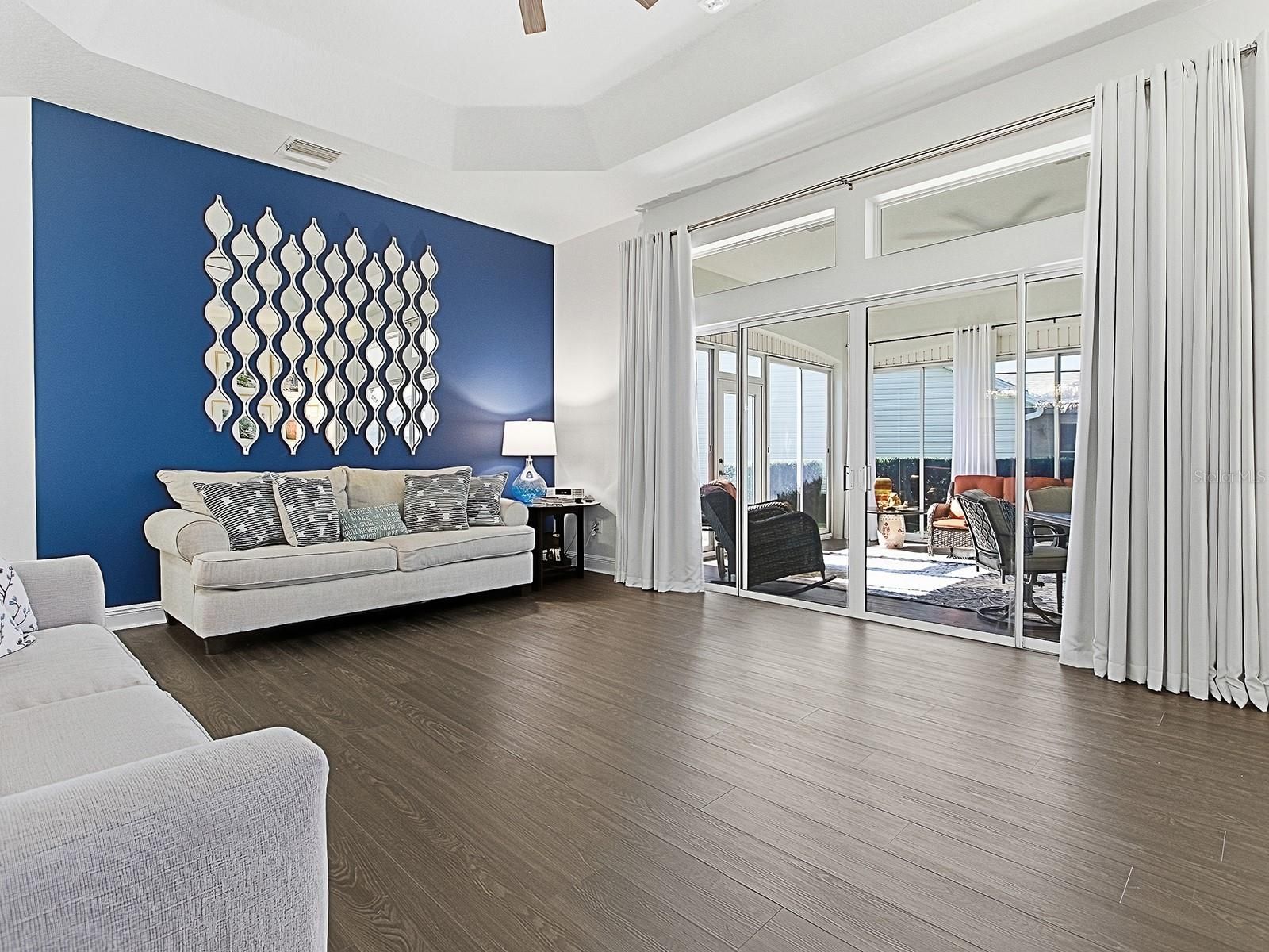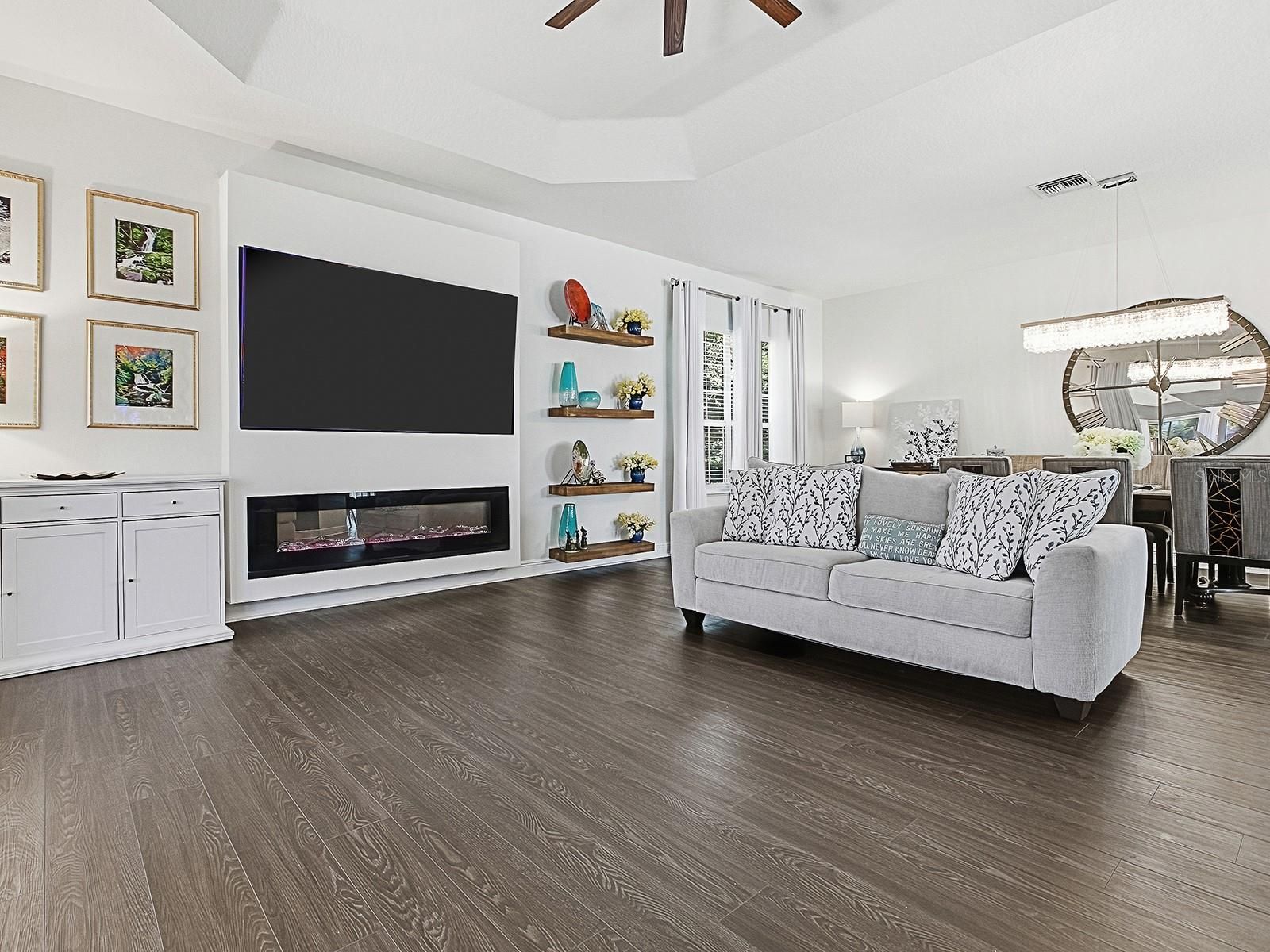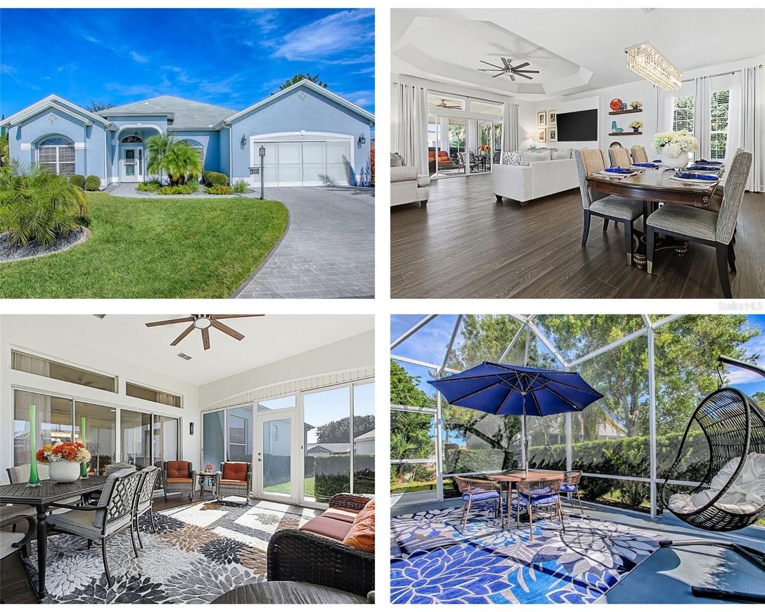 Under contract-accepting backup offers. Bond Paid! This beautifully maintained Rancho Mirage Premier home is perfectly positioned on a quiet cul-de-sac in the desirable Village of Palo Alto. Step inside to discover neutral tones, HIGH CEILINGS throughout, and elegant tray ceilings in both the living room and primary suite. Thoughtful updates include NEW fans and lighting, luxury vinyl plank flooring (NO CARPET), and a built-in electric fireplace for cozy ambiance. The newly updated kitchen impresses with QUARTZ countertops, white stair-step cabinetry, a tile backsplash, newer appliances, and an open layout that flows seamlessly into the living and dining areas. A solar tube between the dining and living rooms fills the space with beautiful natural light. Just off the spacious living room, enjoy the ENCLOSED LANAI with heat and air and wood-look tile flooring, perfect for relaxing year-round. The spacious primary suite features dual closets, a private BIRDCAGED PATIO, and a luxurious ensuite bath with GRANITE countertops, a tiled shower with seamless glass door, and a river rock floor. The stretched garage provides ample room for two cars and a golf cart, featuring painted floors, a screen door, pull-down attic stairs, and an extra storage closet with a utility sink. The second bedroom is located at the front of the home (currently without a closet but with space to add one) and is presently being used as a den. The third guest bedroom is spacious and has a double-door closet. The guest bathroom has been updated with GRANITE countertop and tub/shower combo with glass door. The laundry room is equipped with storage cabinets and a front-load washer and dryer on pedestals. Other updates include: Roof (2020), HVAC (2015). This home has a VA assumable loan at a low interest rate. (Preapproval required) Conveniently located between Spanish Springs Town Square and Lake Sumter Landing Market Square, close to Tierra Del Sol Country Club and Championship Golf Course, Hacienda Regional Recreation Center, The Villages Regional Hospital, 441/27 Shopping Corridor, and 466. Come fall in love with this lovely home!