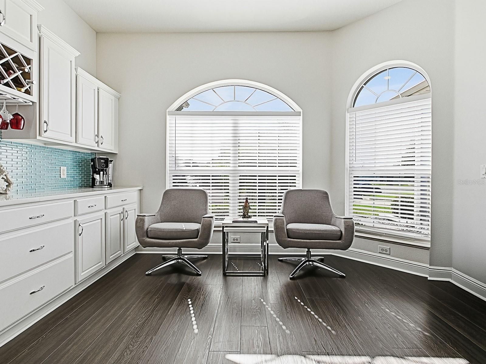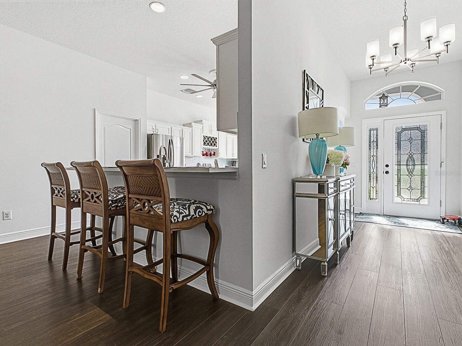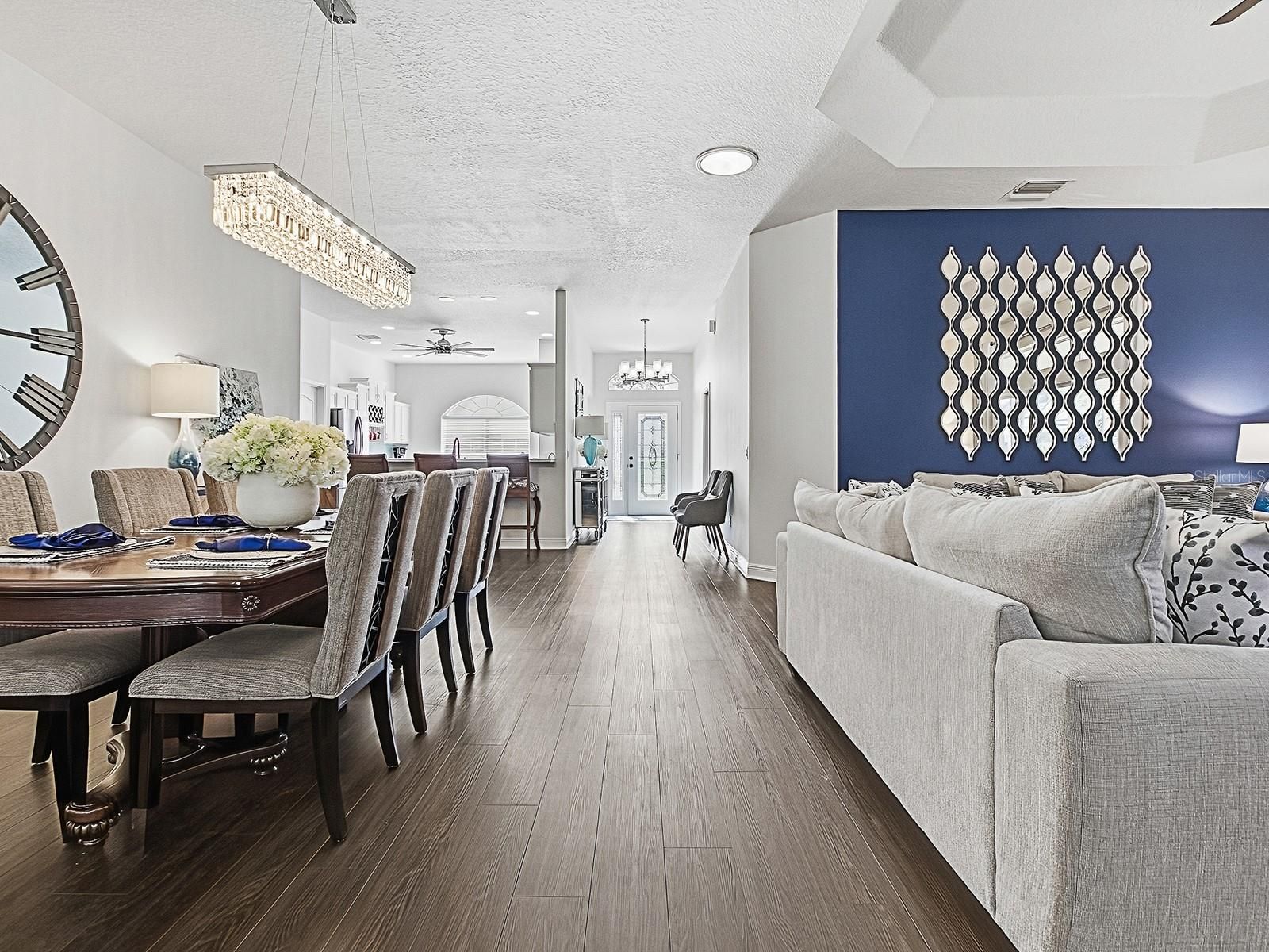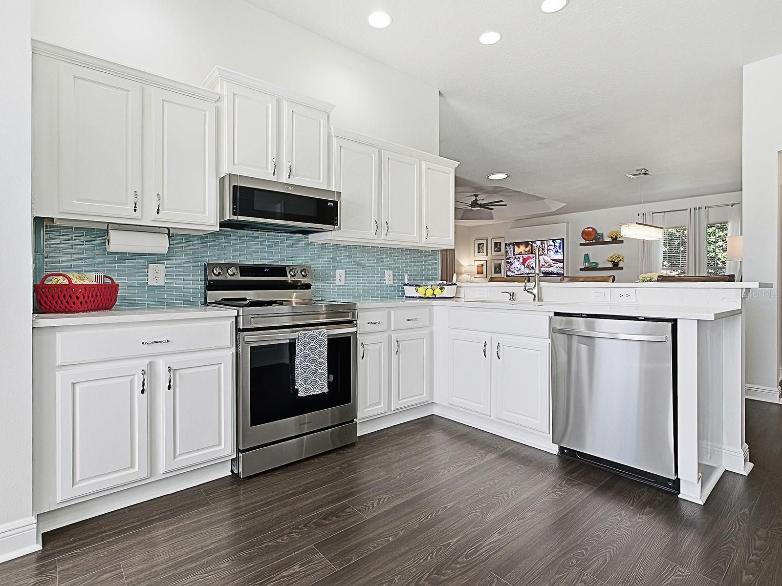 Under contract-accepting backup offers. Bond Paid! This beautifully maintained Rancho Mirage Premier home is perfectly positioned on a quiet cul-de-sac in the desirable Village of Palo Alto. Step inside to discover neutral tones, HIGH CEILINGS throughout, and elegant tray ceilings in both the living room and primary suite. Thoughtful updates include NEW fans and lighting, luxury vinyl plank flooring (NO CARPET), and a built-in electric fireplace for cozy ambiance. The newly updated kitchen impresses with QUARTZ countertops, white stair-step cabinetry, a tile backsplash, newer appliances, and an open layout that flows seamlessly into the living and dining areas. A solar tube between the dining and living rooms fills the space with beautiful natural light. Just off the spacious living room, enjoy the ENCLOSED LANAI with heat and air and wood-look tile flooring, perfect for relaxing year-round. The spacious primary suite features dual closets, a private BIRDCAGED PATIO, and a luxurious ensuite bath with GRANITE countertops, a tiled shower with seamless glass door, and a river rock floor. The stretched garage provides ample room for two cars and a golf cart, featuring painted floors, a screen door, pull-down attic stairs, and an extra storage closet with a utility sink. The second bedroom is located at the front of the home (currently without a closet but with space to add one) and is presently being used as a den. The third guest bedroom is spacious and has a double-door closet. The guest bathroom has been updated with GRANITE countertop and tub/shower combo with glass door. The laundry room is equipped with storage cabinets and a front-load washer and dryer on pedestals. Other updates include: Roof (2020), HVAC (2015). This home has a VA assumable loan at a low interest rate. (Preapproval required) Conveniently located between Spanish Springs Town Square and Lake Sumter Landing Market Square, close to Tierra Del Sol Country Club and Championship Golf Course, Hacienda Regional Recreation Center, The Villages Regional Hospital, 441/27 Shopping Corridor, and 466. Come fall in love with this lovely home!