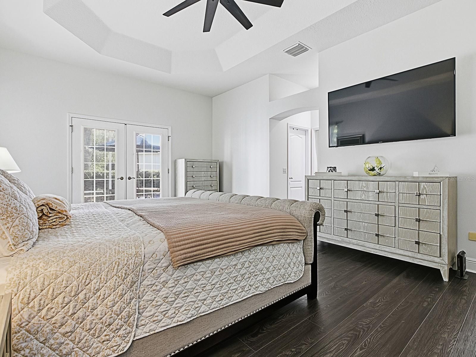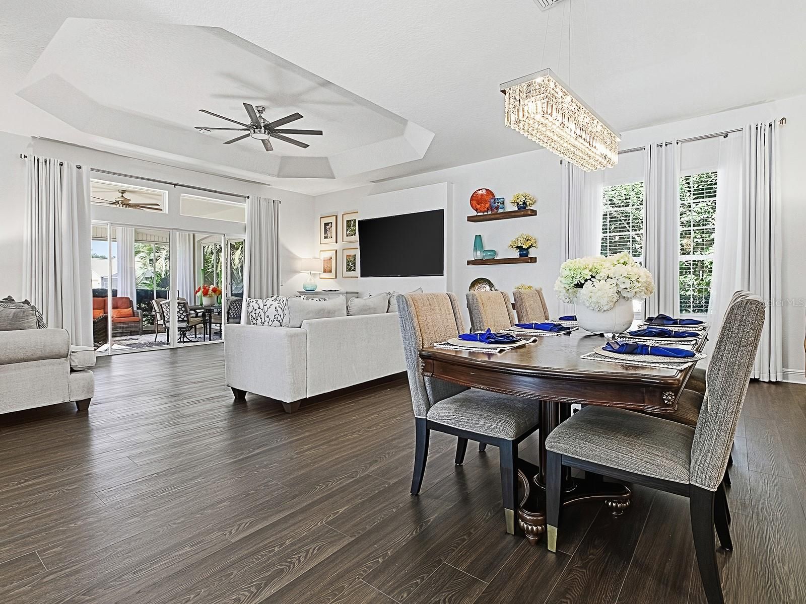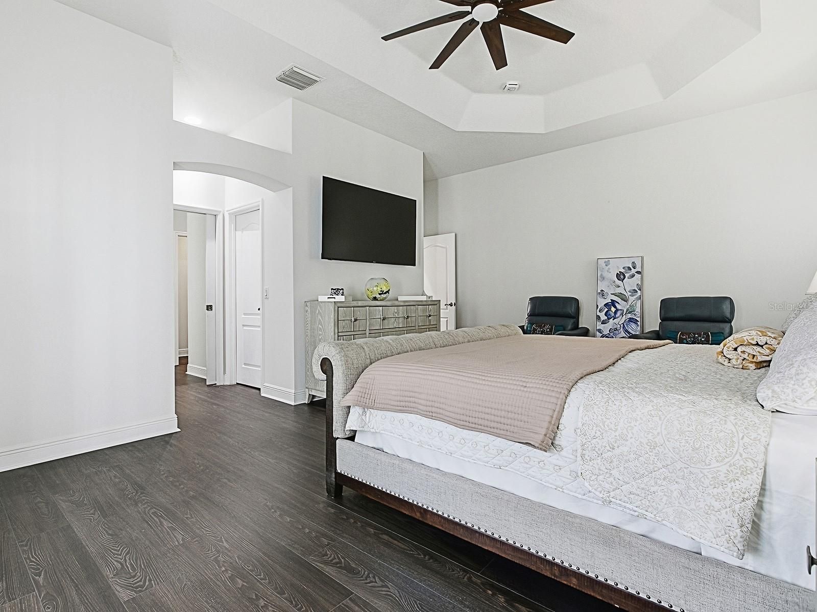 - Ceiling Fan(s), Central Vacuum, High Ceilings, Kitchen/Family Room Combo, Living/Dining Room, Open Floorplan, Main Level Primary, Stone Counters, Thermostat, Tray Ceiling(s), Walk-In Closet(s)