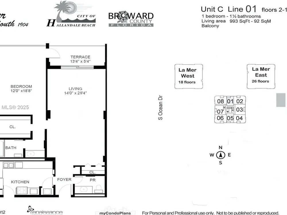 La Mer South Tower Condo for Sale - one-bedroom, 1.5 bathroom with 960 sq ft. Only 8 units per floor. The unit offers impact glass windows and doors and an open balcony with city, park, and ocean views. Carpet floors in the bedroom and walking closet. Ceramic floors in the kitchen, dining, and living area. New bath fitter on the principal shower and a glass door. La Mer lifestyle includes a heated pool by the ocean, 24-hour security service, and valet parking. Beach services, a beauty salon, a gym, tennis courts, a restaurant, a sauna and steam room, a picnic and BBQ area, and a billiard room. La Mer is in the process of a multimillion-dollar renovation of all its common areas and services. Near shopping areas and fine restaurants. Close to Ft Lauderdale Int'l. Airport.