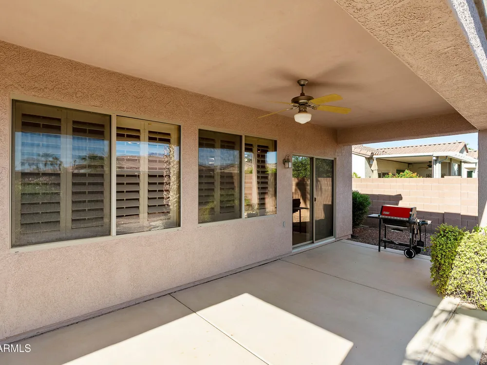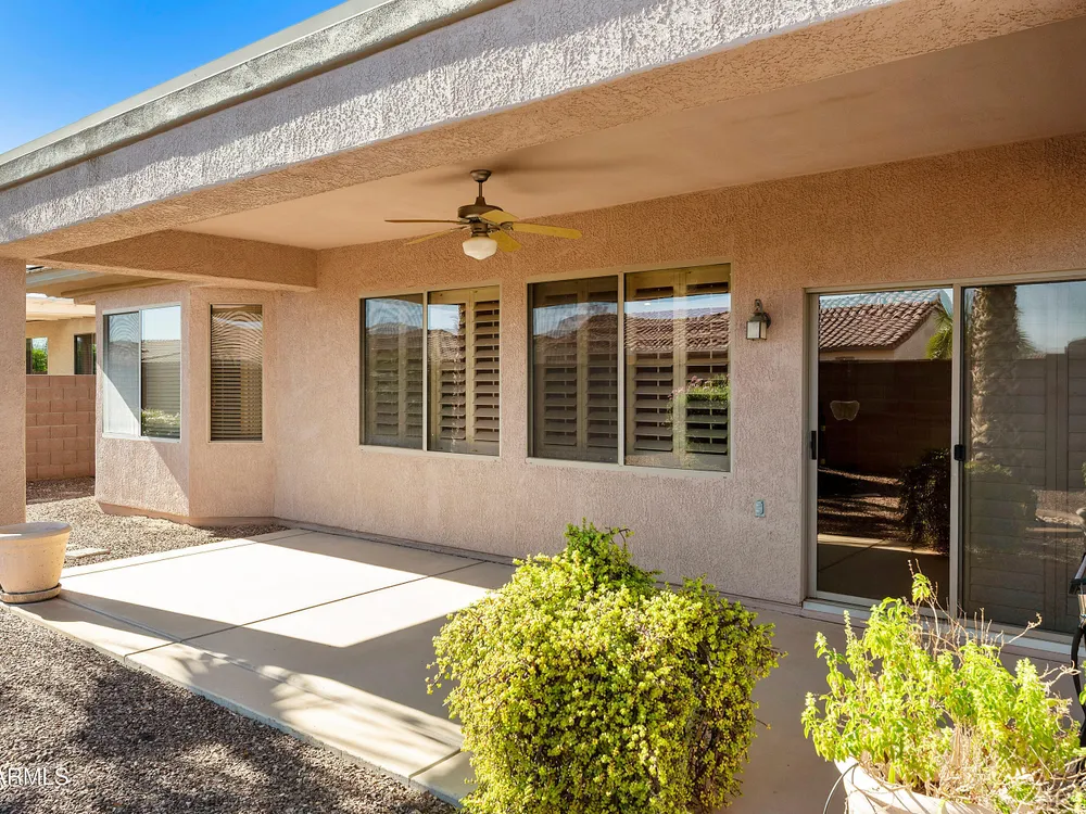 Welcome to Sun City Grand and this Desirable open concept Azalea model, spacious open great room, dining & kitchen which includes breakfast bar, Corian counter tops, pantry & all appliances plus shutters throughout these areas! Split floor plan, 2 bedroom, 2 bath and a den, Primary suite W/bay window, then into your bathroom w/large Corian shower surround plus extra spacious closet w/custom built storage. Large Extended length 2 Car garage is complete with built in sink & storage cabinets too. Low maintenance front & back yards are with auto water system plus extended back patio to relax and enjoy. Community Area offering loads of amenities like Golf, pickleball, swimming pool & spa, clubhouse PLUS it's close to shopping, dining & 303freeway too.