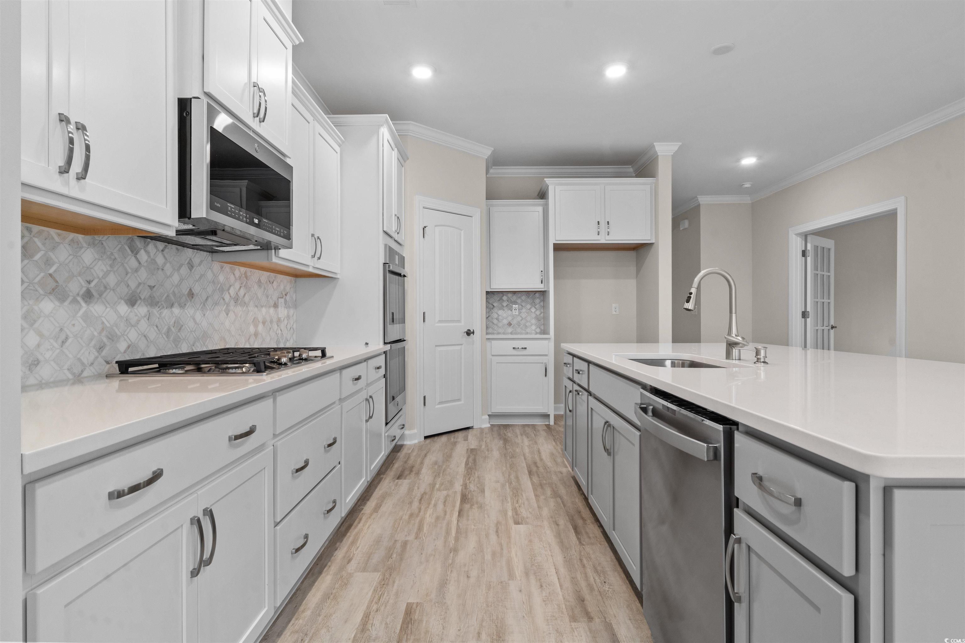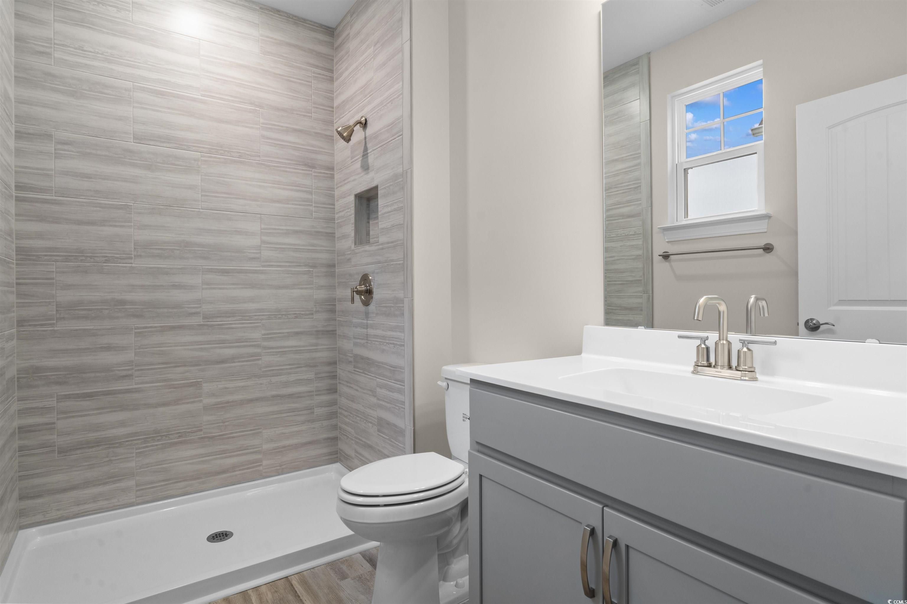 The Seashore floor plan is located Shorehaven Village of Bridgewater! The spacious, ranch style home with full bonus room features coastal inspired architectural accents, outdoor living area and an extended garage. A covered front porch welcomes you home to a large, inviting foyer. Multi generational suite with full bathroom. bedroom and kitchenette -great use of space for anyone to use. Upstairs you will find a guest bedroom, full bath, huge loft area and tons of storage. The kitchen on main level has shaker style cabinets, large center island with sink & GE stainless appliance package. Bridgewater is a natural gas community! This Seashore has a gas furnace and gas tankless water heater. The Master Bedroom has a trey ceiling with crown molding and 2 large walk in closets. Dedicated laundry room is very spacious. Master bathroom features an oversized walk in fully tiled shower- no door, dual vanity, water closet with comfort height commode and large linen closet for storage. Enjoy the Carolina Sea Breeze out on the covered rear porch. This home is a must see on an oversized lot in Bridgewater!