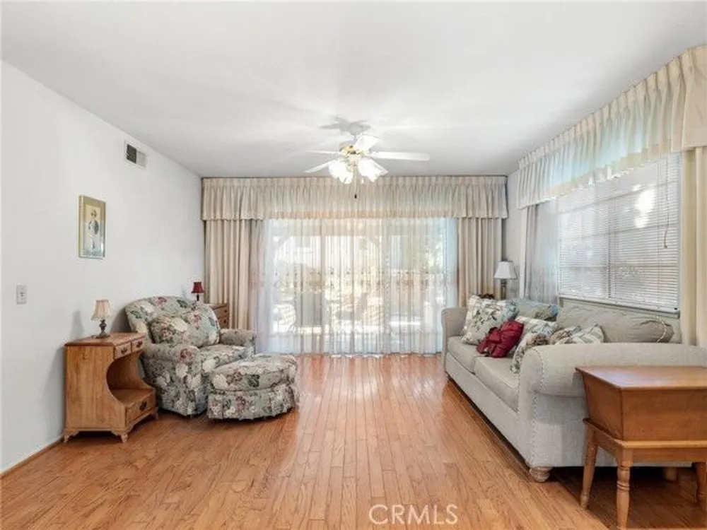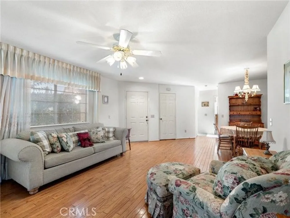 Introducing a charming retreat in the heart of the desirable 55+ senior community of Jess Ranch! This inviting two-bedroom, two-bathroom home offers the perfect blend of comfort and functionality, complete with a spacious two-car garage. Step inside to discover stunning hardwood floors that grace the living room, creating a warm and welcoming atmosphere. The custom window treatments elegantly frame every window, adding a touch of sophistication throughout the home. Enjoy the convenience of an indoor laundry room and a bright country kitchen that flows seamlessly into a separate dining area, perfect for entertaining family and friends. The primary suite is a true sanctuary, featuring a generous walk-in closet and an en-suite bathroom complete with dual sinks, providing both privacy and convenience. Accessibility is prioritized with a ramp at the front door and a thoughtfully designed pathway leading to the main entrance on the side of the home. Outside, unwind on the expansive wood-covered back patio that spans the length of the house, surrounded by lush community greenbelt and trees, offering a serene backdrop for relaxation. Nestled towards the end of a quiet street where it curves, this home provides a peaceful setting while still being close to community amenities. Don’t miss the opportunity to make this delightful residence your new home!