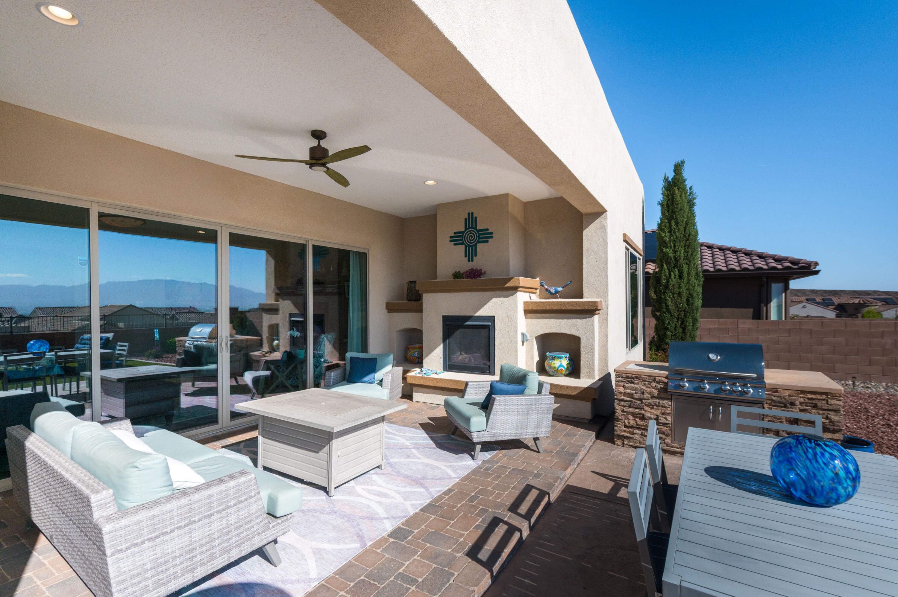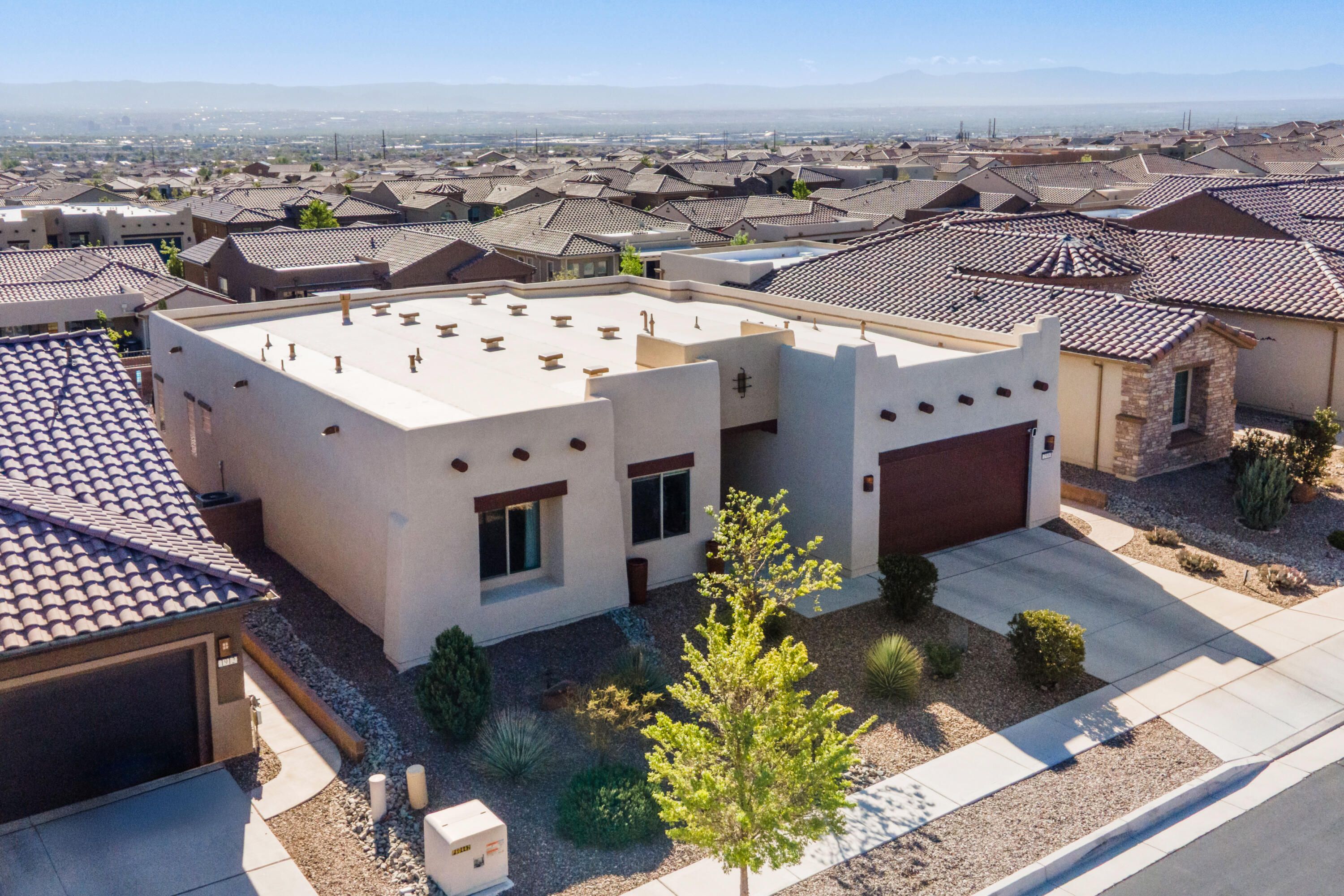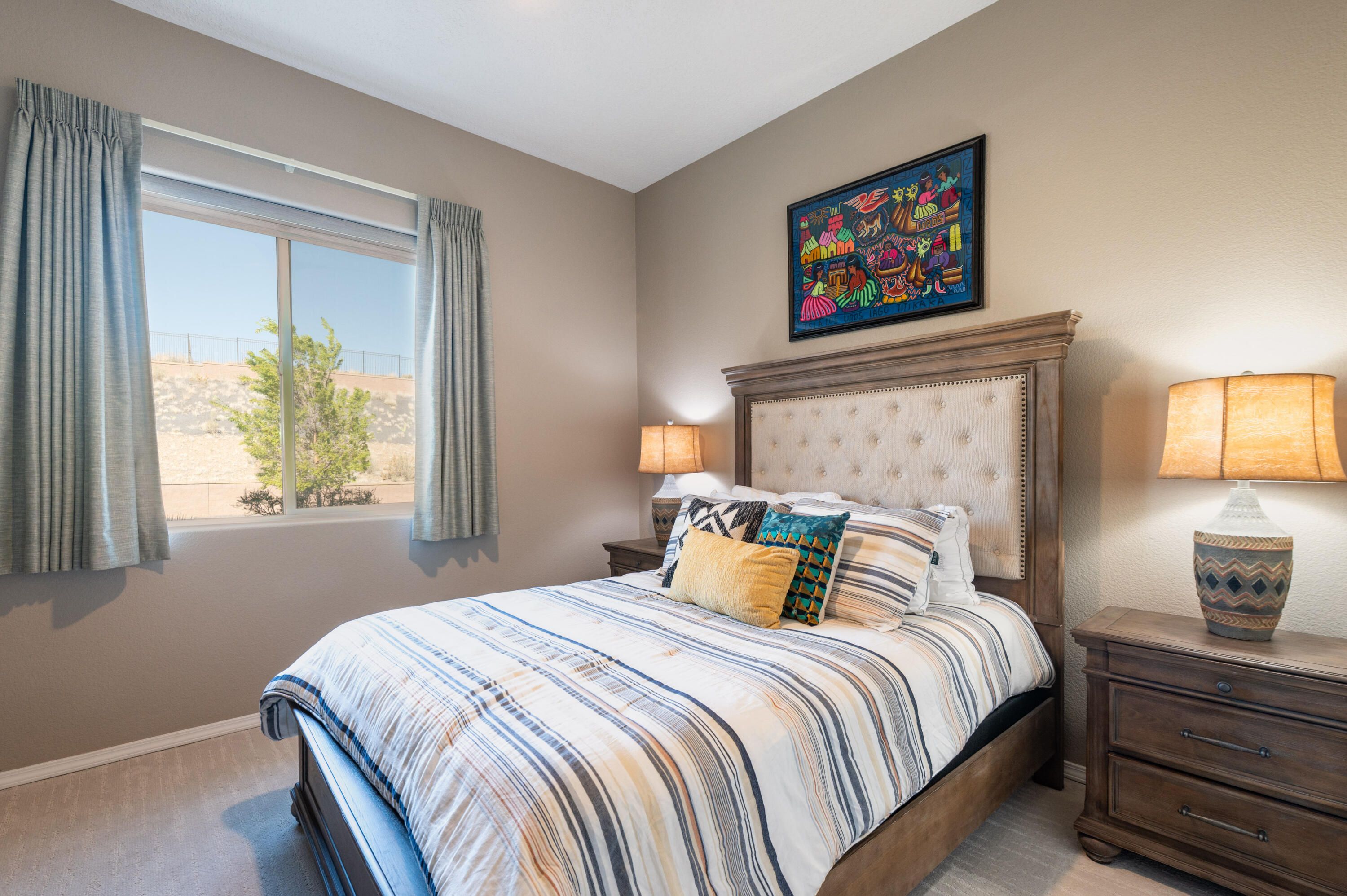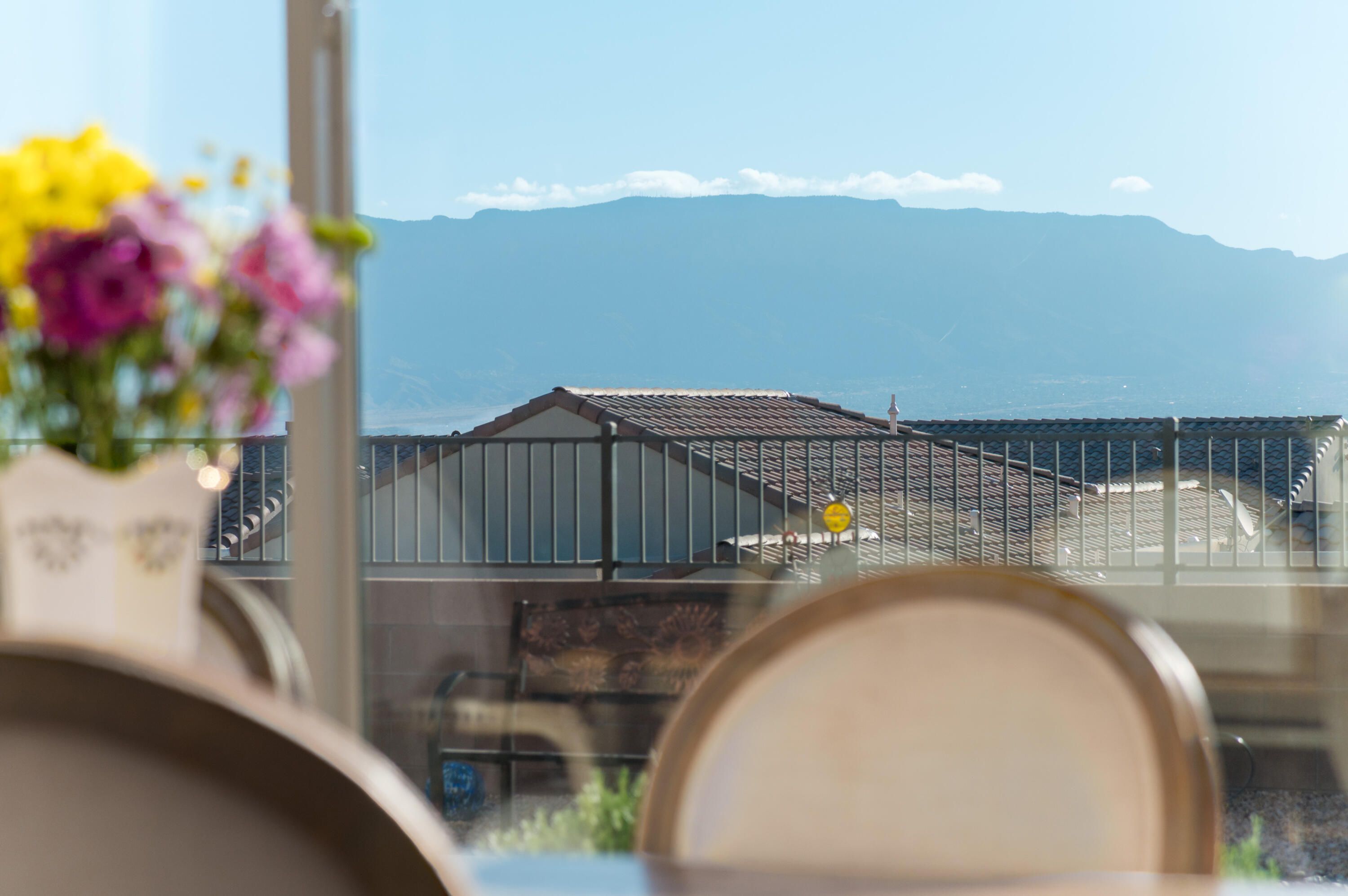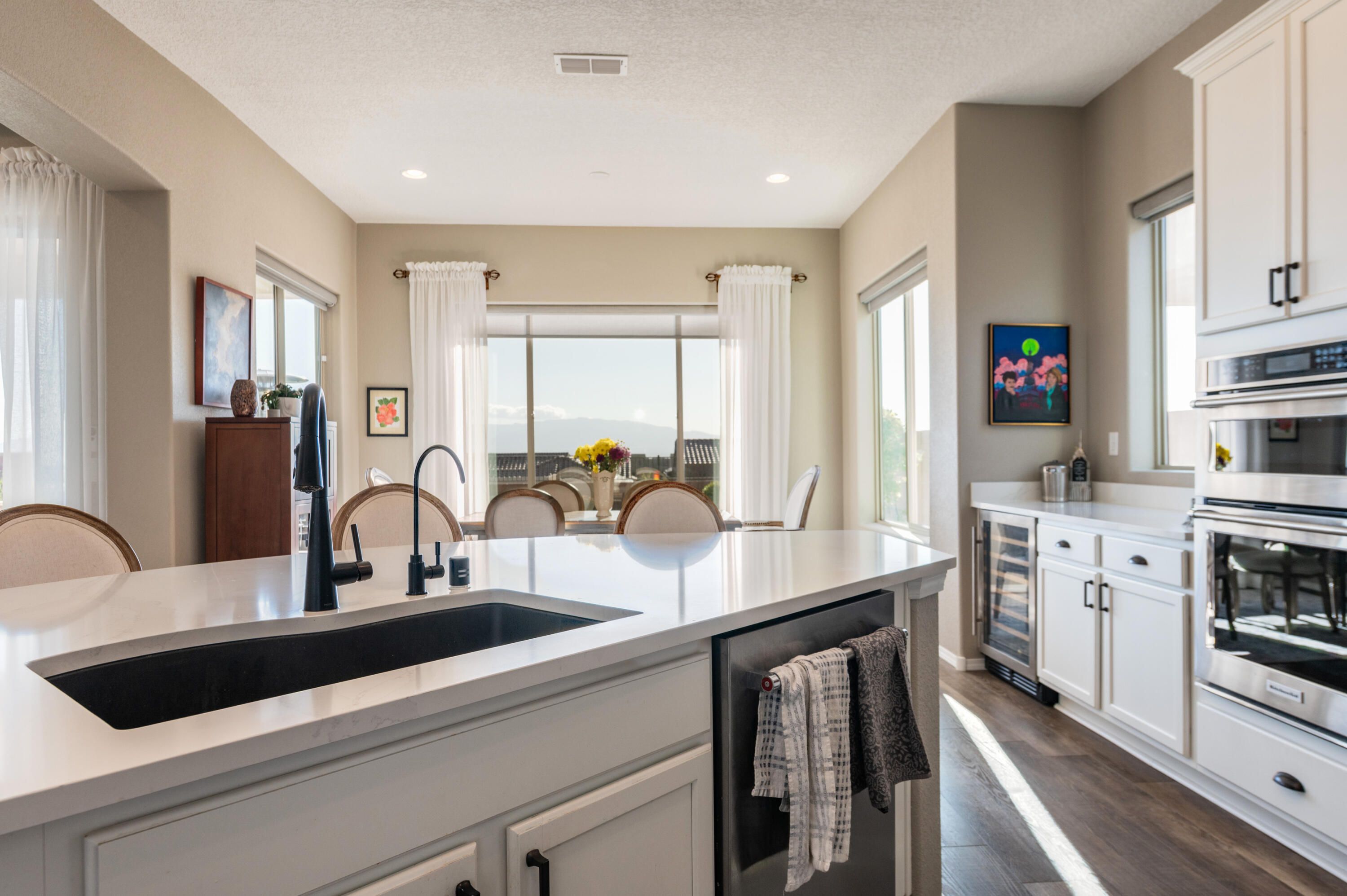 Beautiful Home with Forever Mountain and City Views in Albuquerque's Premier 55+ Active Adult Community, Del Webb Mirehaven! Built in 2020 this Pursuit Model Floorplan has 2137sf which includes a heated/cooled garage storage room, 2 BR's, 2 BA's, plus office/den or optional 3rd BR! Features include a large sliding door showcasing the views, soft arch hallways, tray ceilings, gourmet kitchen w/quartz countertops, pull-out cabinets, two ovens, wet bar w/wine fridge, reverse osmosis, nice large Island. Stylish LVP flooring, tile & upgraded carpet in bedrooms. Spacious primary suite w/ tiled walk-in shower & custom closet. Laundry w/sink, soft water system & instant hot water. Custom landscaped backyard w/stacked stone built-in BBQ, pavers, turf & plantings! Custom window shades & coverings!!