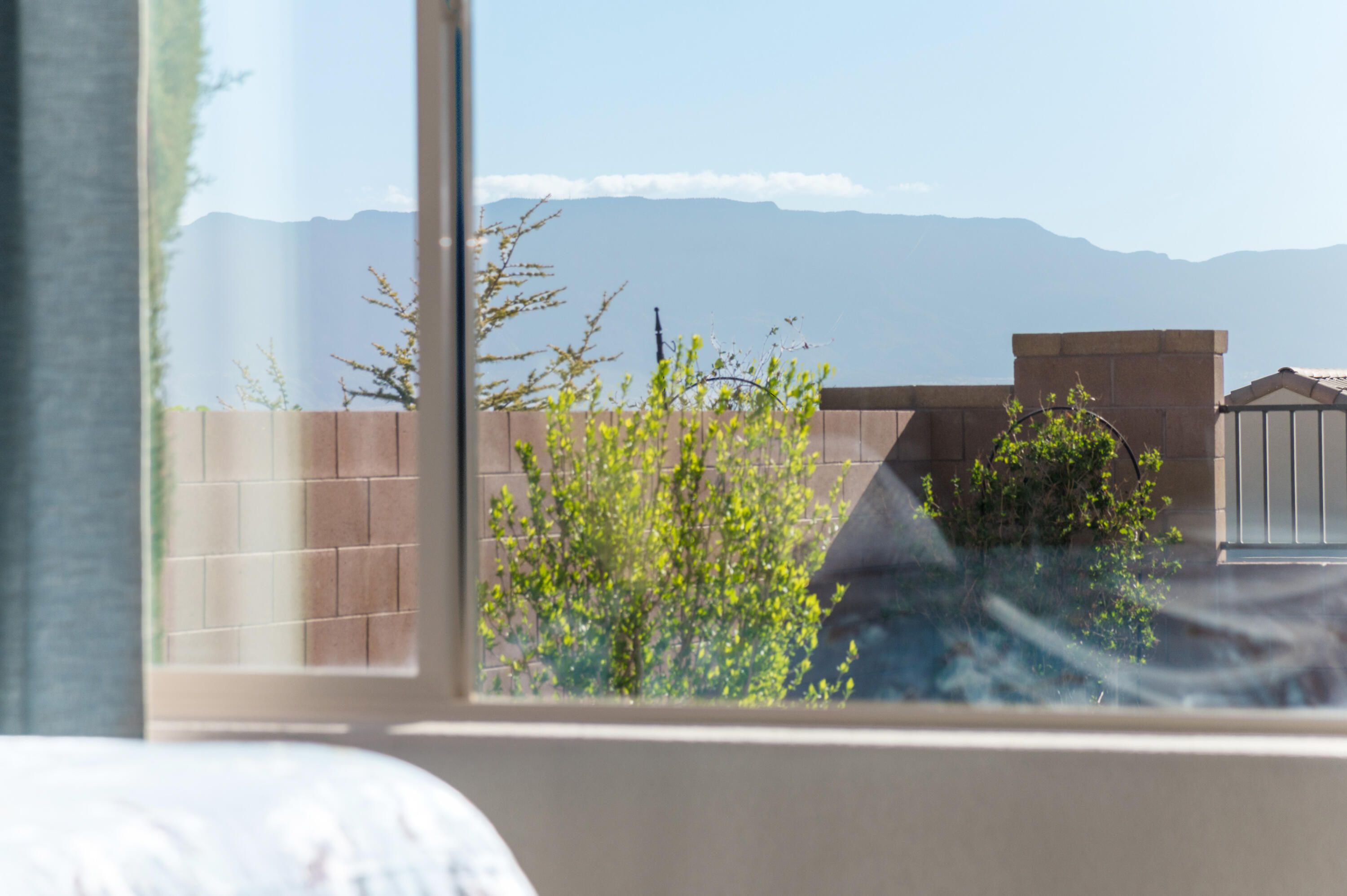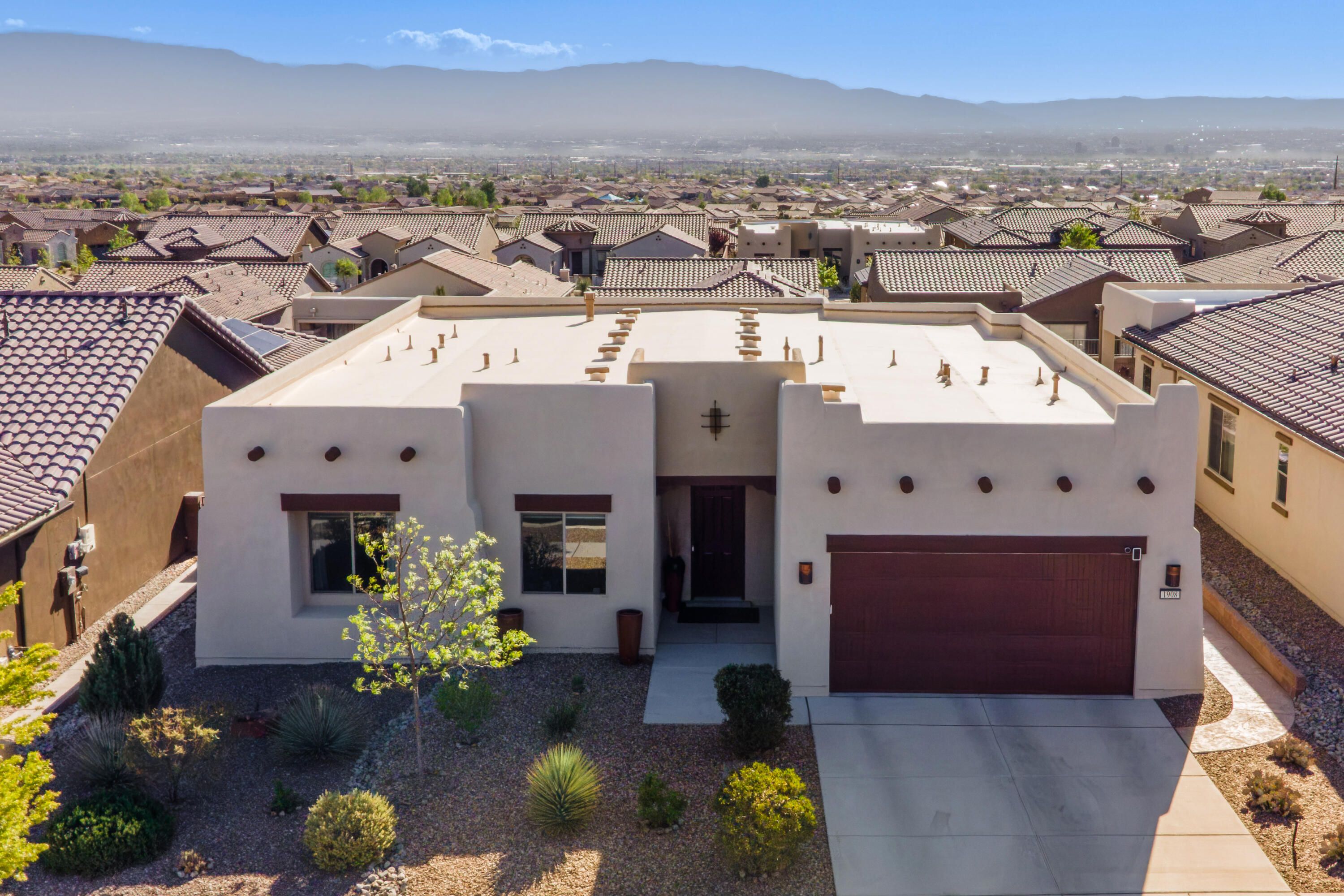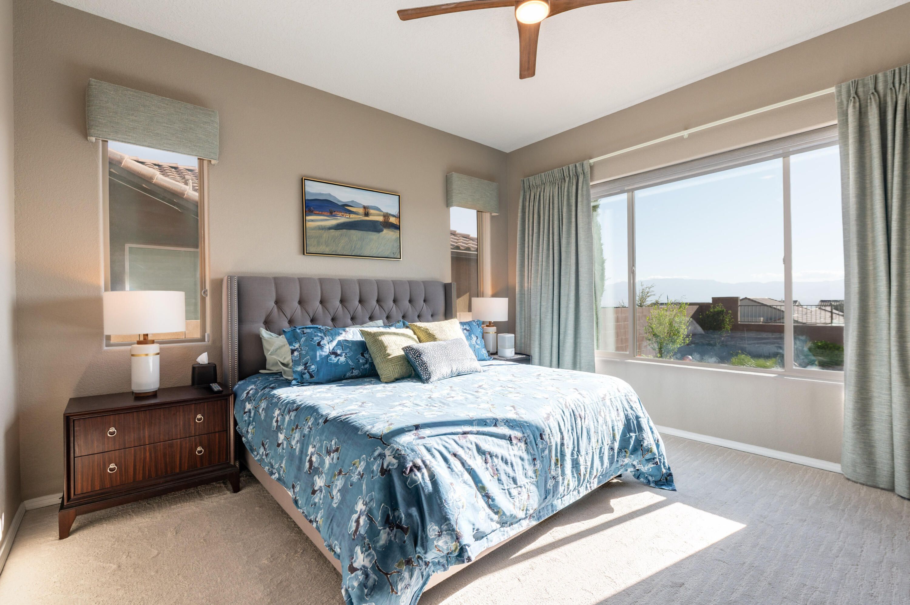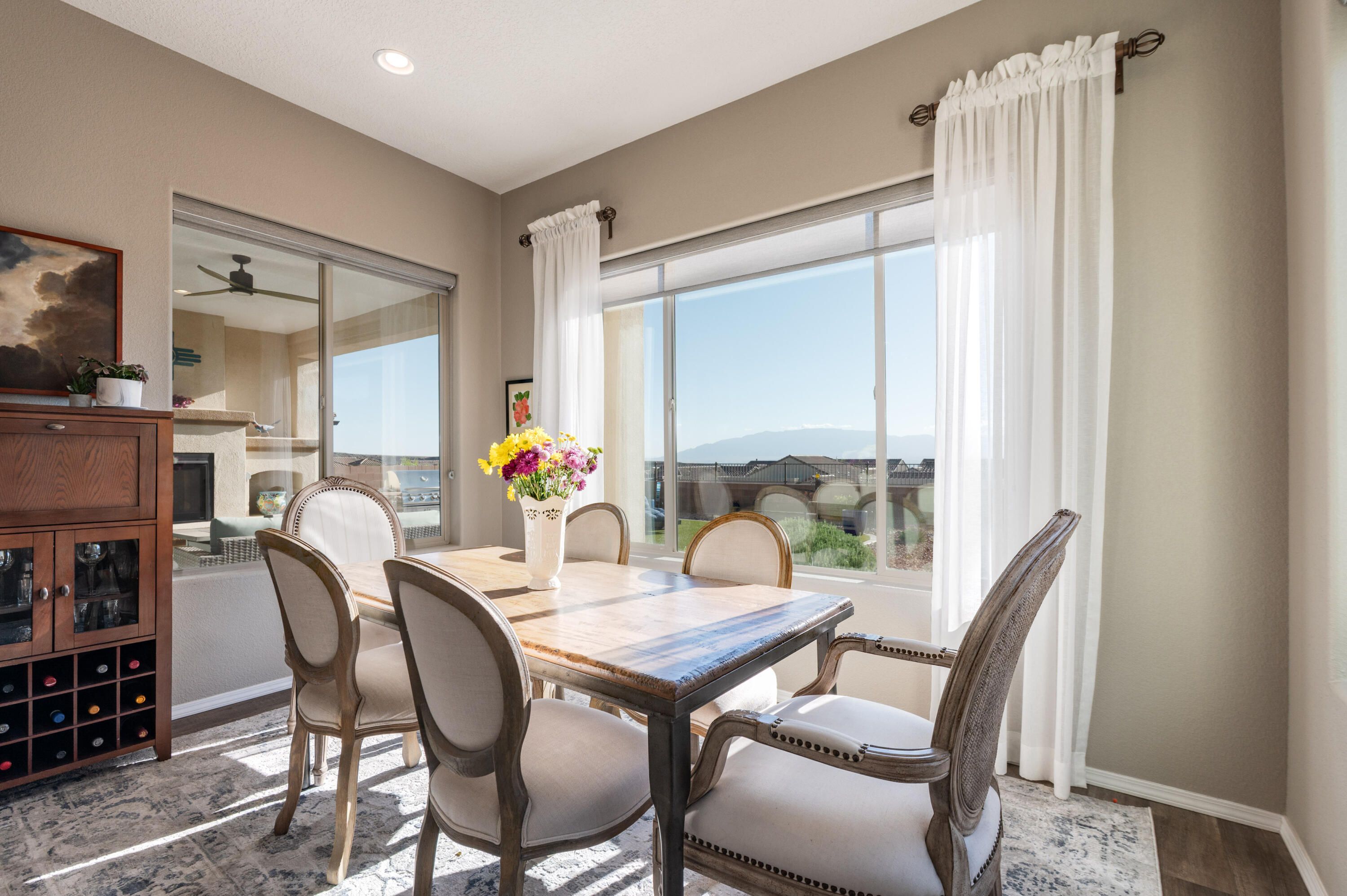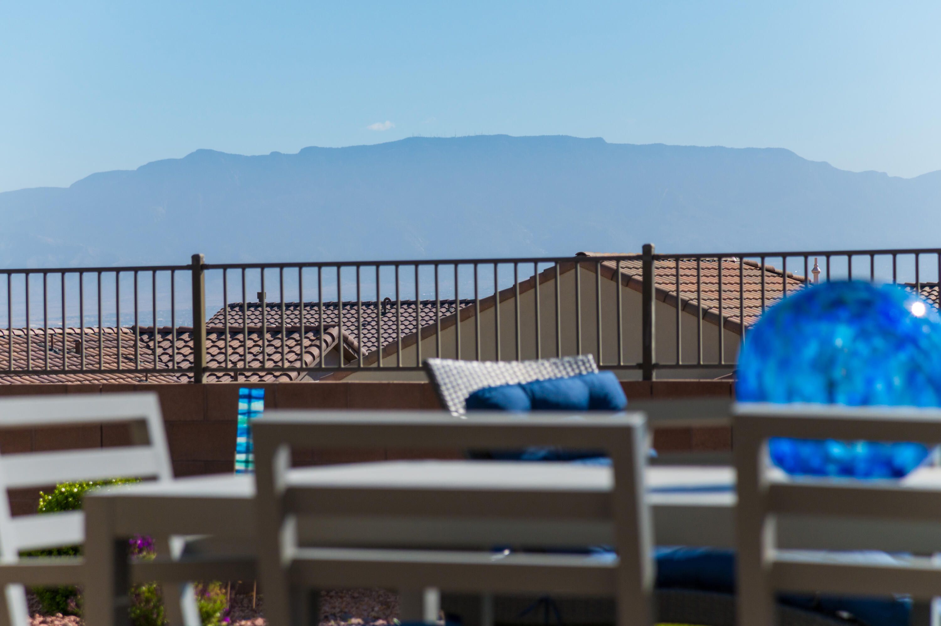 Beautiful Home with Forever Mountain and City Views in Albuquerque's Premier 55+ Active Adult Community, Del Webb Mirehaven! Built in 2020 this Pursuit Model Floorplan has 2137sf which includes a heated/cooled garage storage room, 2 BR's, 2 BA's, plus office/den or optional 3rd BR! Features include a large sliding door showcasing the views, soft arch hallways, tray ceilings, gourmet kitchen w/quartz countertops, pull-out cabinets, two ovens, wet bar w/wine fridge, reverse osmosis, nice large Island. Stylish LVP flooring, tile & upgraded carpet in bedrooms. Spacious primary suite w/ tiled walk-in shower & custom closet. Laundry w/sink, soft water system & instant hot water. Custom landscaped backyard w/stacked stone built-in BBQ, pavers, turf & plantings! Custom window shades & coverings!!
