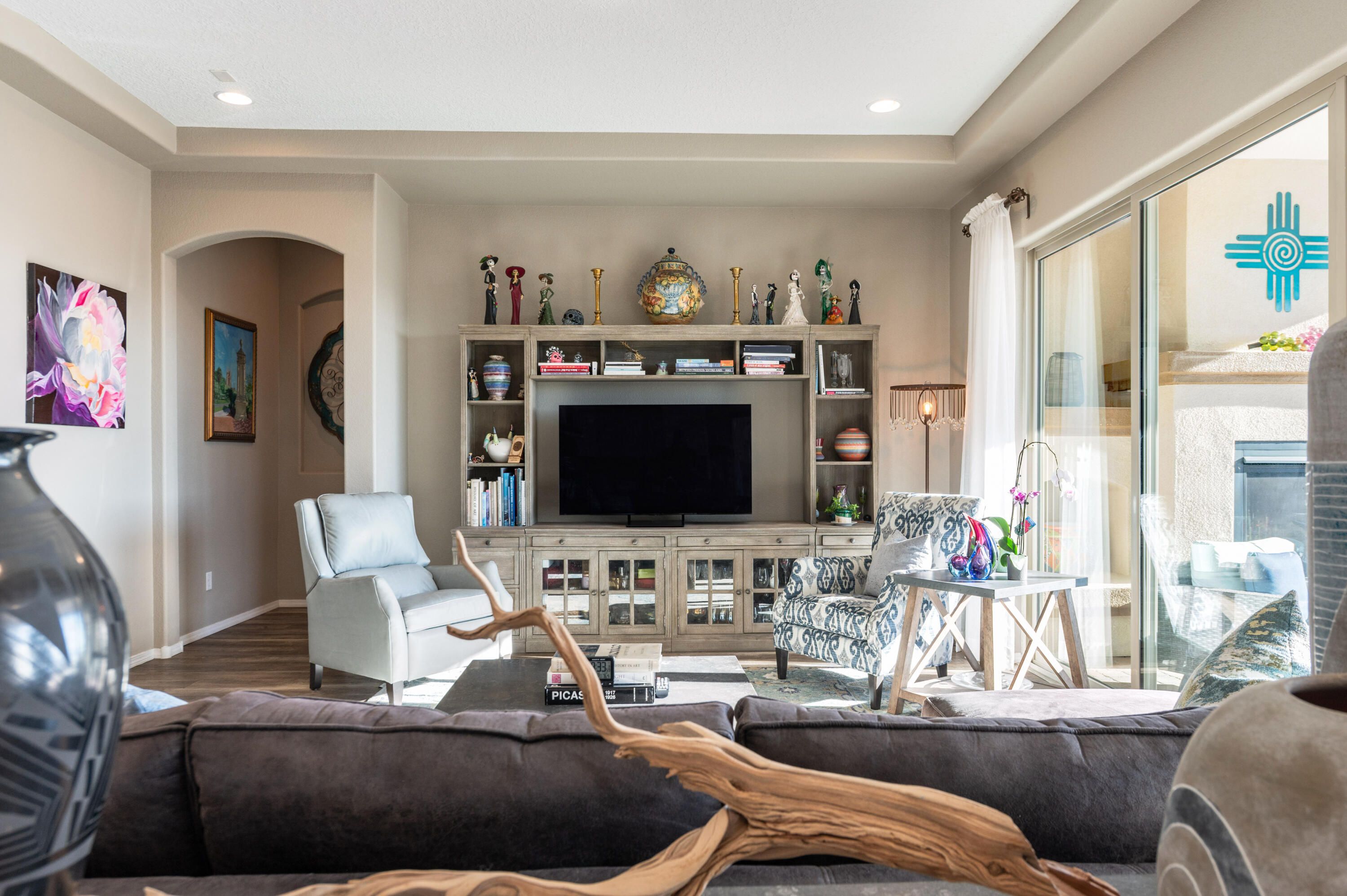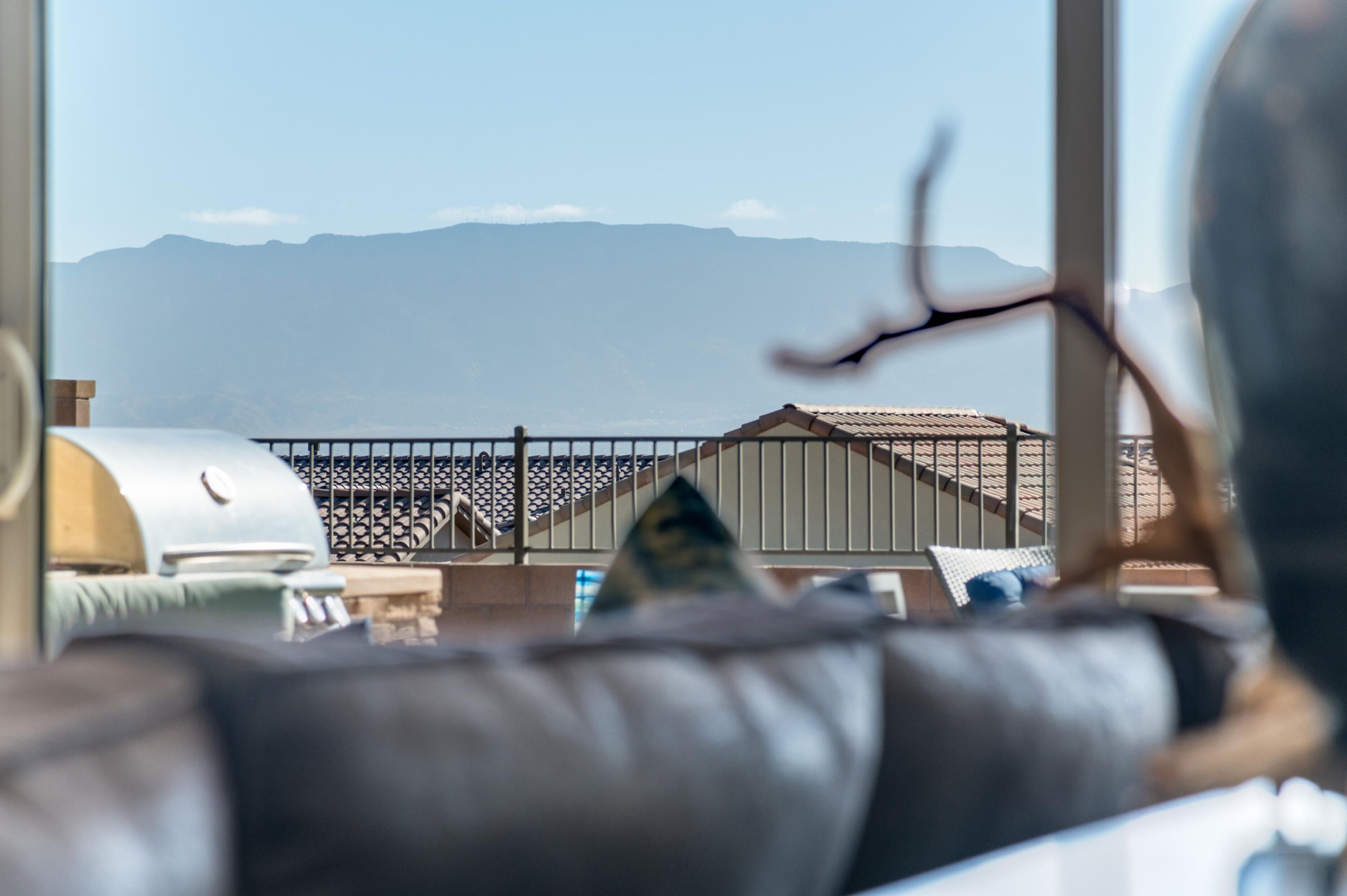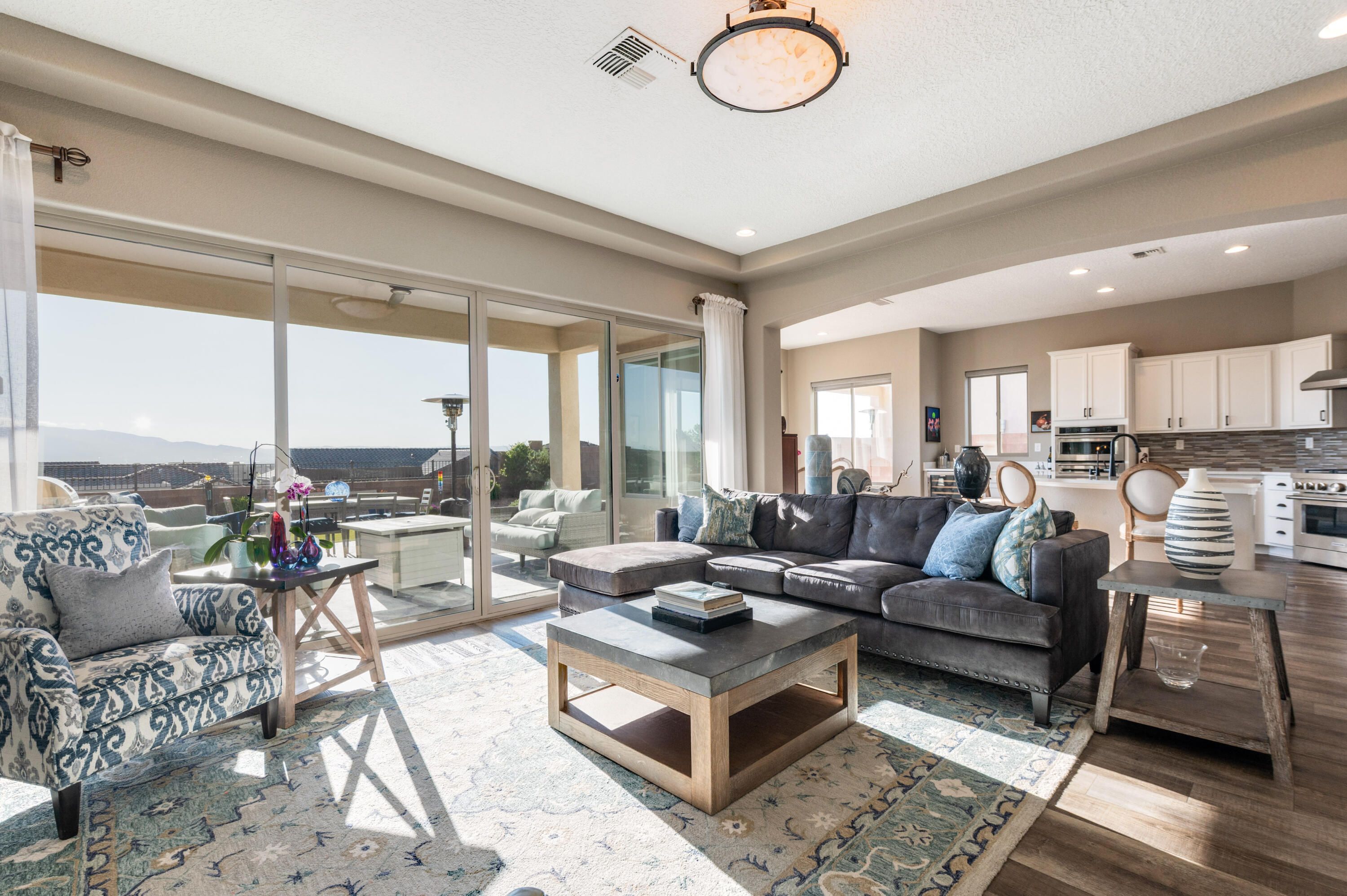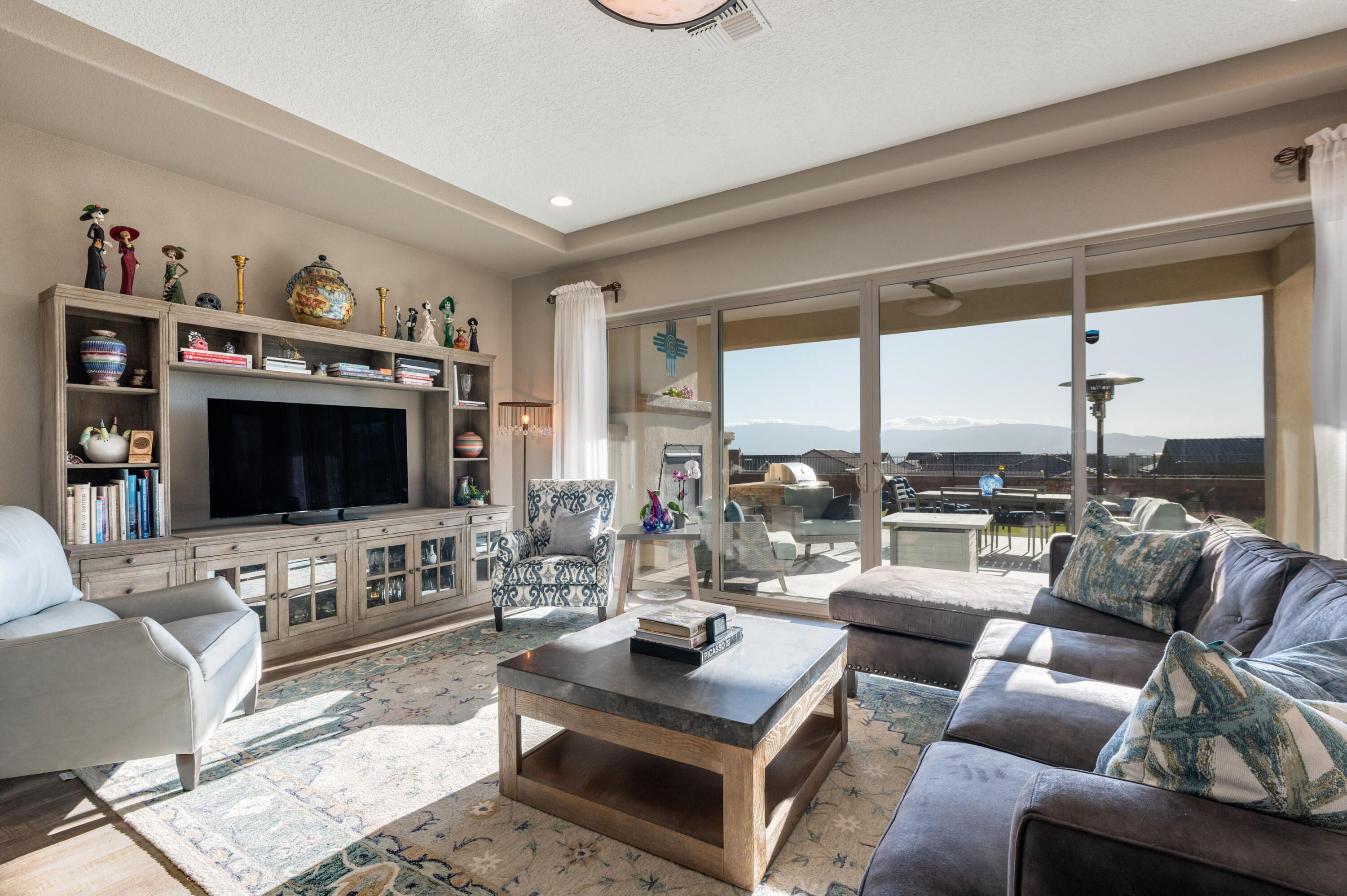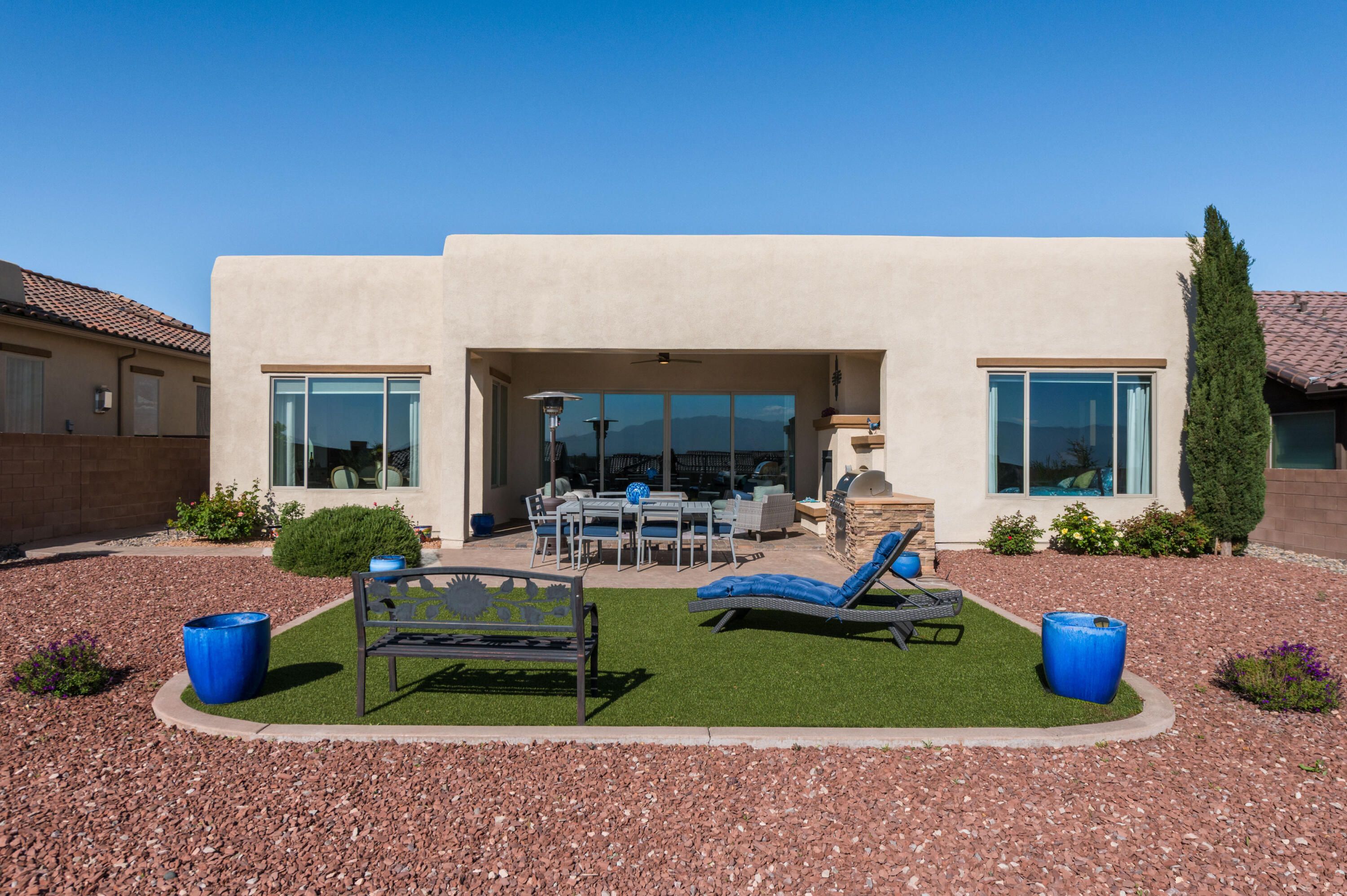 Beautiful Home with Forever Mountain and City Views in Albuquerque's Premier 55+ Active Adult Community, Del Webb Mirehaven! Built in 2020 this Pursuit Model Floorplan has 2137sf which includes a heated/cooled garage storage room, 2 BR's, 2 BA's, plus office/den or optional 3rd BR! Features include a large sliding door showcasing the views, soft arch hallways, tray ceilings, gourmet kitchen w/quartz countertops, pull-out cabinets, two ovens, wet bar w/wine fridge, reverse osmosis, nice large Island. Stylish LVP flooring, tile & upgraded carpet in bedrooms. Spacious primary suite w/ tiled walk-in shower & custom closet. Laundry w/sink, soft water system & instant hot water. Custom landscaped backyard w/stacked stone built-in BBQ, pavers, turf & plantings! Custom window shades & coverings!!