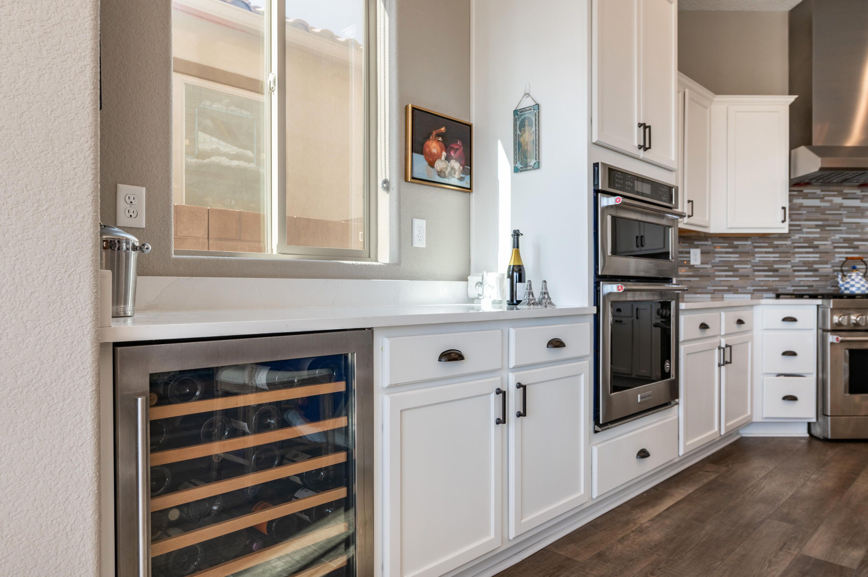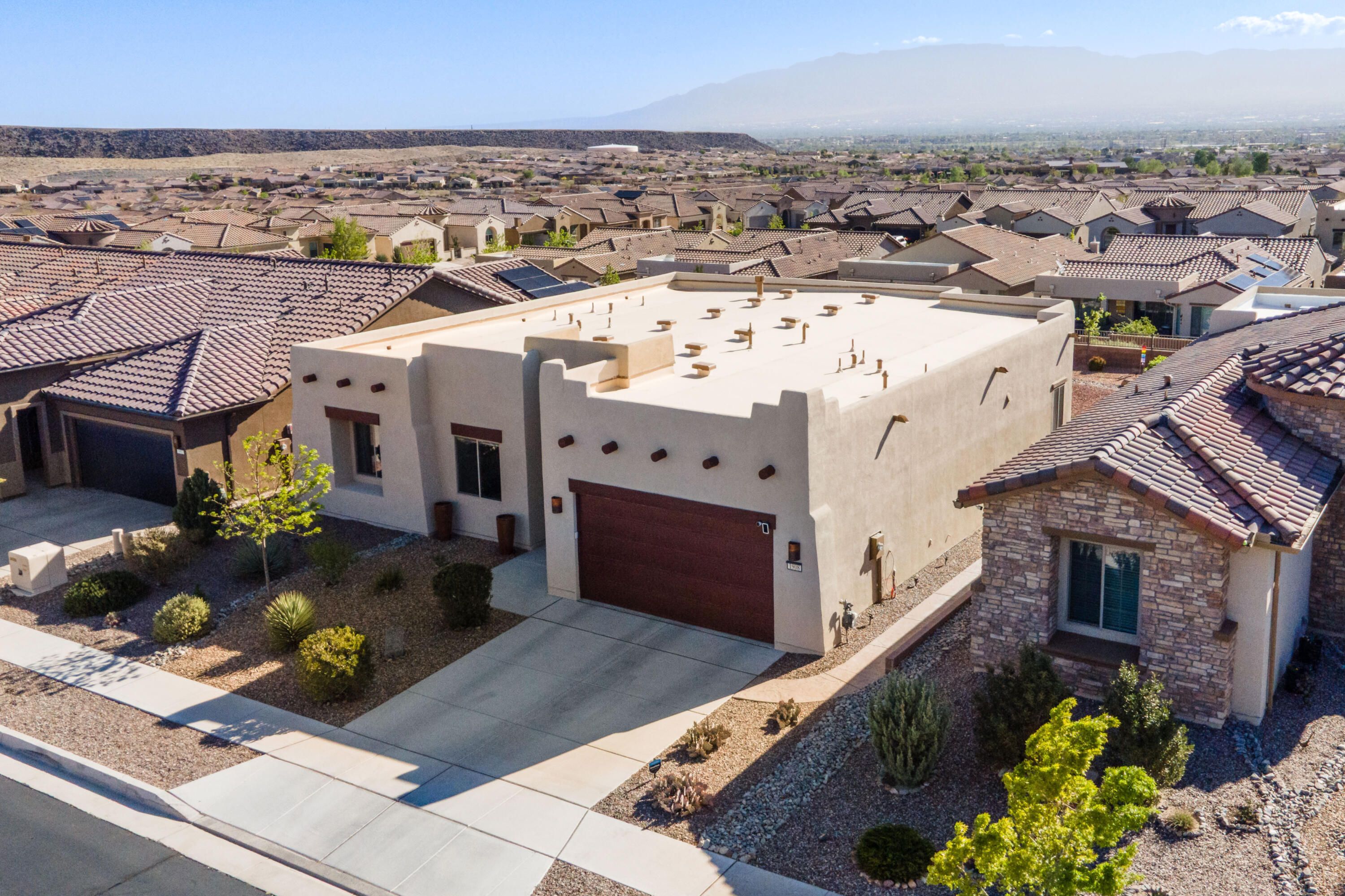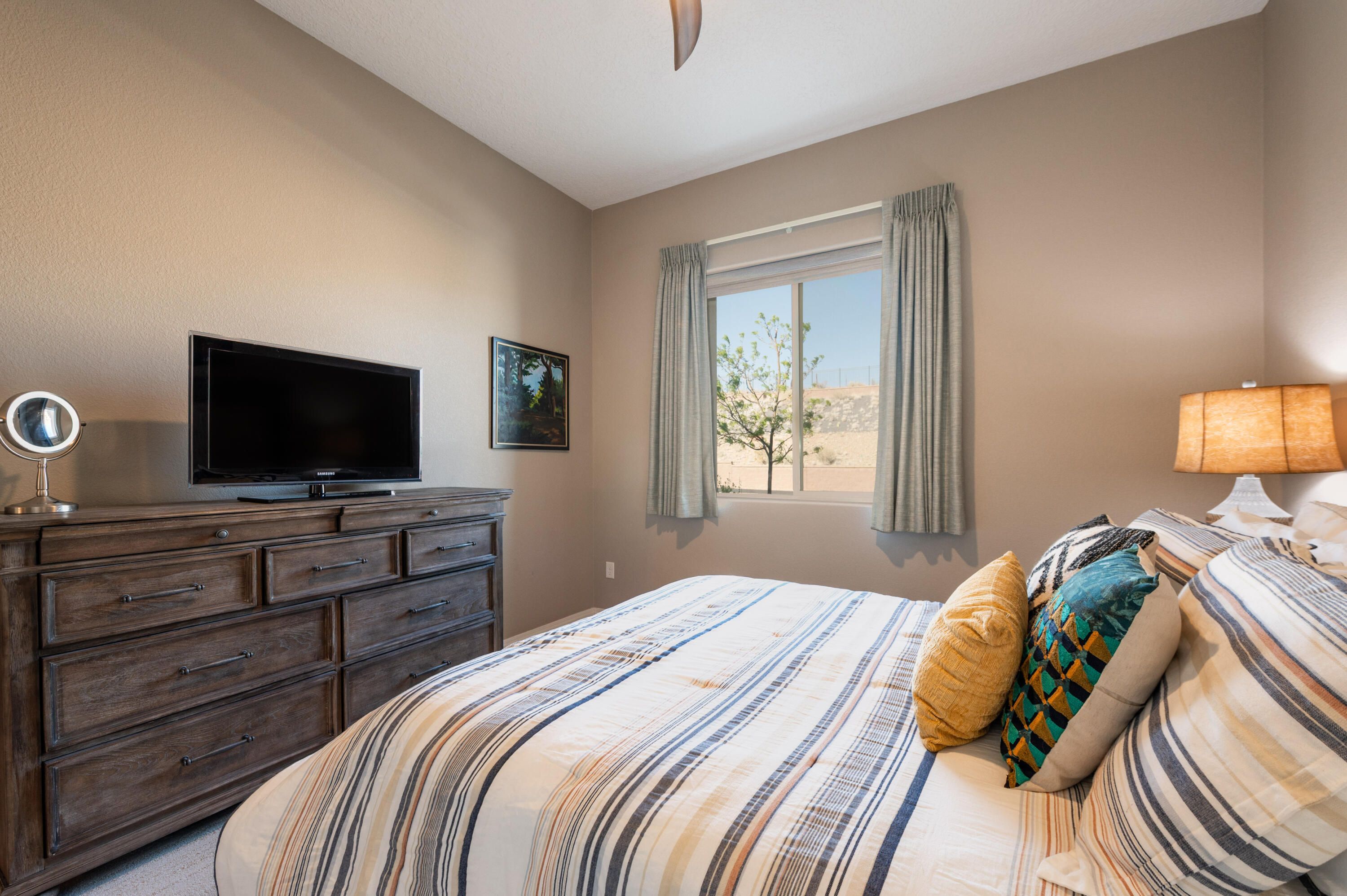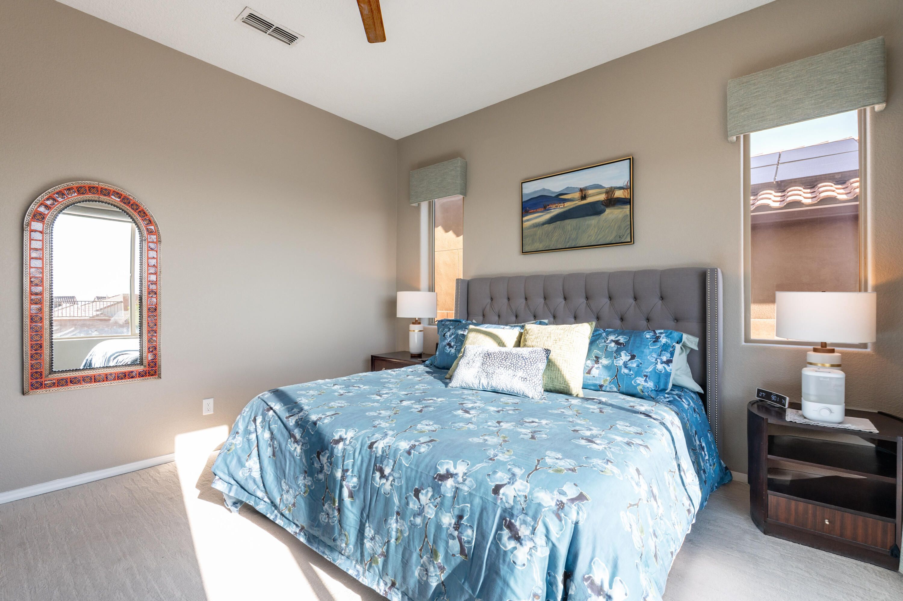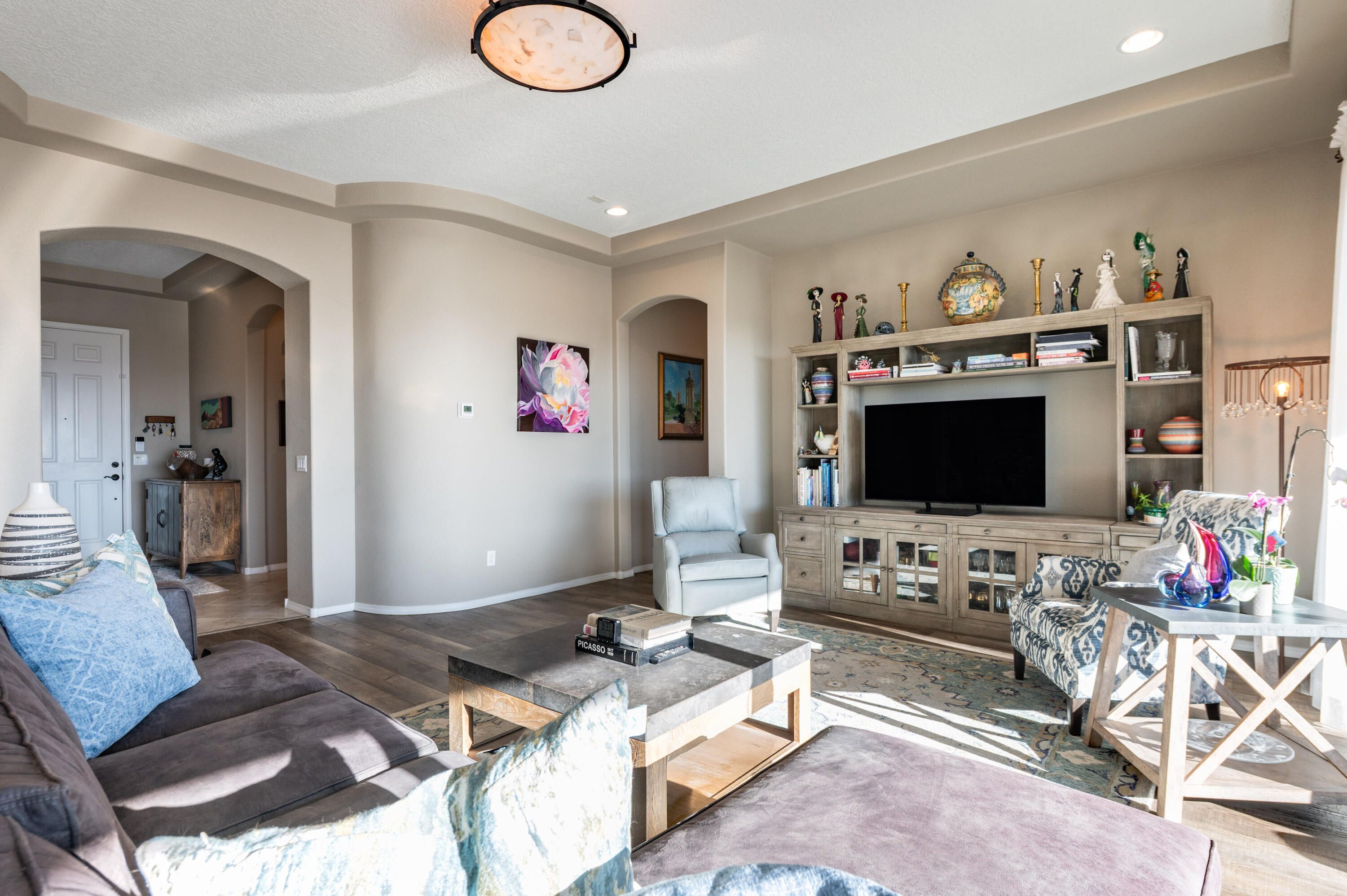 Beautiful Home with Forever Mountain and City Views in Albuquerque's Premier 55+ Active Adult Community, Del Webb Mirehaven! Built in 2020 this Pursuit Model Floorplan has 2137sf which includes a heated/cooled garage storage room, 2 BR's, 2 BA's, plus office/den or optional 3rd BR! Features include a large sliding door showcasing the views, soft arch hallways, tray ceilings, gourmet kitchen w/quartz countertops, pull-out cabinets, two ovens, wet bar w/wine fridge, reverse osmosis, nice large Island. Stylish LVP flooring, tile & upgraded carpet in bedrooms. Spacious primary suite w/ tiled walk-in shower & custom closet. Laundry w/sink, soft water system & instant hot water. Custom landscaped backyard w/stacked stone built-in BBQ, pavers, turf & plantings! Custom window shades & coverings!!