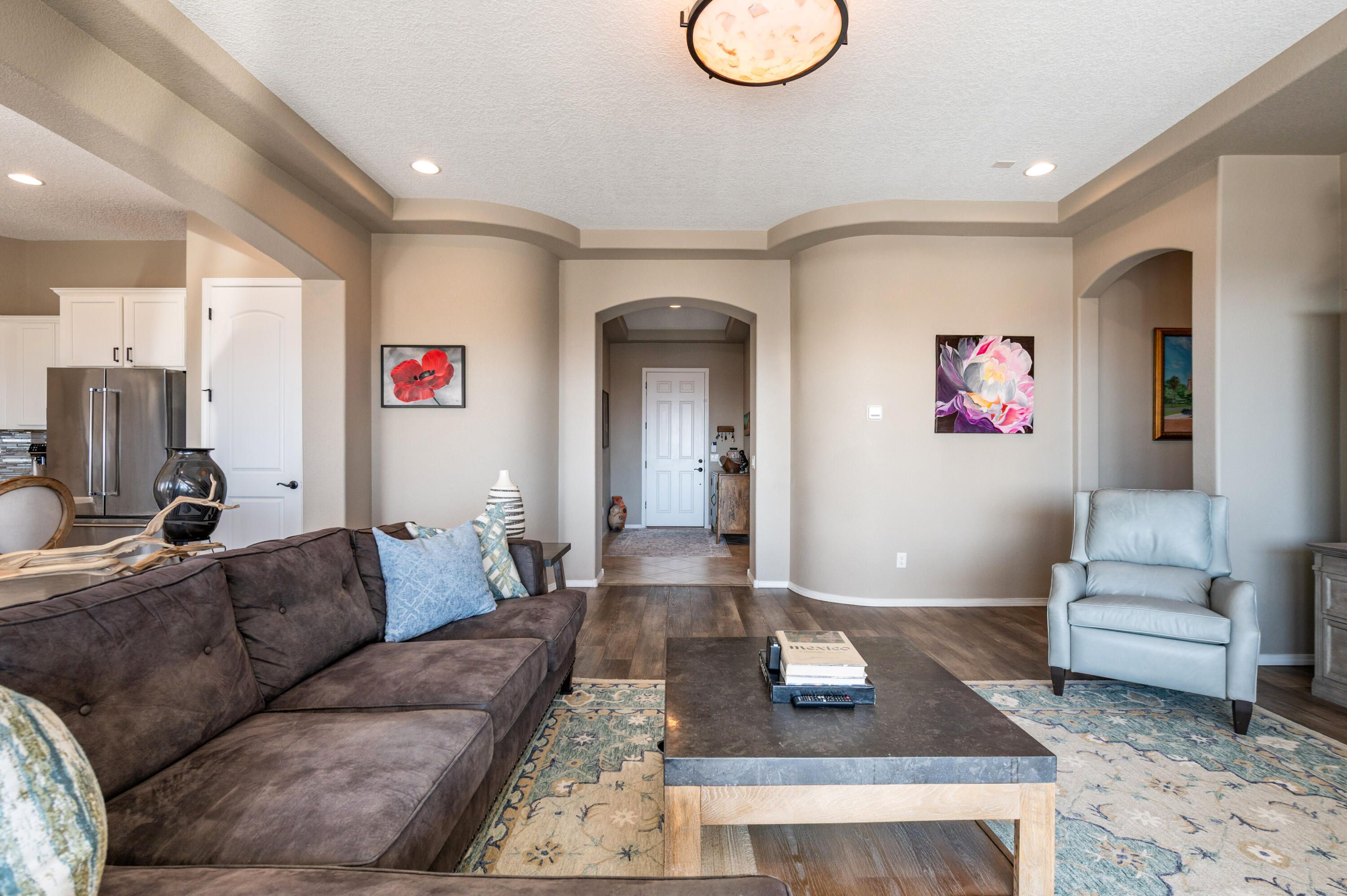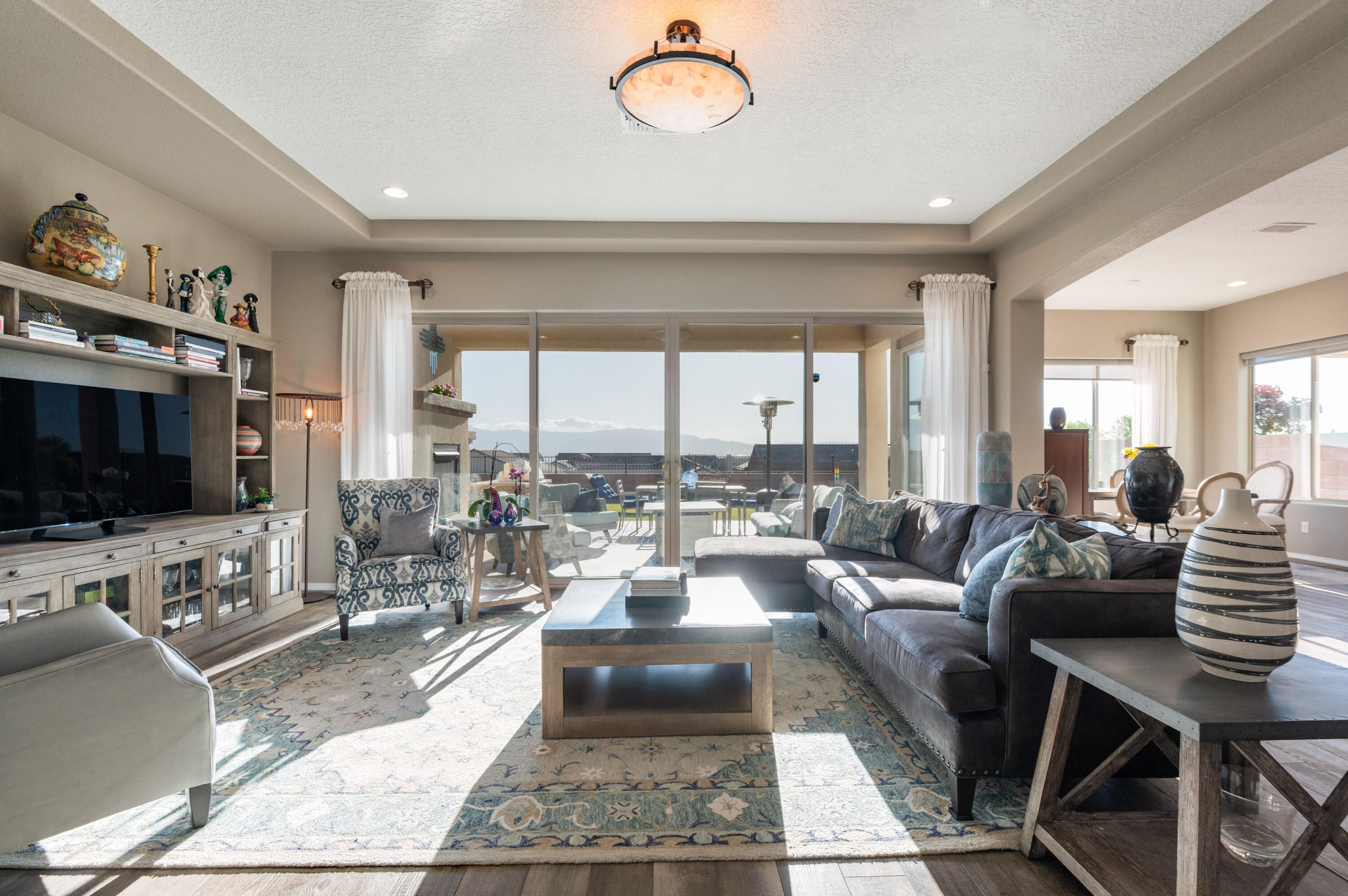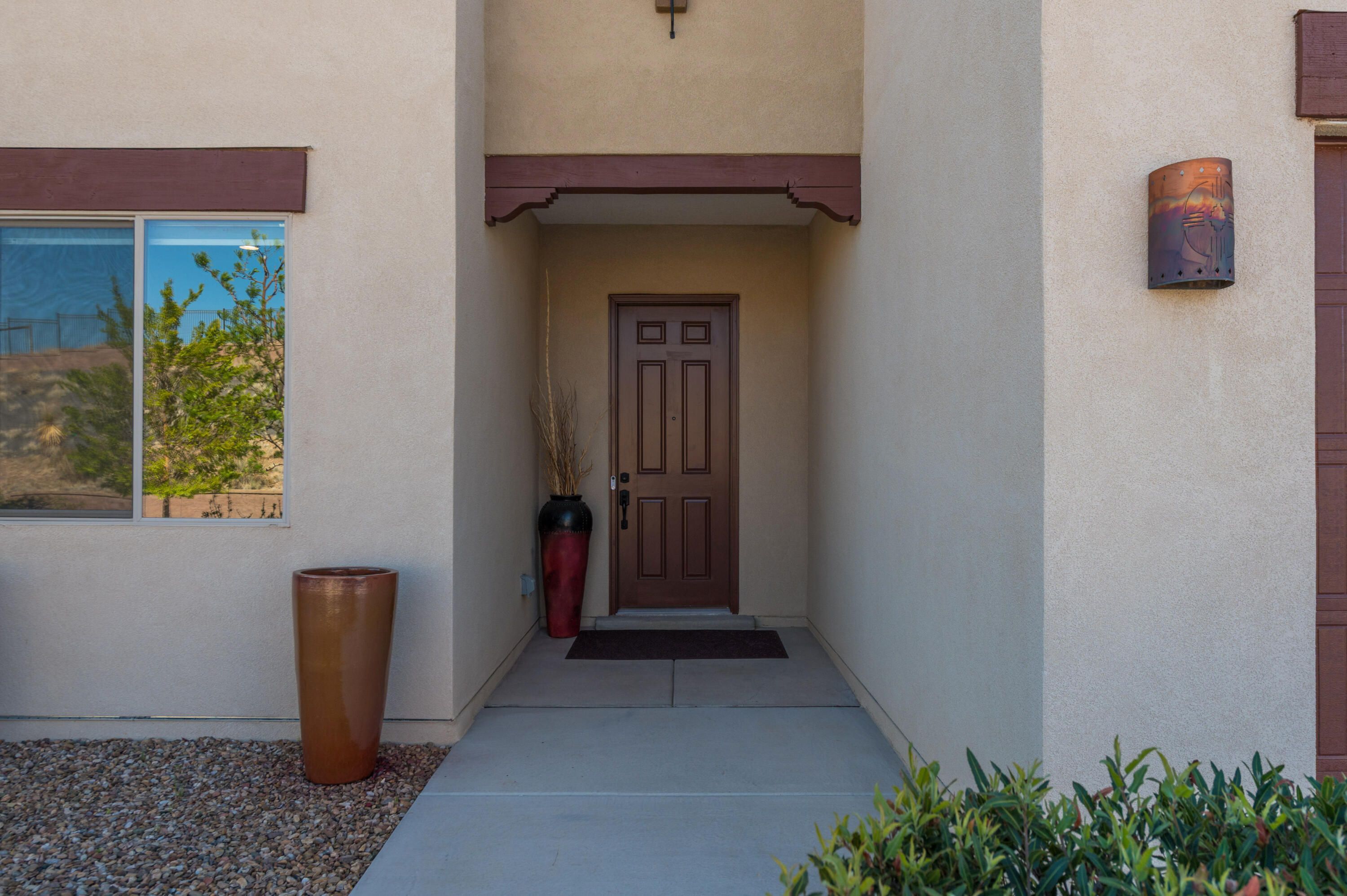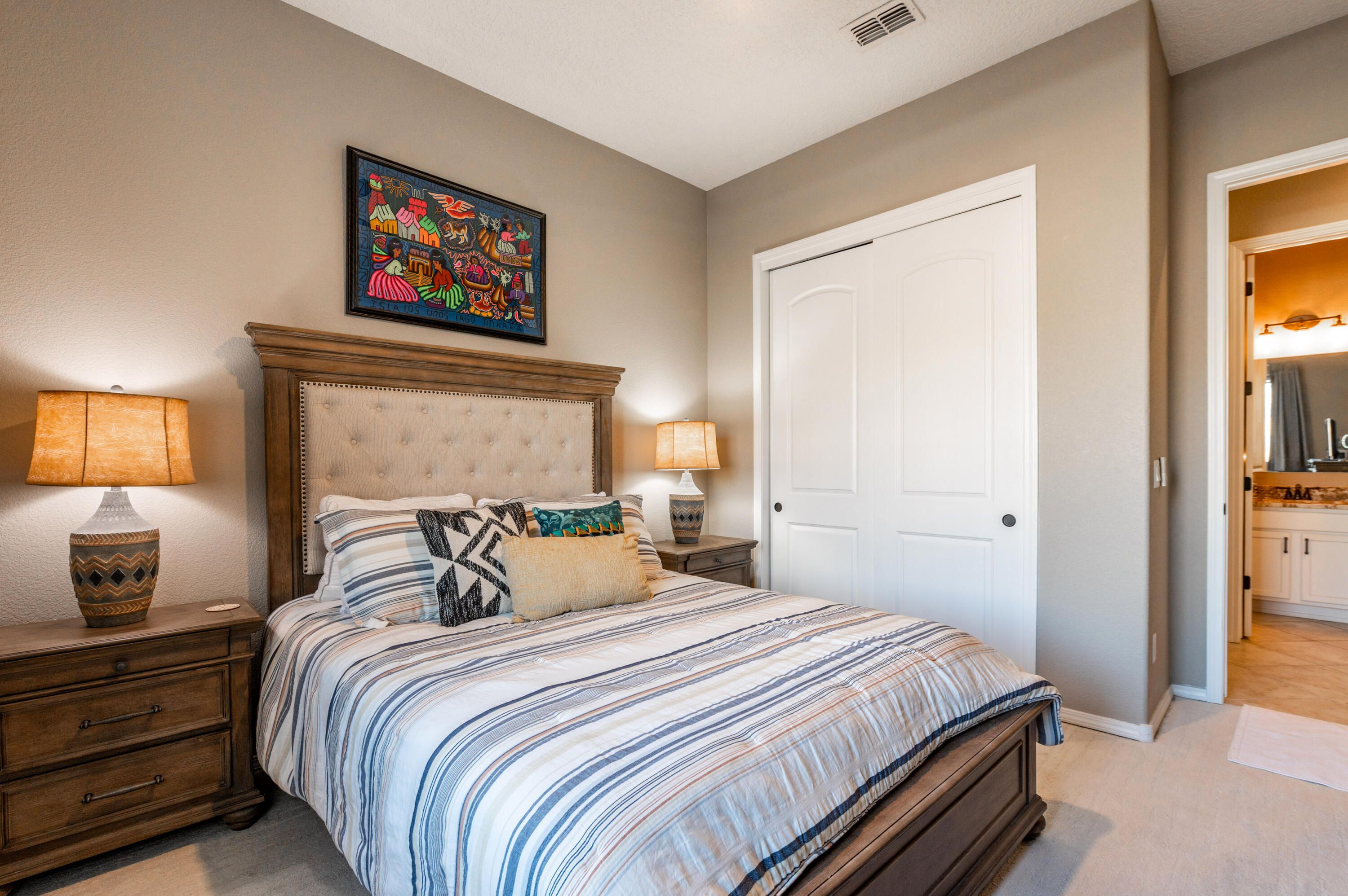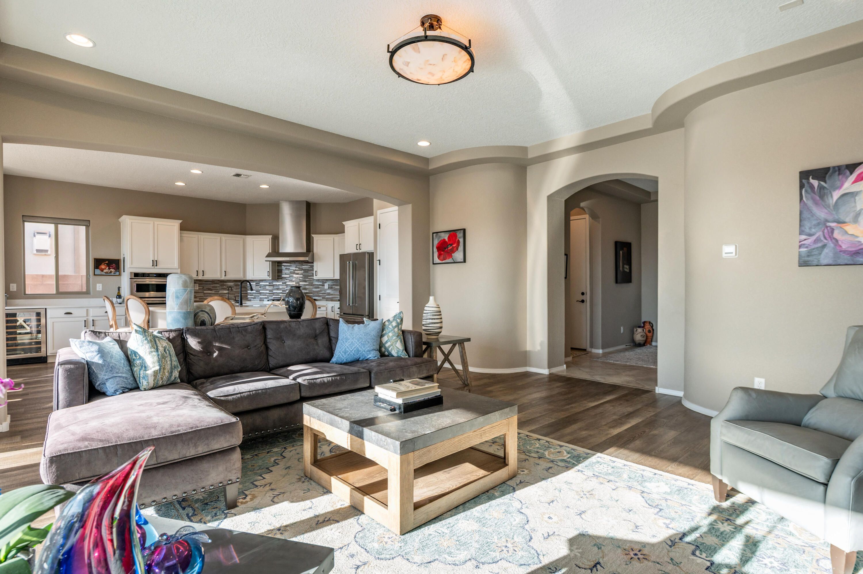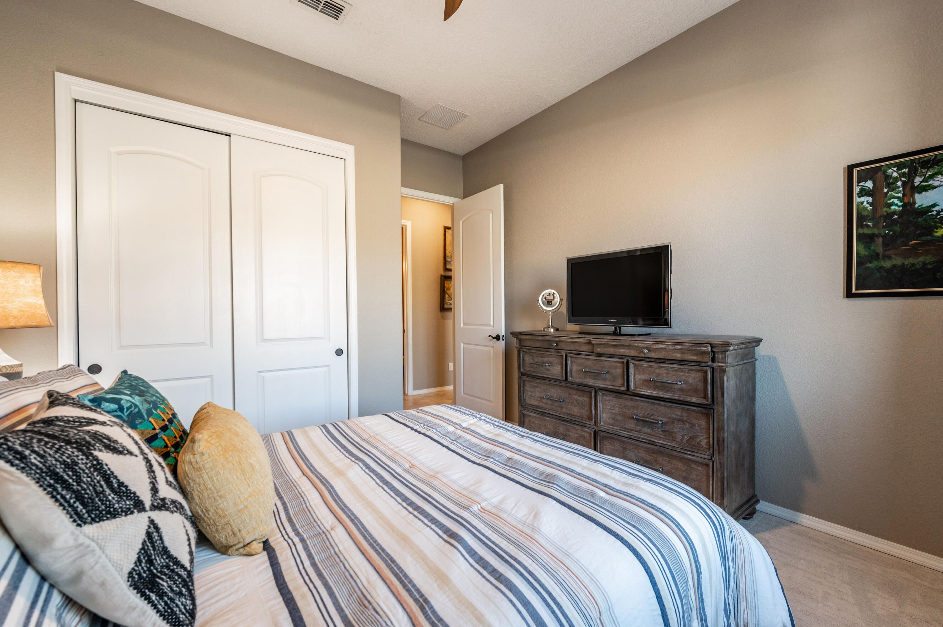 Beautiful Home with Forever Mountain and City Views in Albuquerque's Premier 55+ Active Adult Community, Del Webb Mirehaven! Built in 2020 this Pursuit Model Floorplan has 2137sf which includes a heated/cooled garage storage room, 2 BR's, 2 BA's, plus office/den or optional 3rd BR! Features include a large sliding door showcasing the views, soft arch hallways, tray ceilings, gourmet kitchen w/quartz countertops, pull-out cabinets, two ovens, wet bar w/wine fridge, reverse osmosis, nice large Island. Stylish LVP flooring, tile & upgraded carpet in bedrooms. Spacious primary suite w/ tiled walk-in shower & custom closet. Laundry w/sink, soft water system & instant hot water. Custom landscaped backyard w/stacked stone built-in BBQ, pavers, turf & plantings! Custom window shades & coverings!!