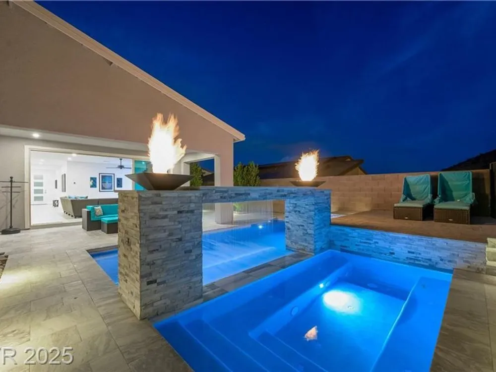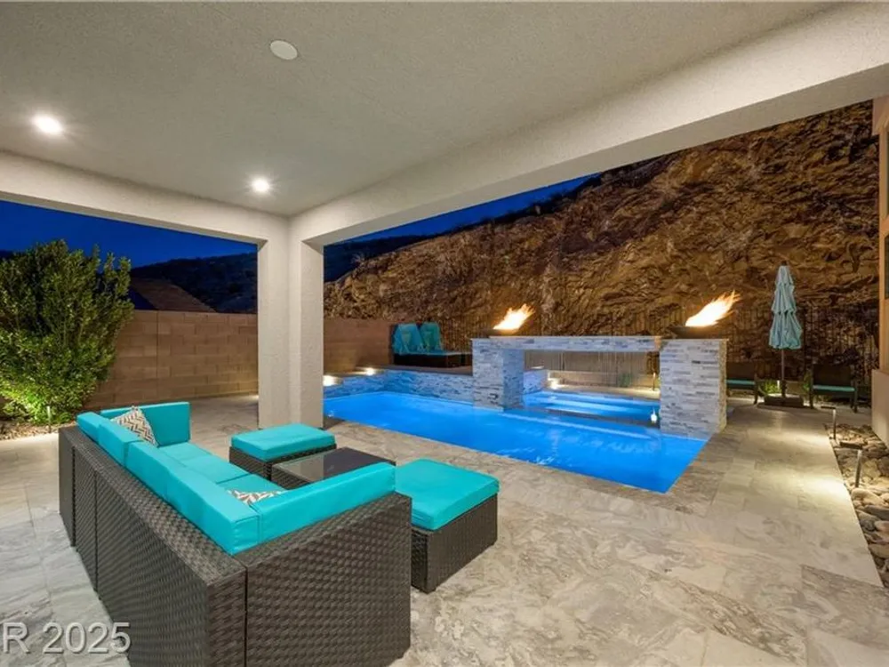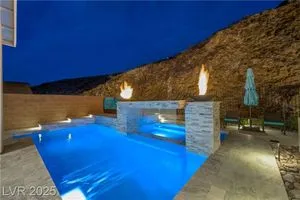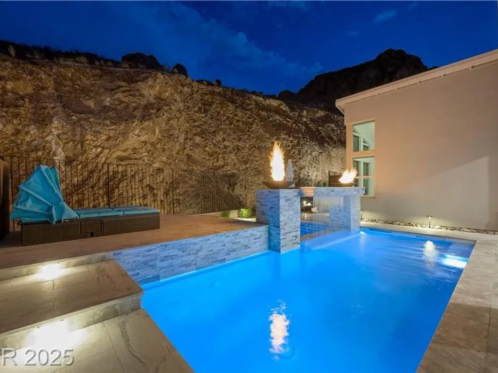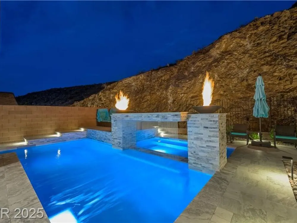 Tucked into the mountains in the exclusive Midnight Ridge community. Barely lived in and in like-new condition, the private backyard feels like your own retreat, featuring white travertine decking, a sparkling pool and spa with waterfall wall, bubble rock fountain, and two dramatic fire bowls. A covered patio completes the space. Upgraded lighting enhances every room with pendants above the kitchen island, under-counter lighting, chandeliers, and recessed can lights. The kitchen is beautifully appointed with GE Profile appliances, granite countertops, and custom cabinetry.Details include modern window shades, a barn door in the primary suite leading into a spa-like bath with a large walk-in rain shower. A large laundry room with sink and cabinetry, a tankless hot water heater, and four ceiling fans add everyday convenience.Tucked against the mountains just 10 minutes from Whole Foods, Target, Sprouts, and the premier shopping and dining at The District.