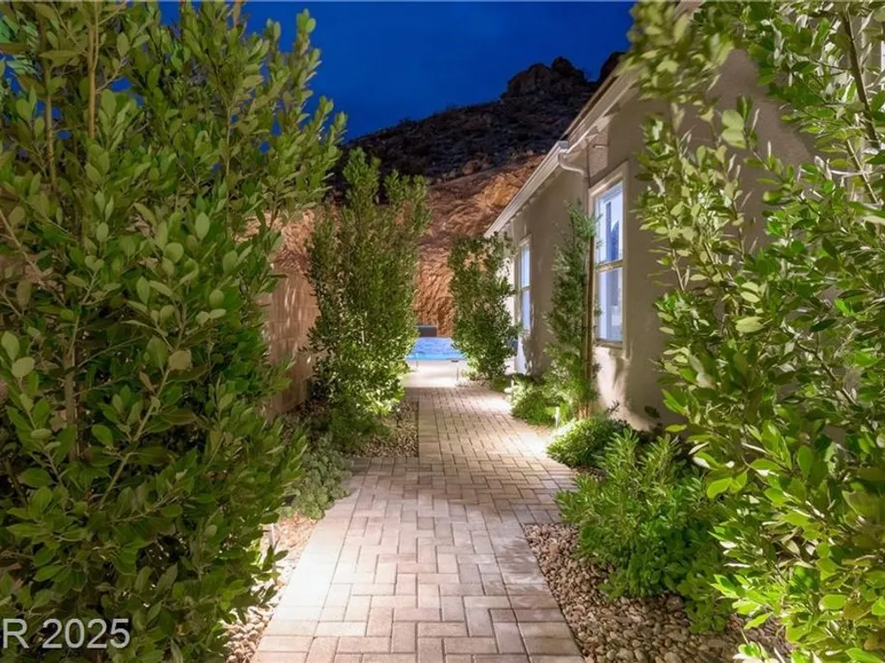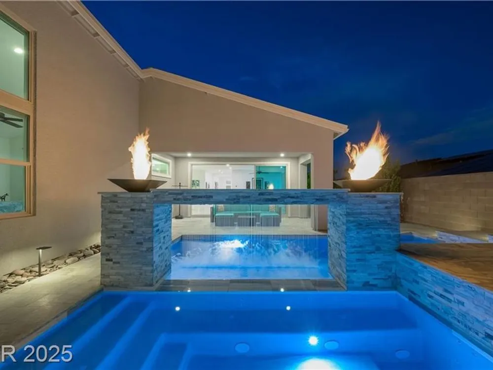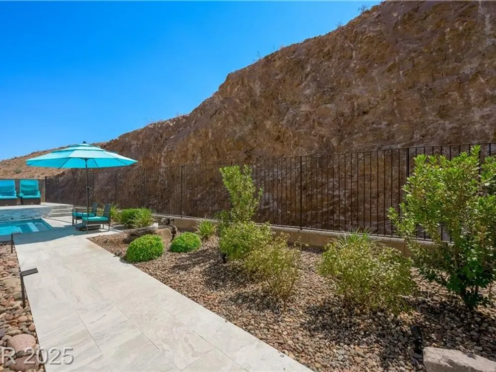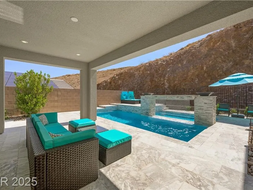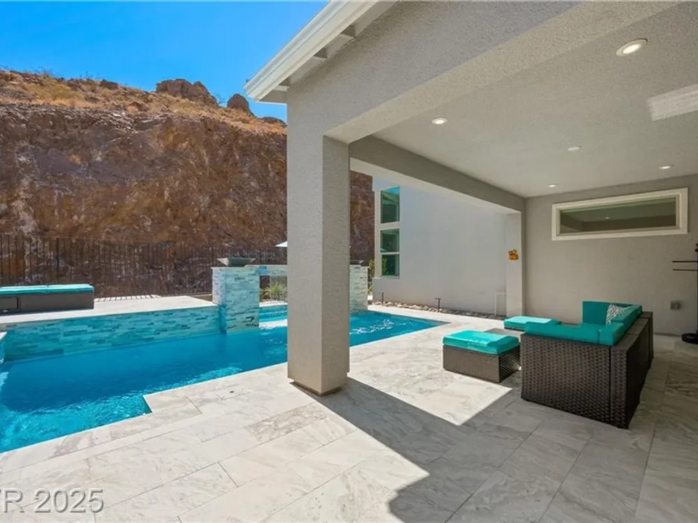 Tucked into the mountains in the exclusive Midnight Ridge community. Barely lived in and in like-new condition, the private backyard feels like your own retreat, featuring white travertine decking, a sparkling pool and spa with waterfall wall, bubble rock fountain, and two dramatic fire bowls. A covered patio completes the space. Upgraded lighting enhances every room with pendants above the kitchen island, under-counter lighting, chandeliers, and recessed can lights. The kitchen is beautifully appointed with GE Profile appliances, granite countertops, and custom cabinetry.Details include modern window shades, a barn door in the primary suite leading into a spa-like bath with a large walk-in rain shower. A large laundry room with sink and cabinetry, a tankless hot water heater, and four ceiling fans add everyday convenience.Tucked against the mountains just 10 minutes from Whole Foods, Target, Sprouts, and the premier shopping and dining at The District.
