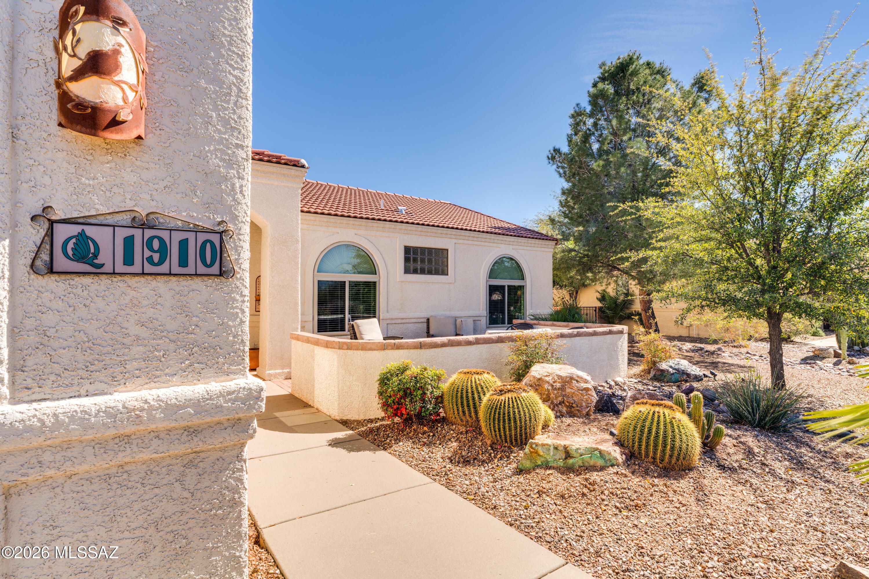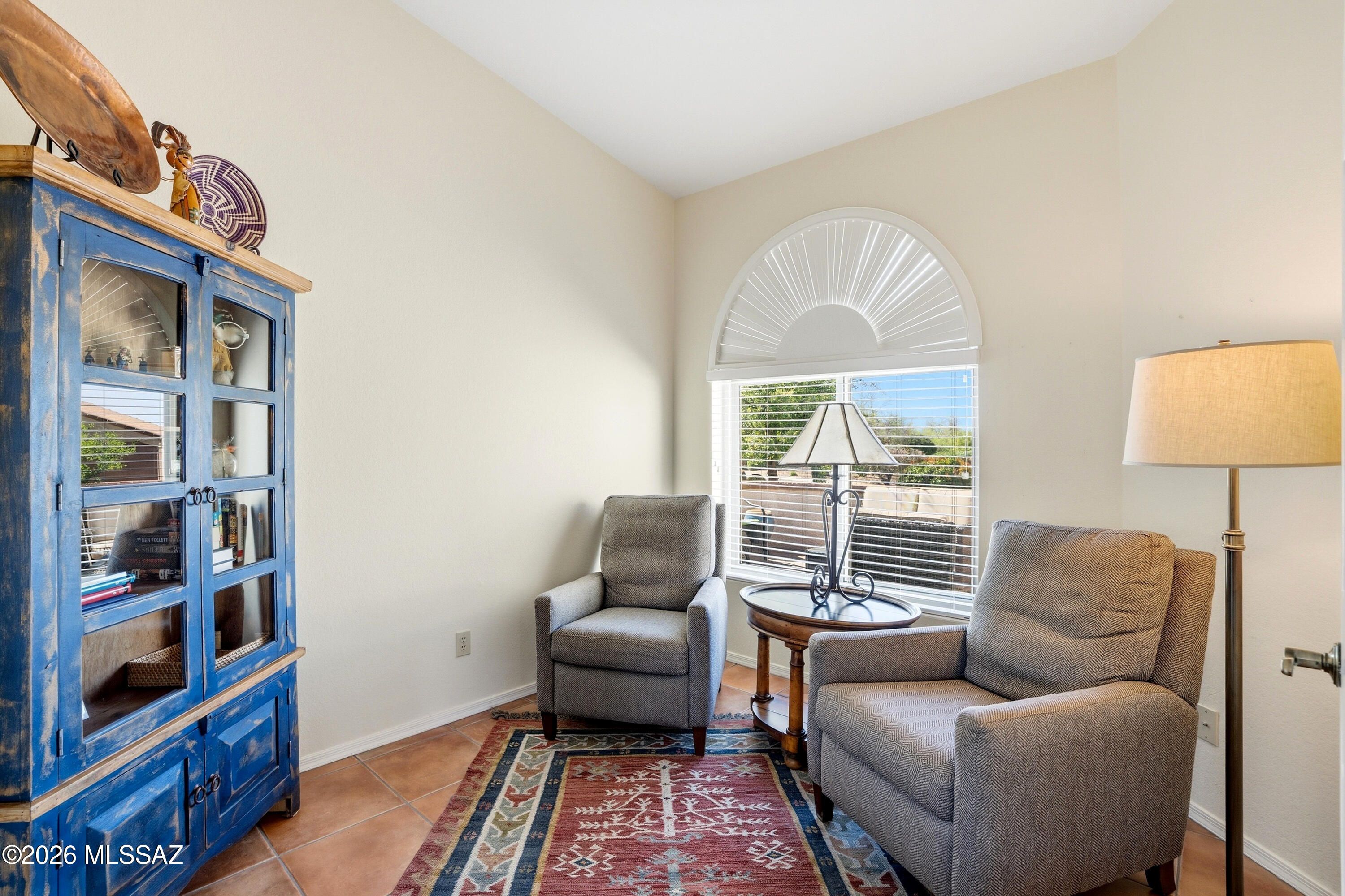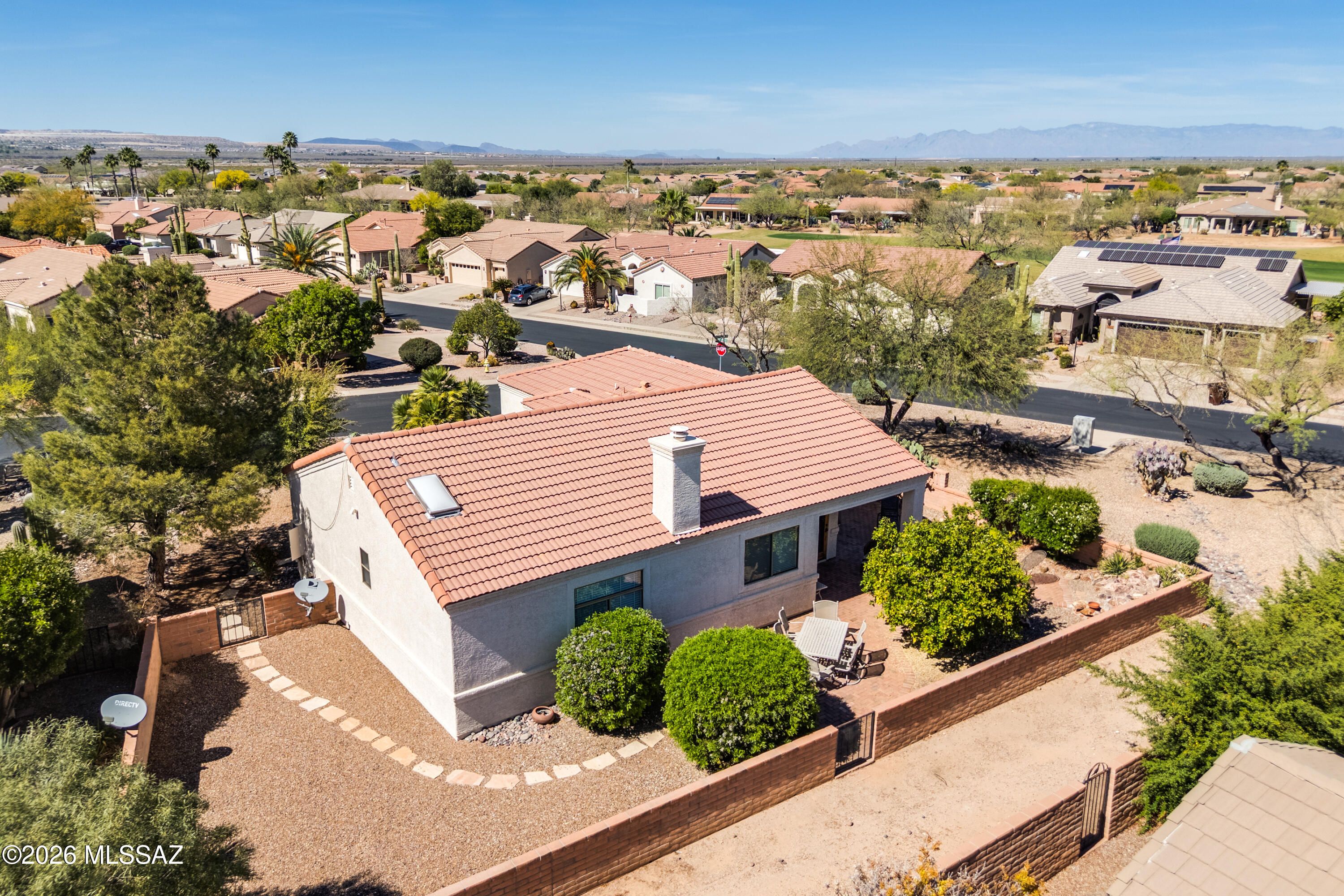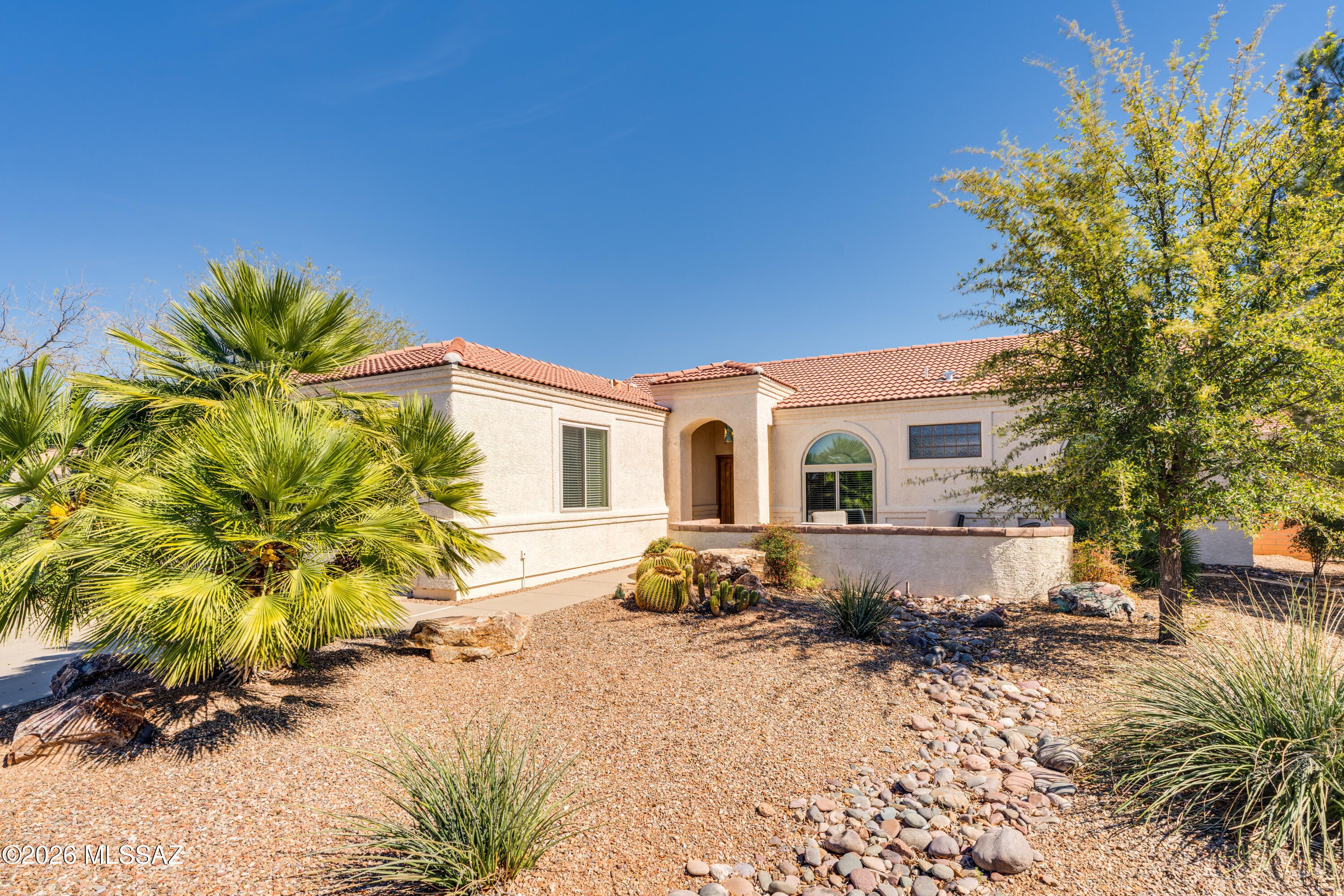 Charming Cactus Wren model in the Quail Creek resort community, built in 1996 and offering 1,510 sq.ft., 2 BR, 2 BA + Den, ideally situated on a desirable corner lot adjacent to a large common area for added privacy and open space. Enter through the inviting front paver courtyard into a bright living room featuring ceramic tile flooring, built-in entertainment center, and a cozy corner beehive gas fireplace. The dining area just off the kitchen comfortably accommodates six or more, perfect for everyday living or entertaining. Kitchen is updated with quartz countertops, breakfast bar, pantry cabinet, and ample storage. The owner's suite offers a walk-in closet and dual-vanity bath with an all-tile walk-in shower. The guest bedroom is adjacent to an updated bath with tile walk-in shower.
