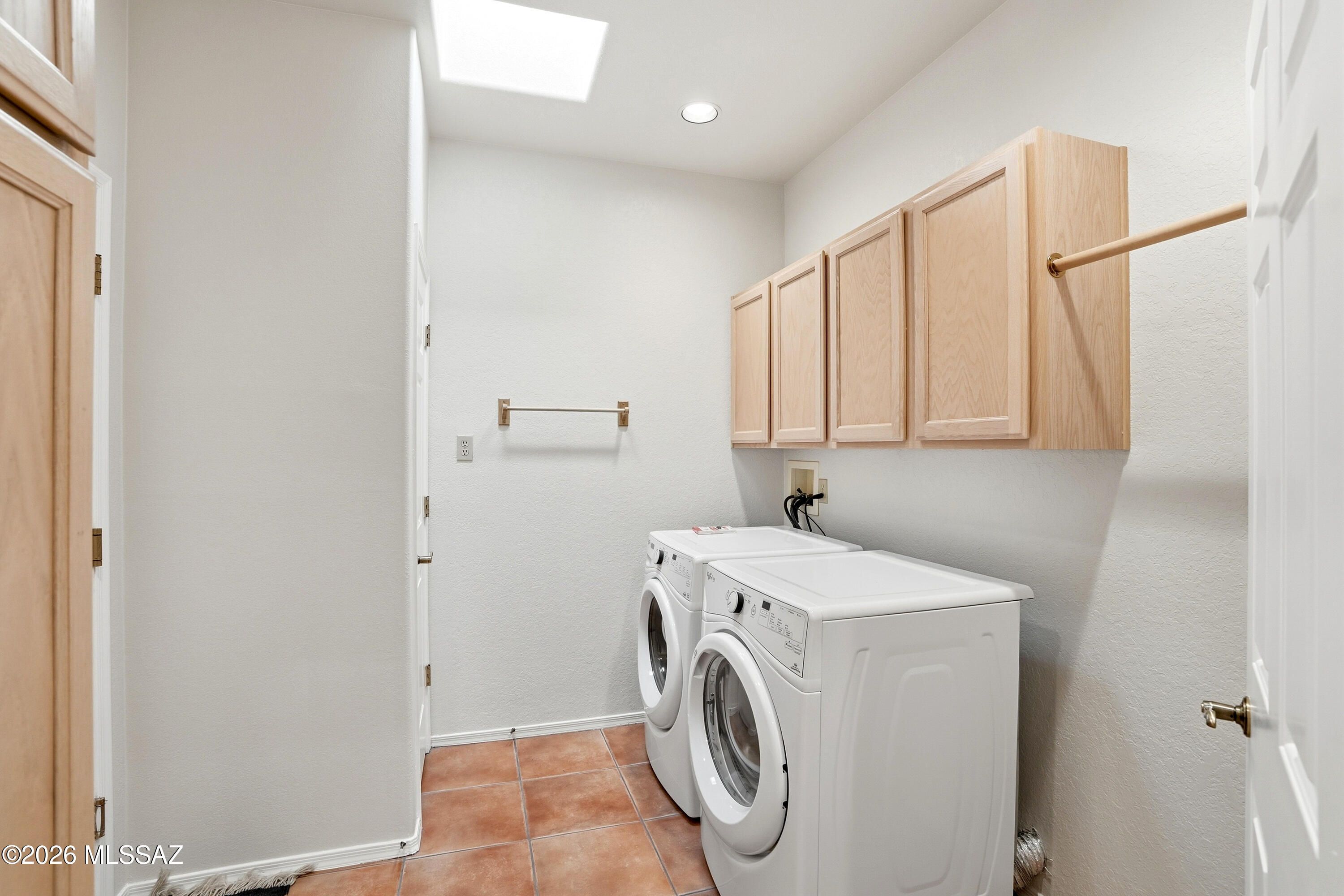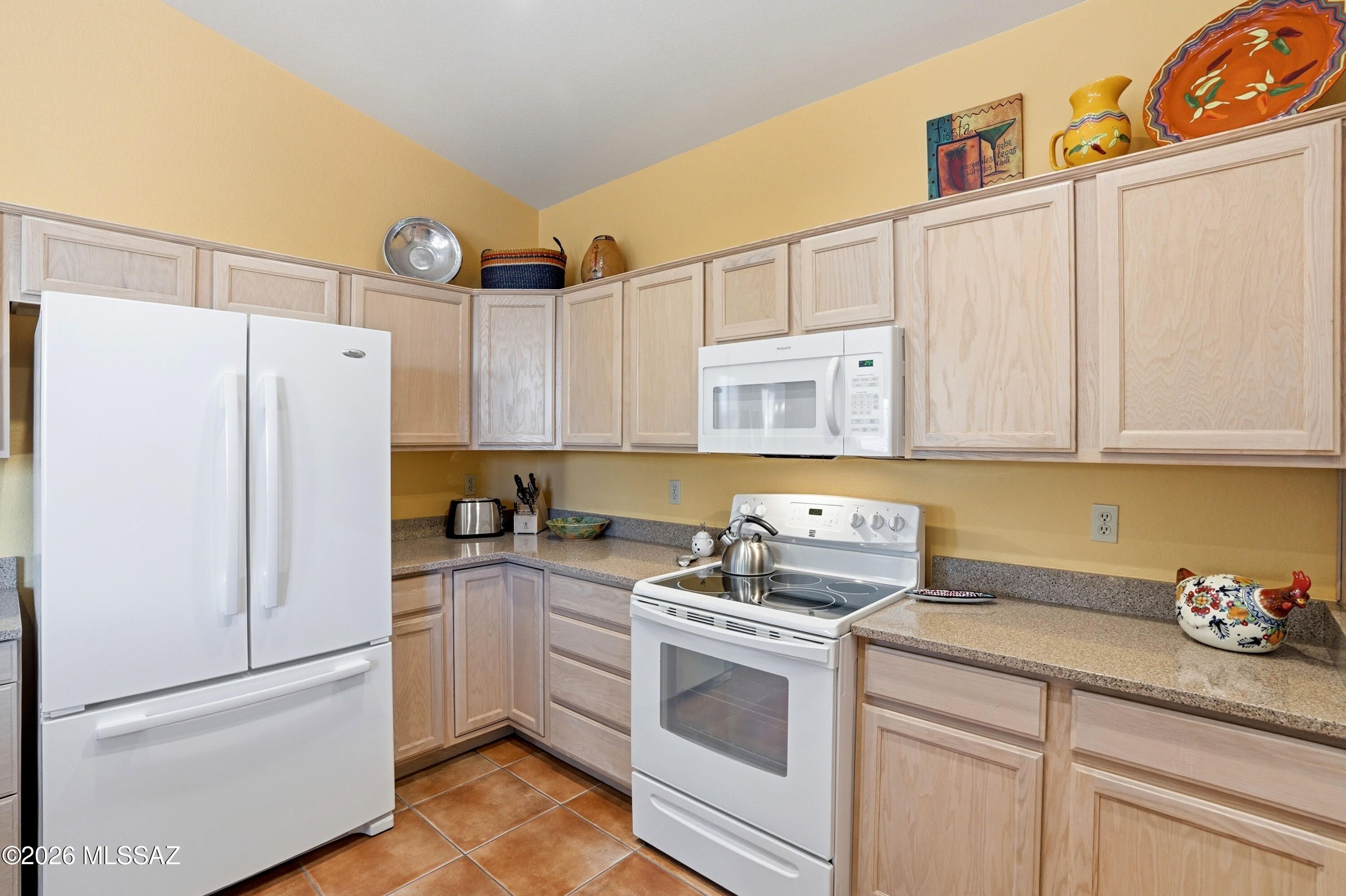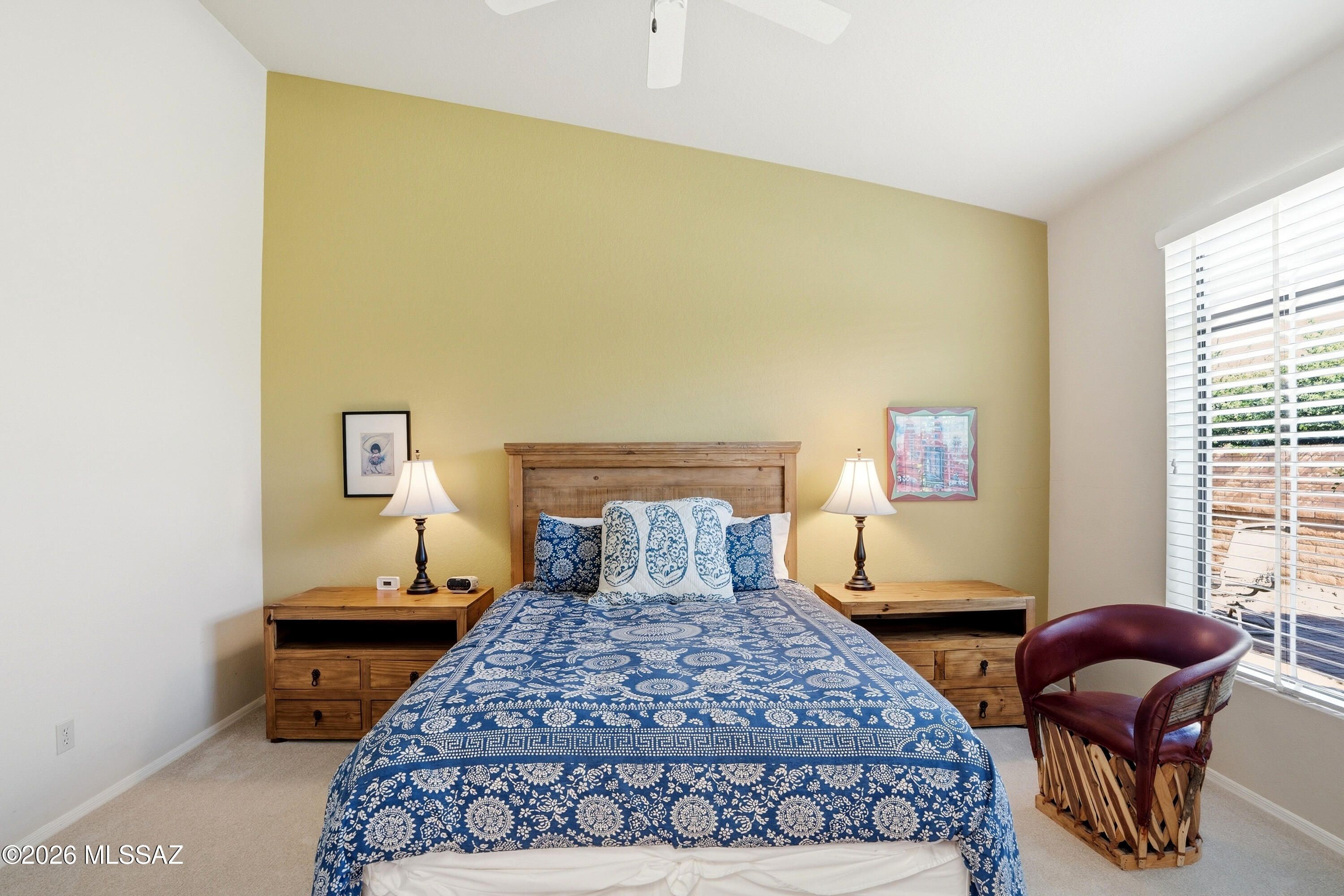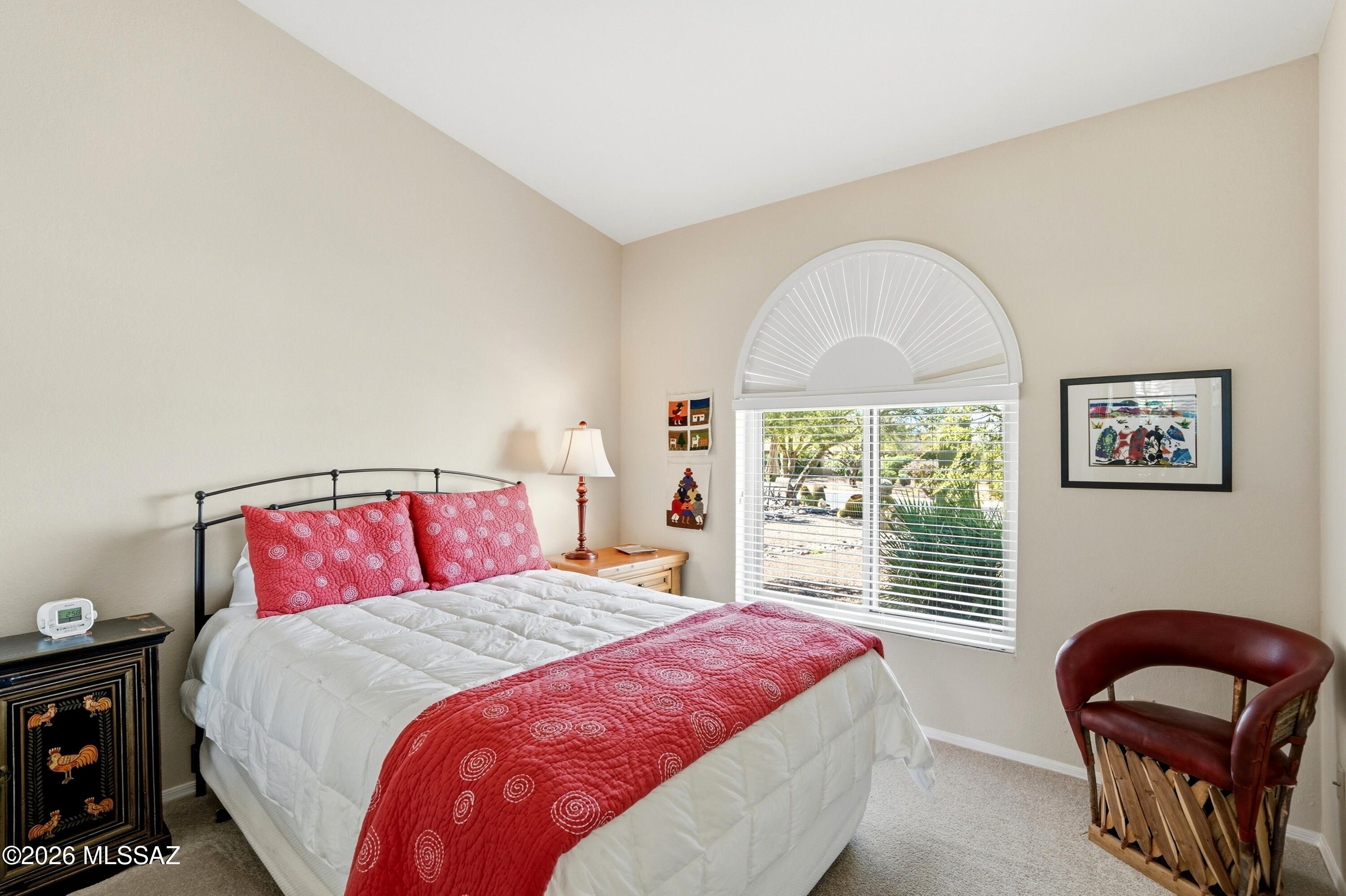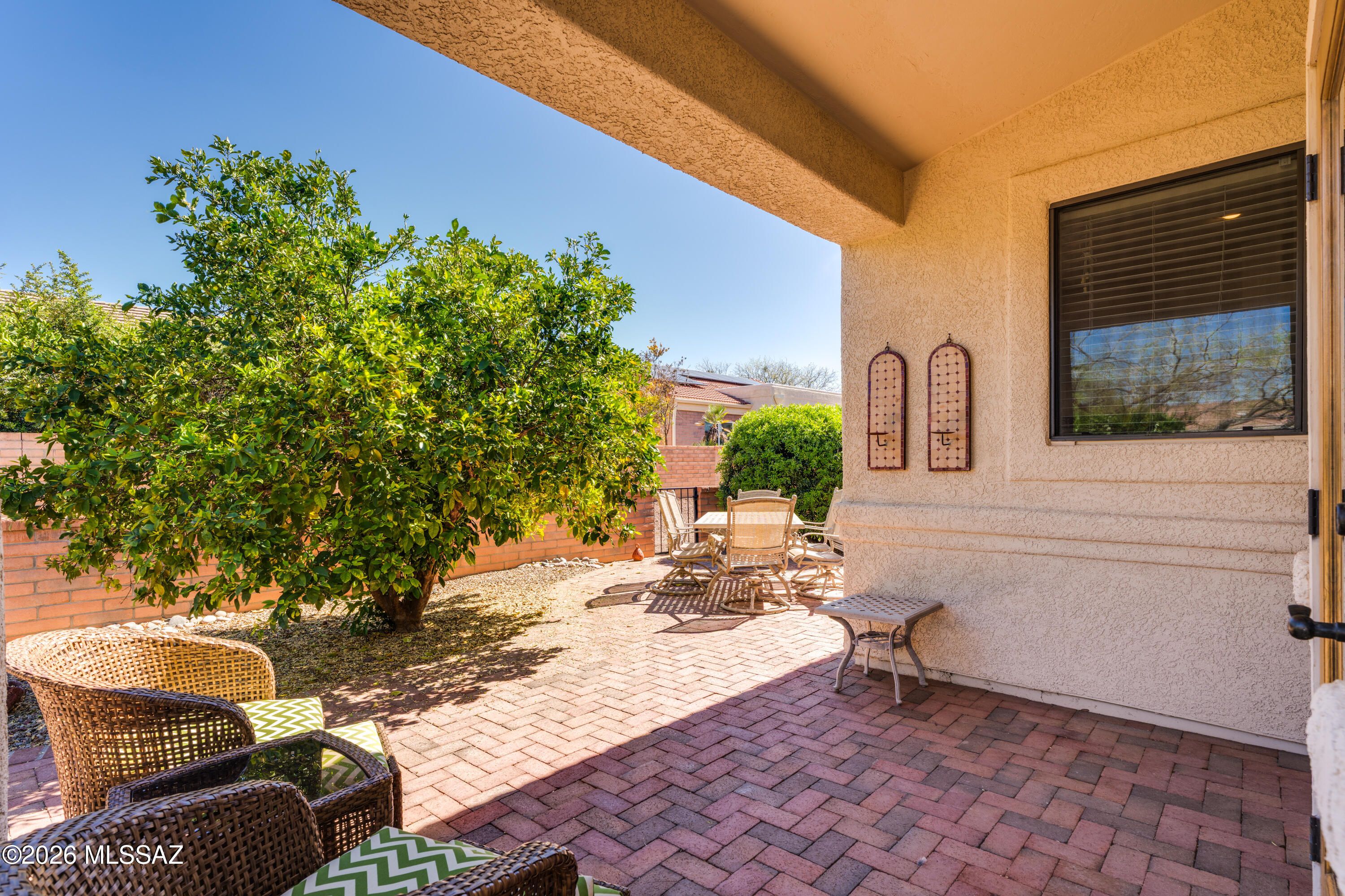 Charming Cactus Wren model in the Quail Creek resort community, built in 1996 and offering 1,510 sq.ft., 2 BR, 2 BA + Den, ideally situated on a desirable corner lot adjacent to a large common area for added privacy and open space. Enter through the inviting front paver courtyard into a bright living room featuring ceramic tile flooring, built-in entertainment center, and a cozy corner beehive gas fireplace. The dining area just off the kitchen comfortably accommodates six or more, perfect for everyday living or entertaining. Kitchen is updated with quartz countertops, breakfast bar, pantry cabinet, and ample storage. The owner's suite offers a walk-in closet and dual-vanity bath with an all-tile walk-in shower. The guest bedroom is adjacent to an updated bath with tile walk-in shower.