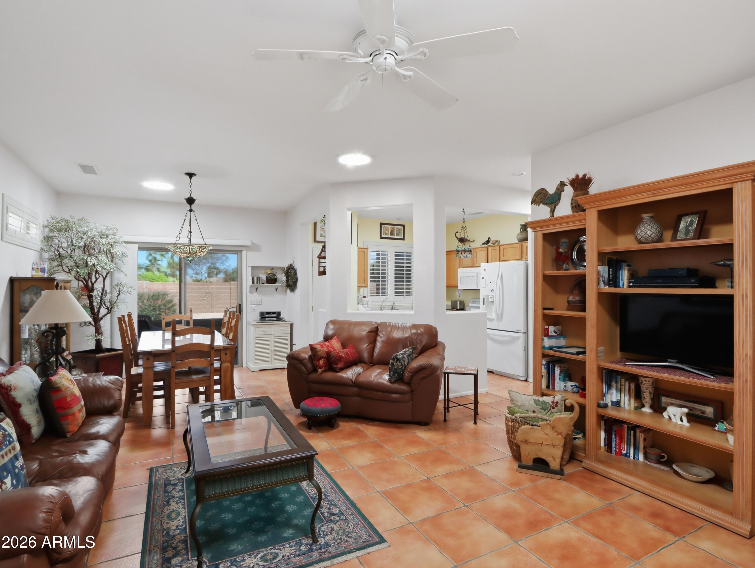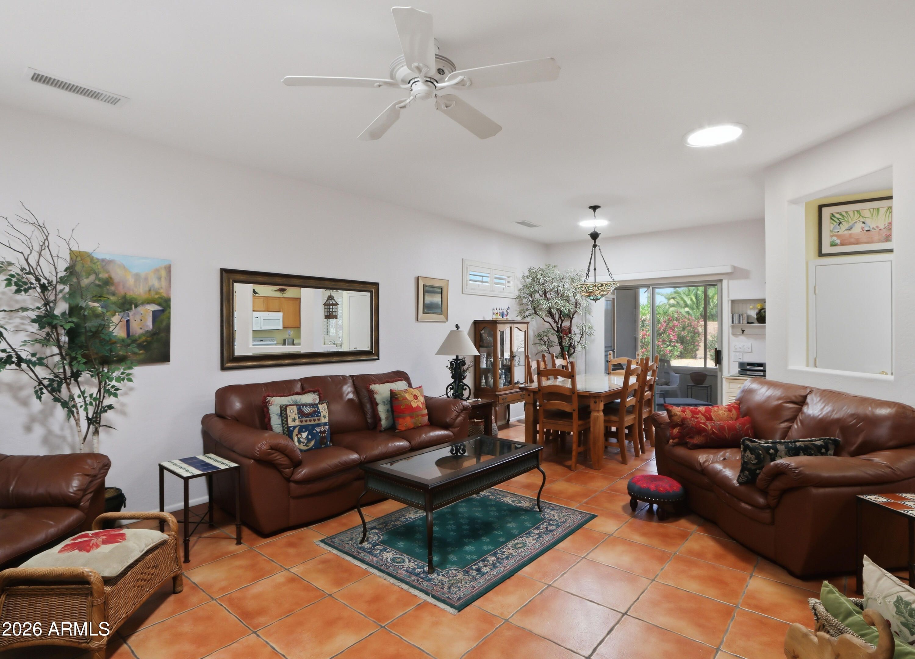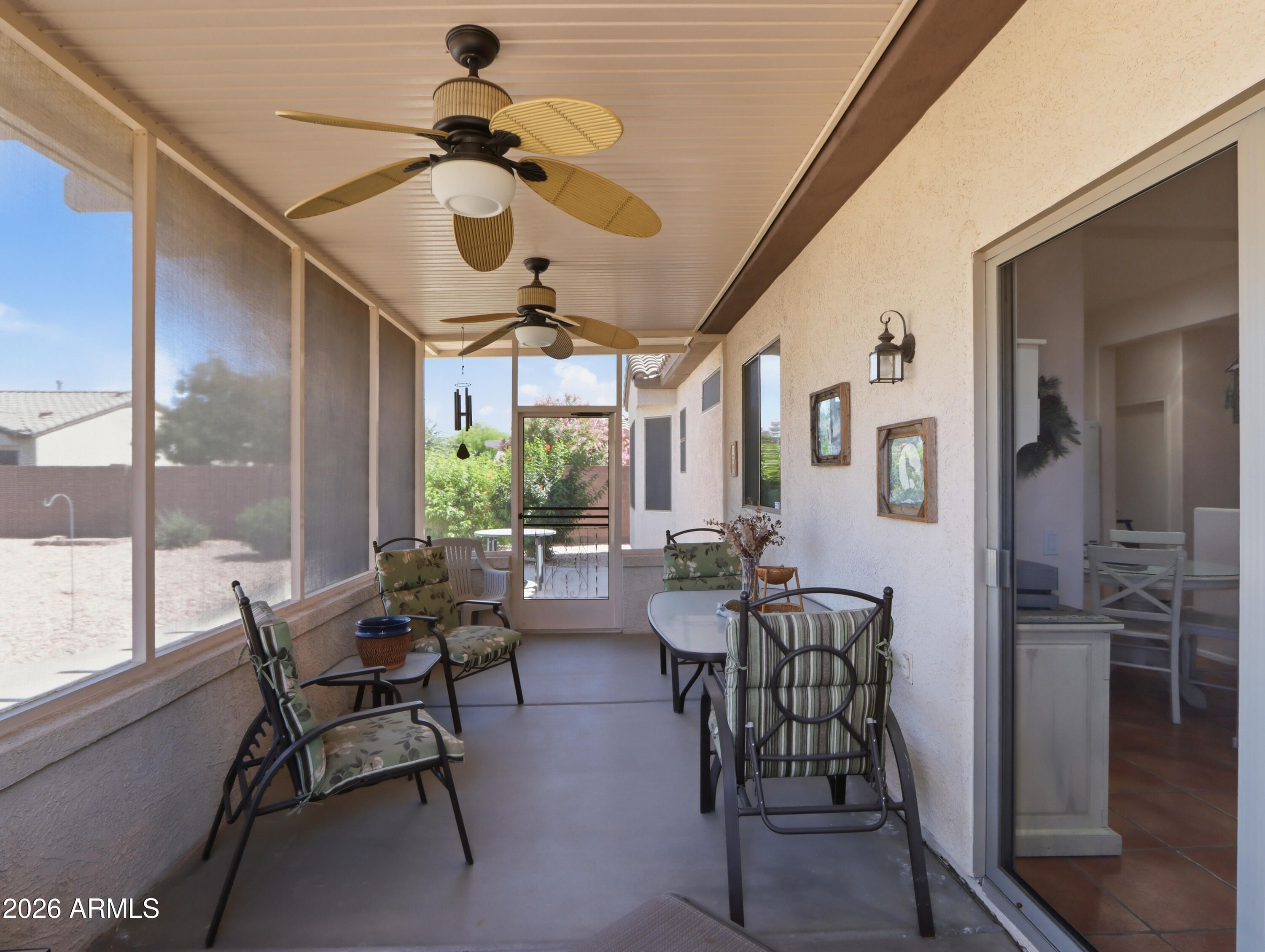 Welcome to your personal oasis! This beautifully maintained ''Golfer's Cottage'' offers the perfect blend of Southwestern charm and modern peace of mind. Nestled on a quiet street within a vibrant, amenity-rich community, this move-in-ready gem welcomes you with gorgeous saltillo tile floors, premium plantation shutters, and five solar tubes that bathe the home in abundant natural light. You can buy with ultimate confidence knowing the big-ticket items are handled: featuring a brand-new HVAC, newer interior and exterior paint, and inclusive newer appliances. Retreat to your primary suite showcasing a charming bay window, or step outside to the spacious, screened-in patio overlooking your private, walled backyard--the ultimate setting for morning coffee or entertaining friends.... Complete with a two-car garage (featuring built-in cabinets and a utility sink), energy-efficient 98% UV sunscreens, and custom heavy-duty security doors, this home is as secure and practical as it is beautiful. Enjoy world-class community golf, pools, fitness centers, and more right at your doorstep.
