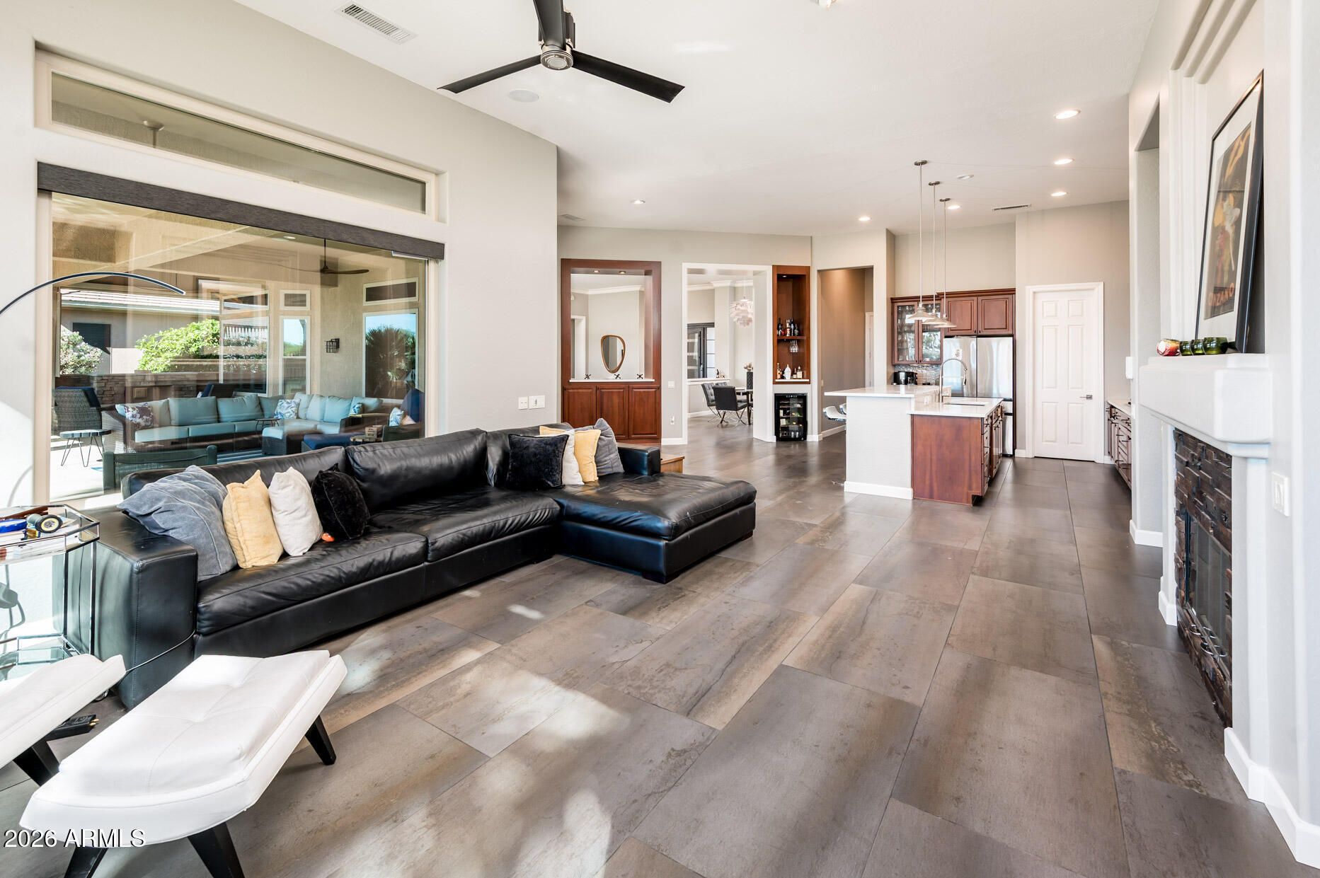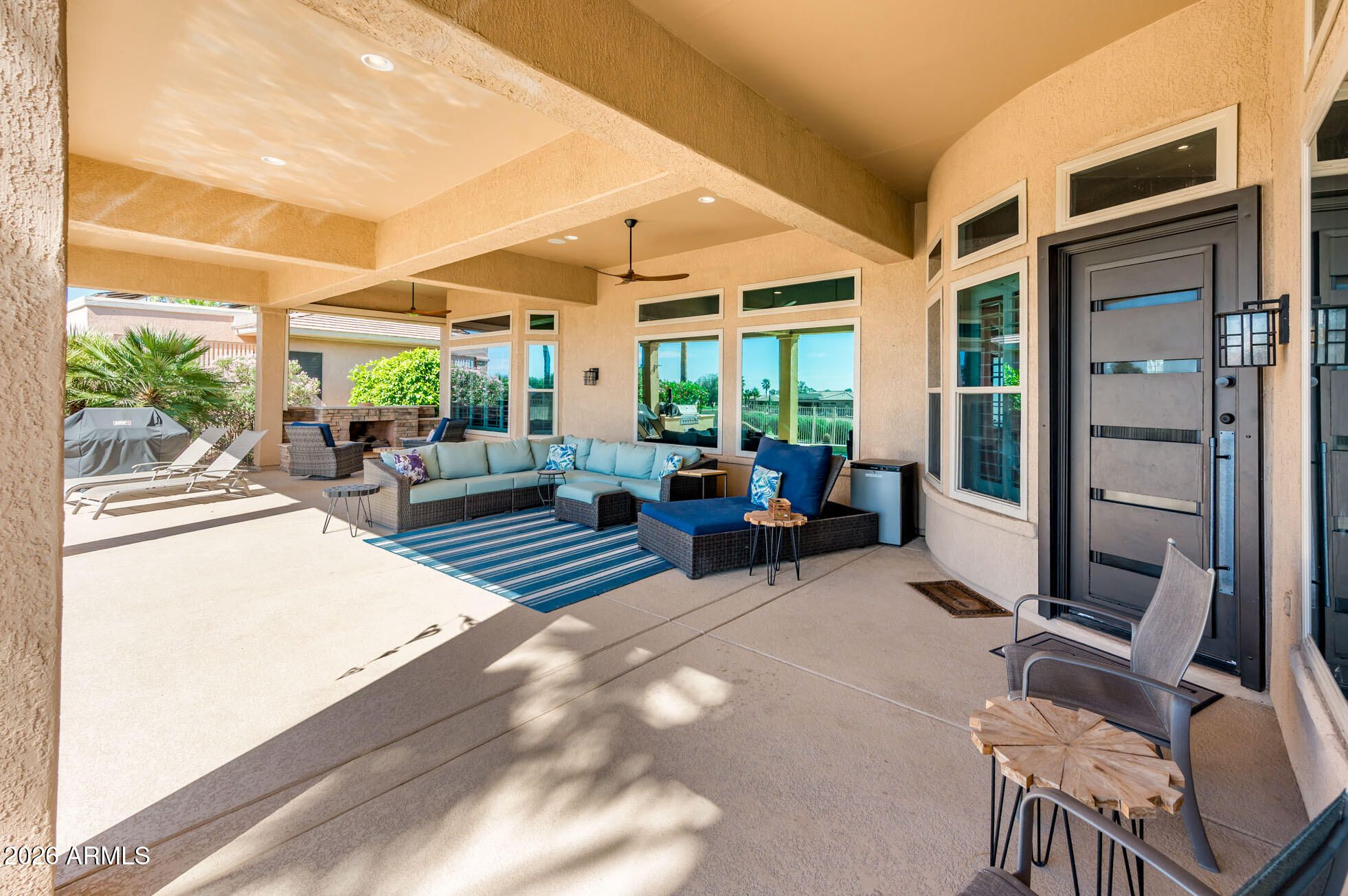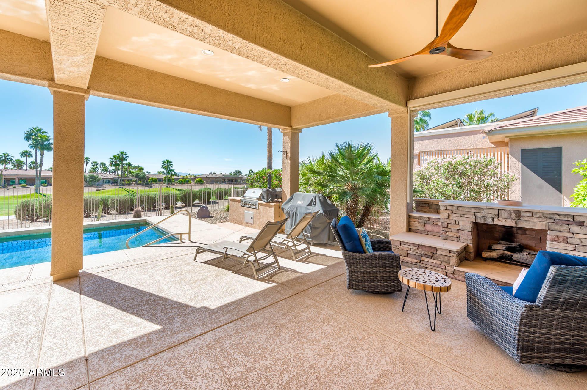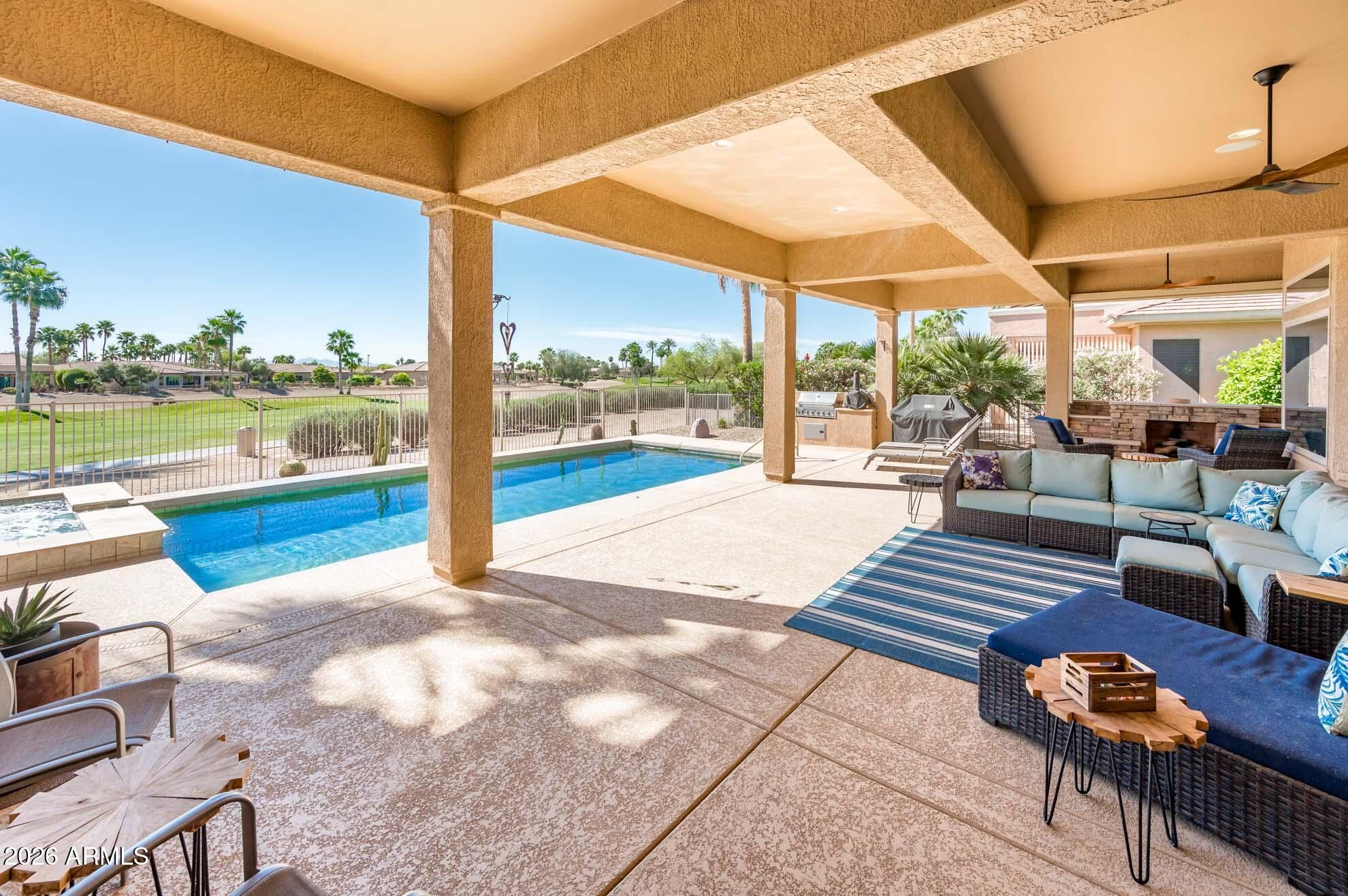 Sophisticated golf course living defines this beautifully reimagined 3,411 sq ft Windsor model overlooking Cimarron Golf Course in The Grand. A striking steel entry door opens to soaring 12' ceilings, new UV-rated windows, and remote window shades throughout. The expansive primary suite features an electric fireplace, dual California walk-in closets, and a spa-inspired bath with freestanding clawfoot tub, dual vanities, and oversized shower. The gourmet kitchen offers quartz surfaces, stainless steel appliances, gas cooking, and a walk-in pantry, flowing seamlessly into elegant living spaces designed for entertaining. A steel patio door opens to a resort-style backyard with pool, spa, built-in BBQ, gas fireplace, expansive covered patio, and sweeping golf course views.