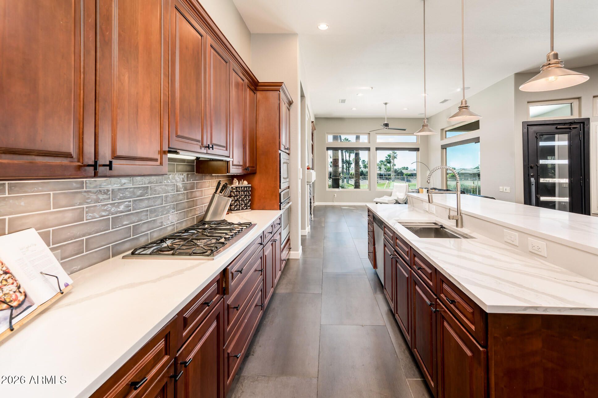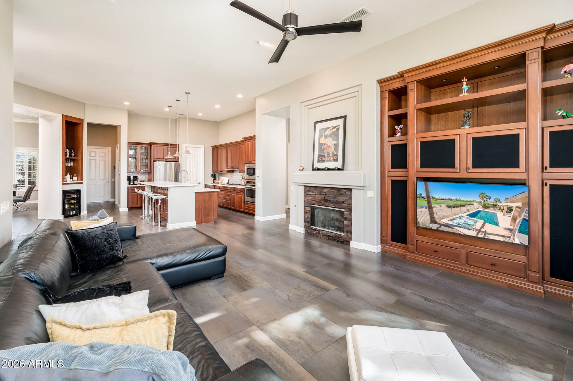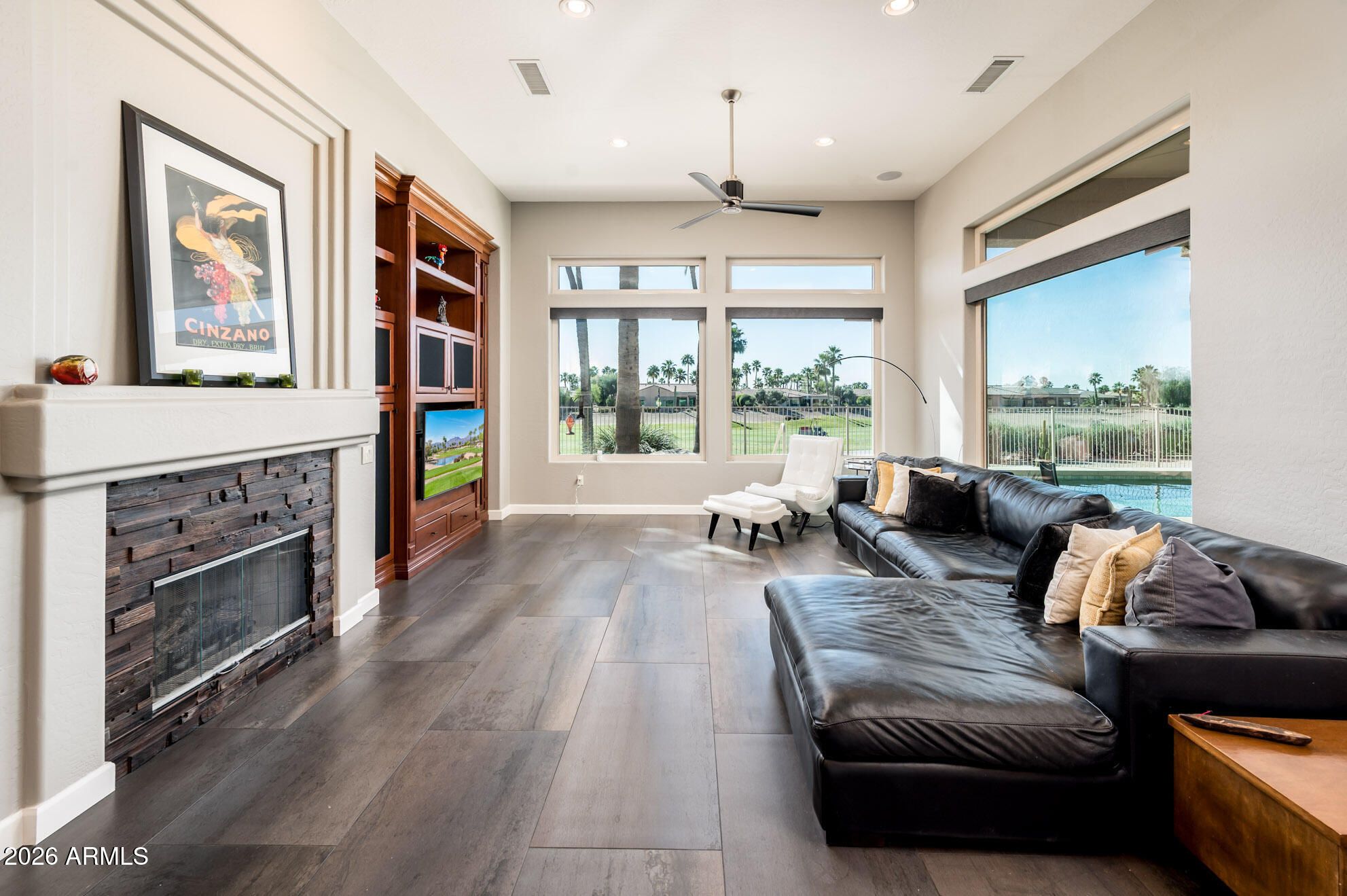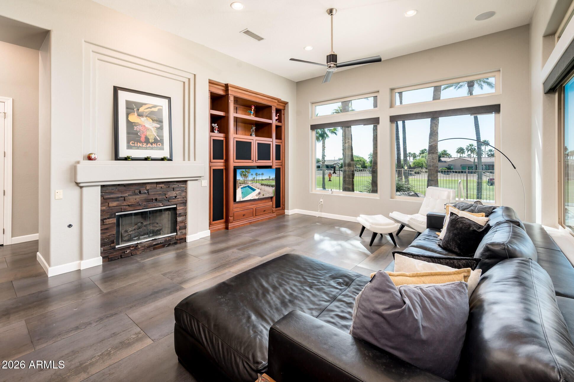 Sophisticated golf course living defines this beautifully reimagined 3,411 sq ft Windsor model overlooking Cimarron Golf Course in The Grand. A striking steel entry door opens to soaring 12' ceilings, new UV-rated windows, and remote window shades throughout. The expansive primary suite features an electric fireplace, dual California walk-in closets, and a spa-inspired bath with freestanding clawfoot tub, dual vanities, and oversized shower. The gourmet kitchen offers quartz surfaces, stainless steel appliances, gas cooking, and a walk-in pantry, flowing seamlessly into elegant living spaces designed for entertaining. A steel patio door opens to a resort-style backyard with pool, spa, built-in BBQ, gas fireplace, expansive covered patio, and sweeping golf course views.