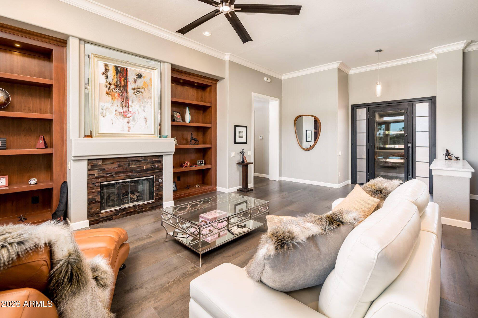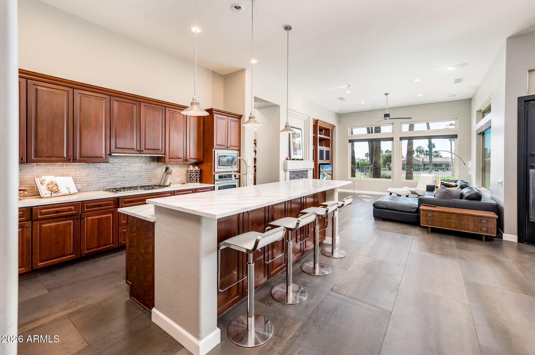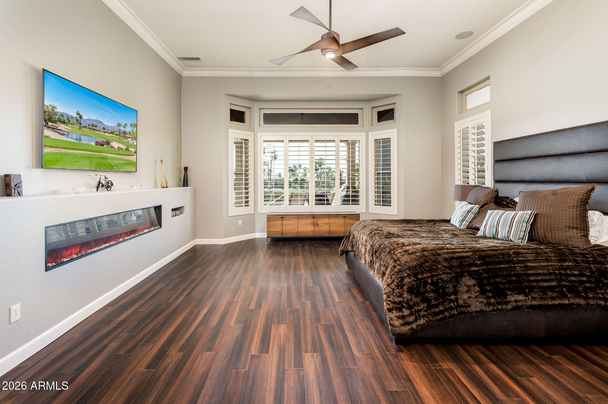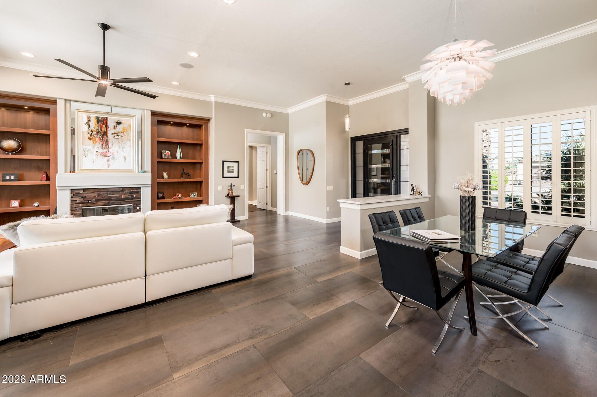 Sophisticated golf course living defines this beautifully reimagined 3,411 sq ft Windsor model overlooking Cimarron Golf Course in The Grand. A striking steel entry door opens to soaring 12' ceilings, new UV-rated windows, and remote window shades throughout. The expansive primary suite features an electric fireplace, dual California walk-in closets, and a spa-inspired bath with freestanding clawfoot tub, dual vanities, and oversized shower. The gourmet kitchen offers quartz surfaces, stainless steel appliances, gas cooking, and a walk-in pantry, flowing seamlessly into elegant living spaces designed for entertaining. A steel patio door opens to a resort-style backyard with pool, spa, built-in BBQ, gas fireplace, expansive covered patio, and sweeping golf course views.