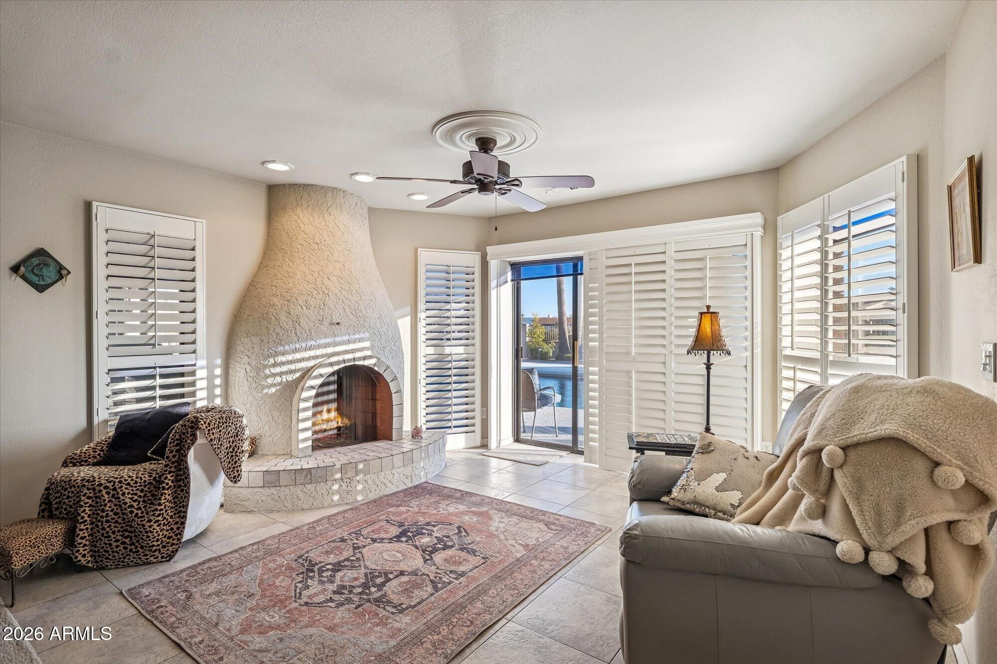 Resort-Style Desert Retreat in Rio Verde - An incredible home just off the 15th tee Quail Run Golf Course on a coveted 1/2 acre corner lot. Expansive mountain views and effortless indoor-outdoor living. Vaulted ceilings and sun-filled living spaces flow into a chef's kitchen with skylights and butler's pantry. Private primary suite features a fireplace, spa-style bath, and direct backyard access. Outdoor oasis includes a heated pool, covered patios, ramada, and fire features—ideal for relaxing or entertaining. Refined desert living in a peaceful, upscale community.