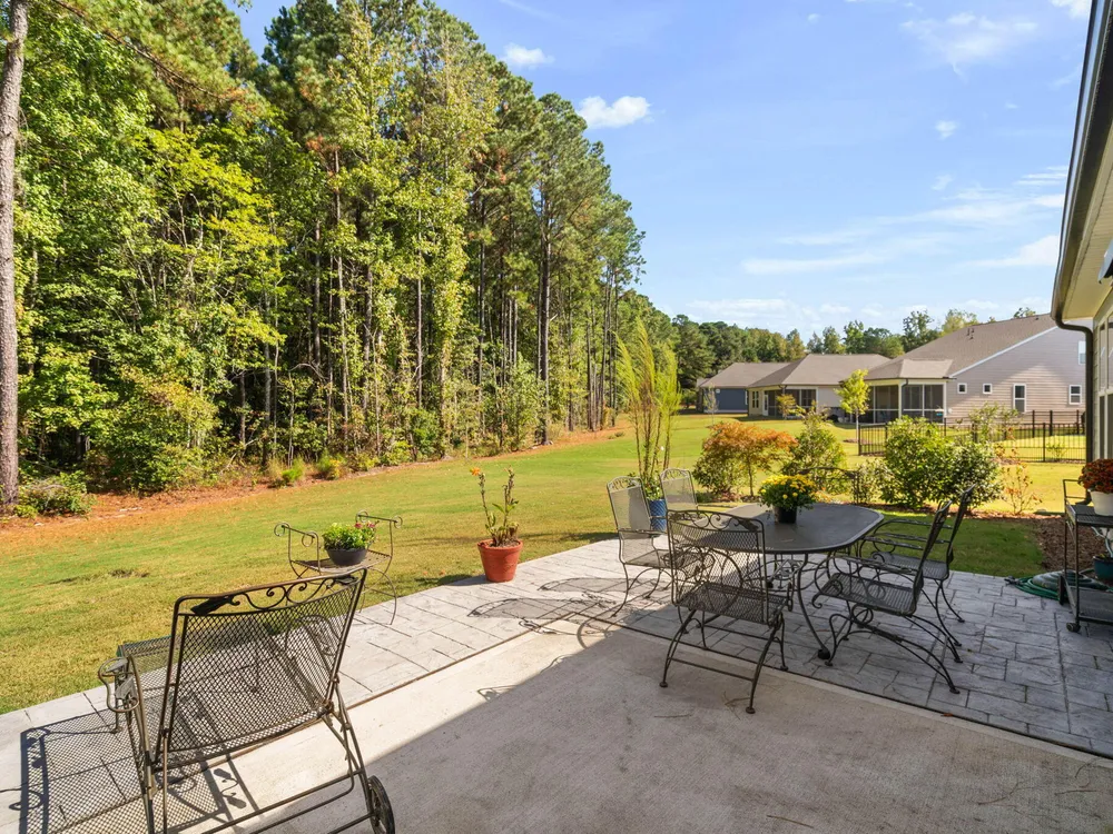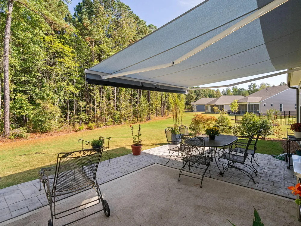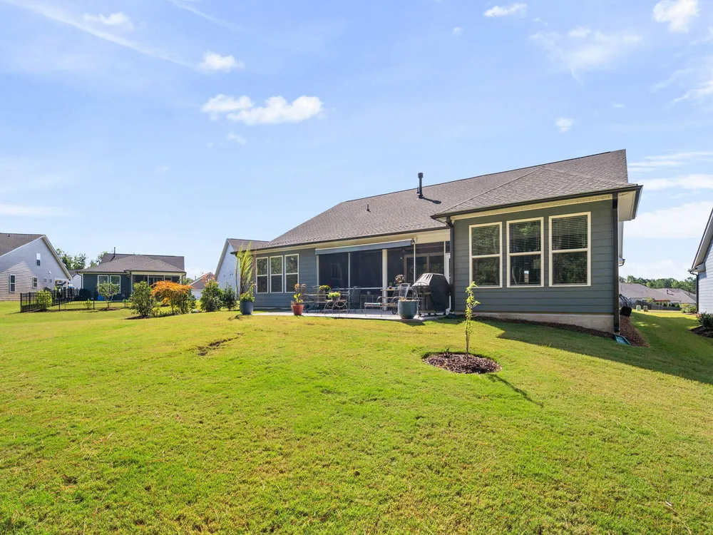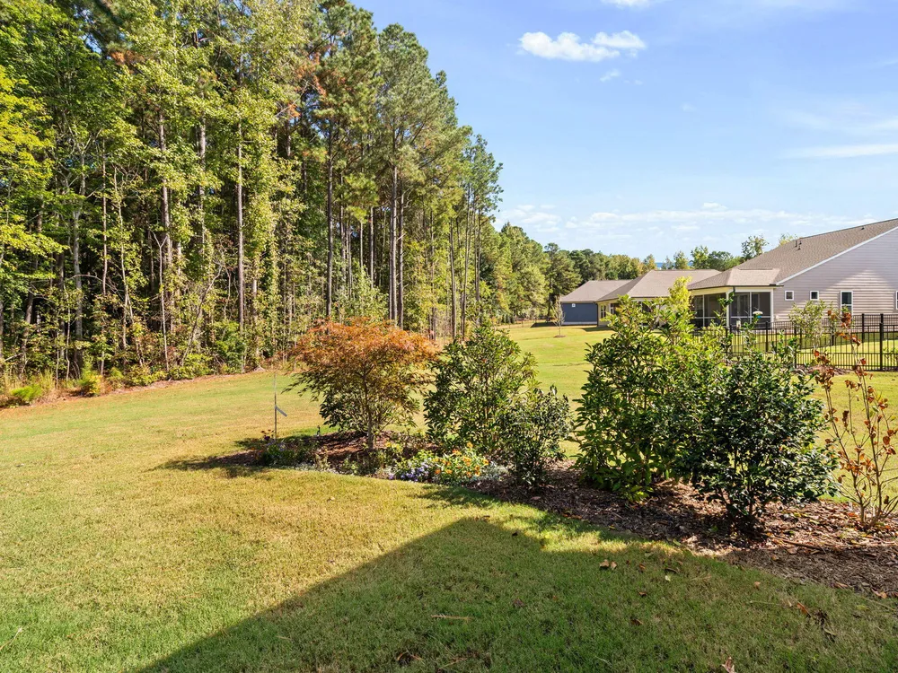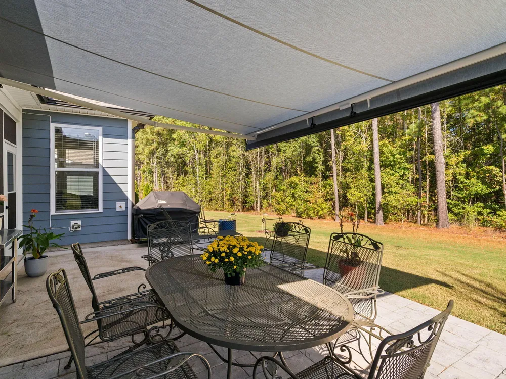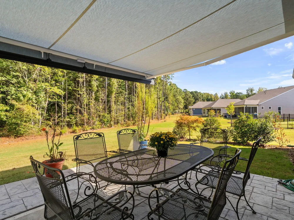 Located in the desirable 55+ community of Carolina Gardens by Del Webb, this beautifully appointed Stellar plan offers a refined blend of comfort and style. The gourmet kitchen features quartz countertops, soft-close cabinetry, double ovens, a gas cooktop, and a spacious pantry. The open design includes wider walkways, a bright sunroom that provides excellent flex space, and a great room ideal for everyday living. The primary suite offers natural light, wooded views, a zero-entry shower with seat and grab bars, and a large custom walk-in closet. Two additional bedrooms, each with access to a full bath, plus a dedicated office, allow for privacy and flexibility. Enjoy outdoor living on the screened porch or extended patio, featuring a remote-controlled Marygrove retractable awning with integrated lighting. Thoughtful landscaping enhances privacy along the back patio, creating a peaceful setting for relaxation or entertaining. The 3-car garage provides additional space for a golf cart, workshop, or storage, and a 17-zone underground sprinkler system helps maintain the lush landscaping year-round. Conveniently situated near both downtown Fuquay and Varina, with easy access to local shops, dining, Raleigh, and RDU. Carolina Gardens amenities support an active, resort-style 55+ lifestyle: a stunning 20,500 sq. ft. clubhouse with multi-purpose rooms, community kitchen/café and ample gathering spaces; a fitness center with aerobics studio; indoor and outdoor pools plus a hot tub; four pickleball courts and a tennis court; community gardens, lush parks and a dog park; and an on-site lifestyle director who organizes events, classes and activities. Age rule: at least one resident must be 55 or older; children aged 19+ may be permanent residents provided the community's 55+ requirement is met.